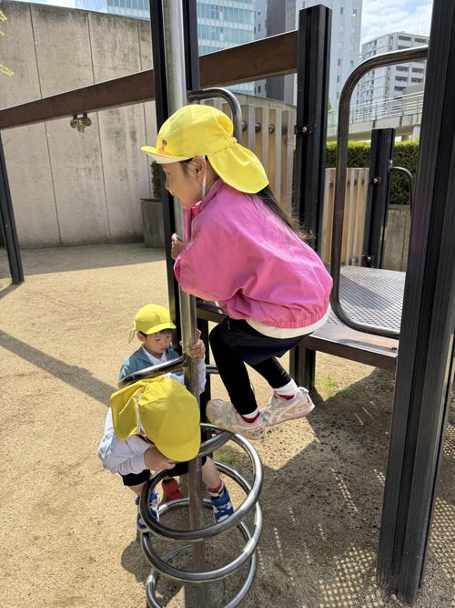 腕と足の力を使って、ぐるぐるのぼり棒を何度も登って楽しんでいました。