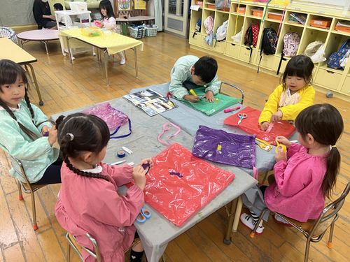 5月13日に参加する「にこにこまつり」に持って行くかばんを作りました。好きな絵を描いたり、色を選んでテープを貼ったりして自分なりのデザインを楽しんでいます。