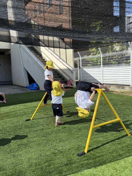 鉄棒、できるかな?腕の力を使って体を持ち上げたり、前回りを楽しんでいました。
