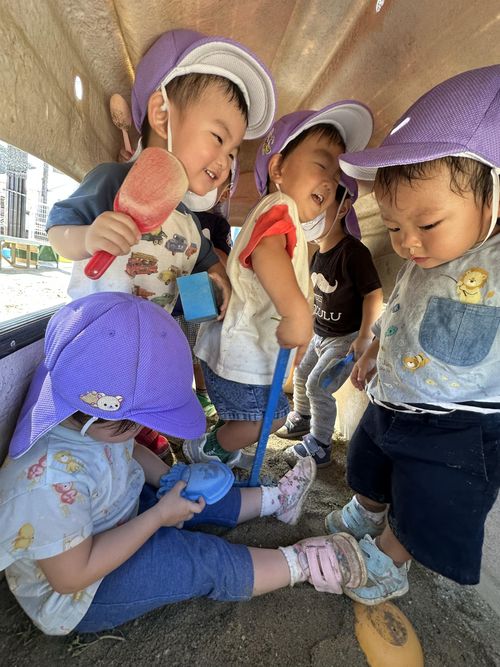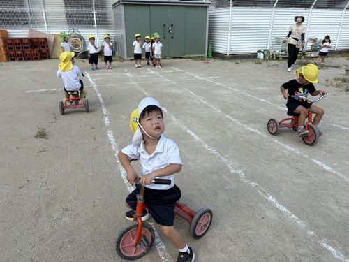 足の力がつき、三輪車がすいすい漕げるようになってきました。友だちと交代しながら遊んでいます。