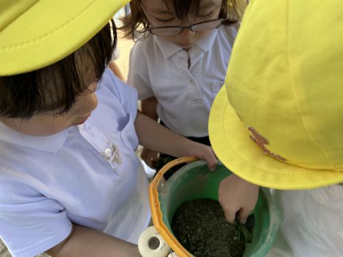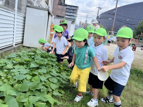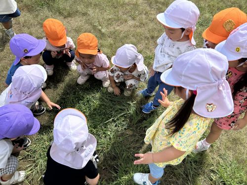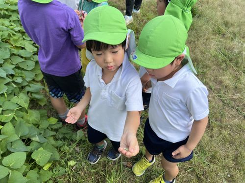 さつまいも畑でバッタを発見!手で捕まえたり、じっくり観察していました。「ピョ~ンと飛んだ!」