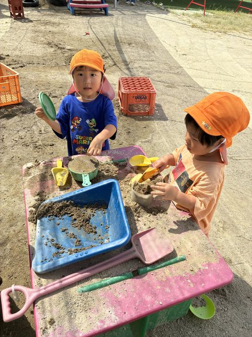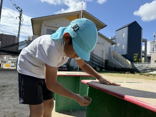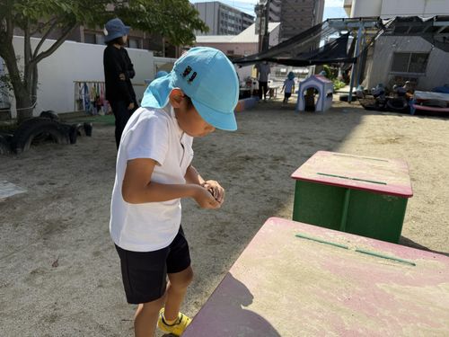泥団子作りをしています。「かたくな~れ、かたくな~れ!」白いさら砂を集めて、団子にかけると固まるよ!