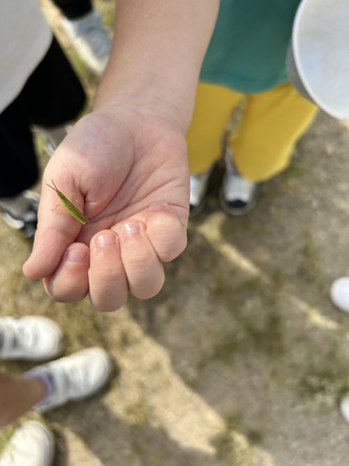 たくさんのバッタに大興奮でした。「ねぇ、見て!手のひらにバッタがとまっている」