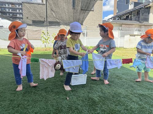 洗濯ごっこが始まりました。「洗濯バサミでうまくはさめるかな?」干すことに集中しています。