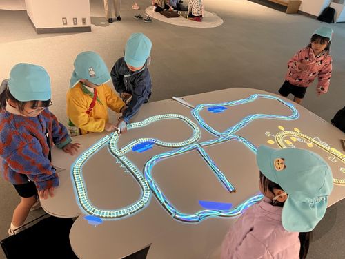 線路をつなぐと、光がつながります。「あっ!ひかった!」「一緒につなげて長くしよう」