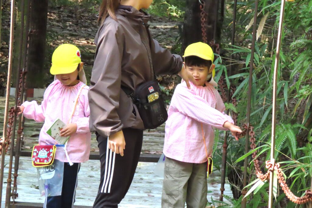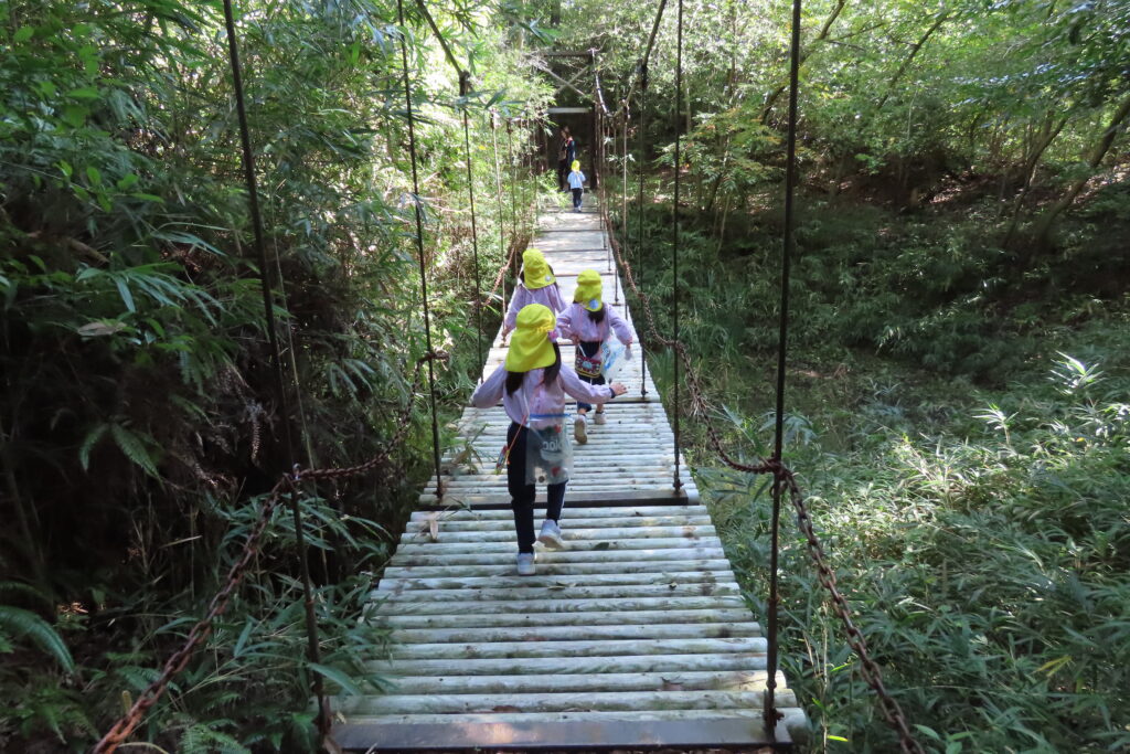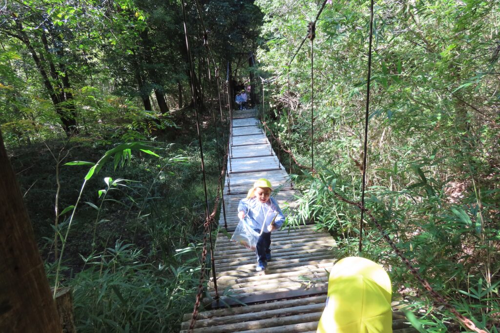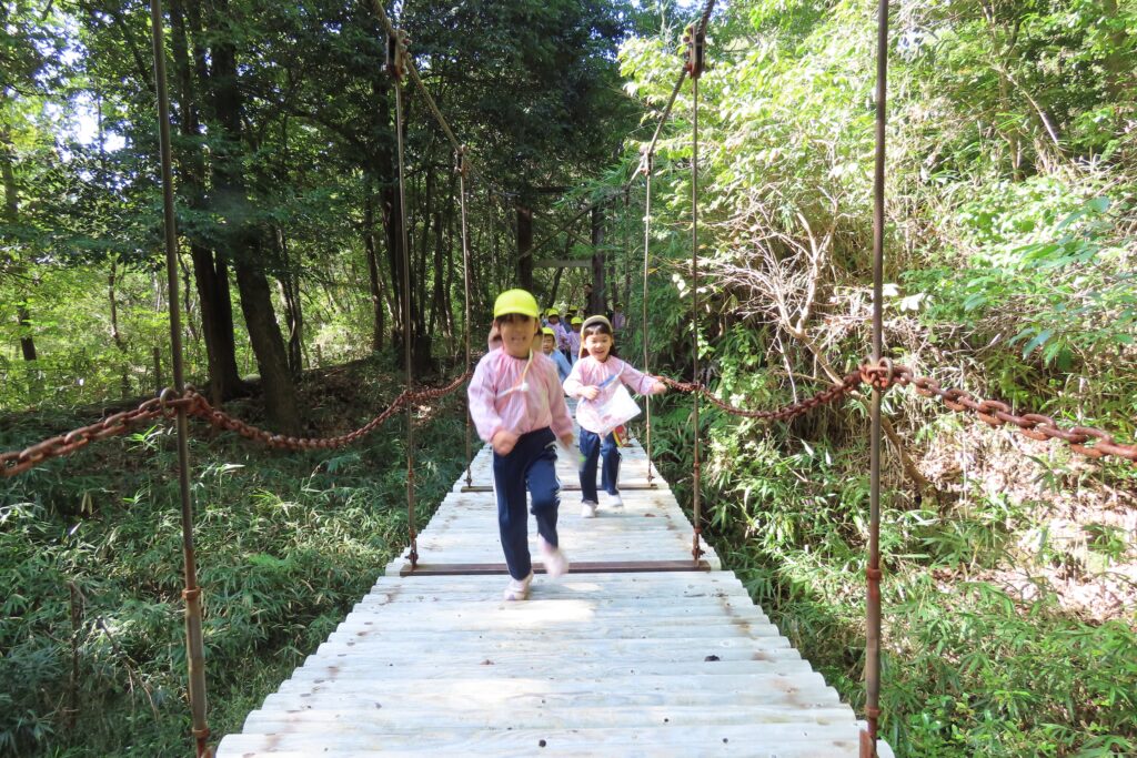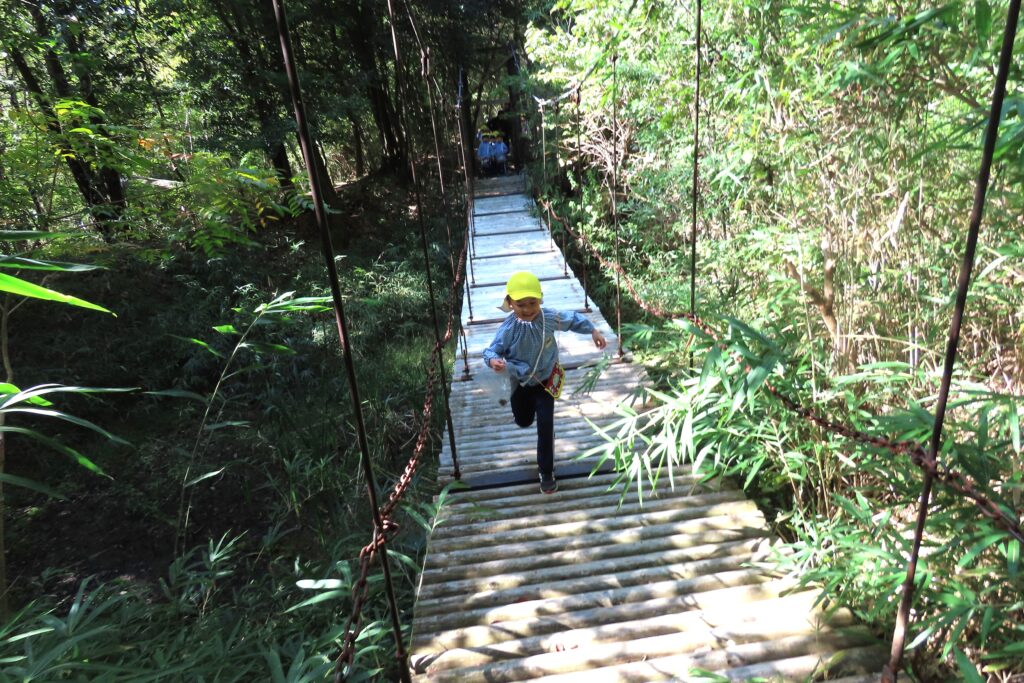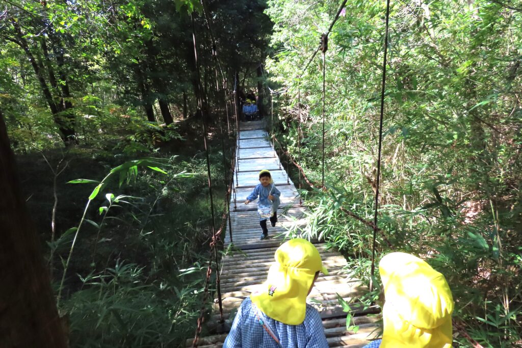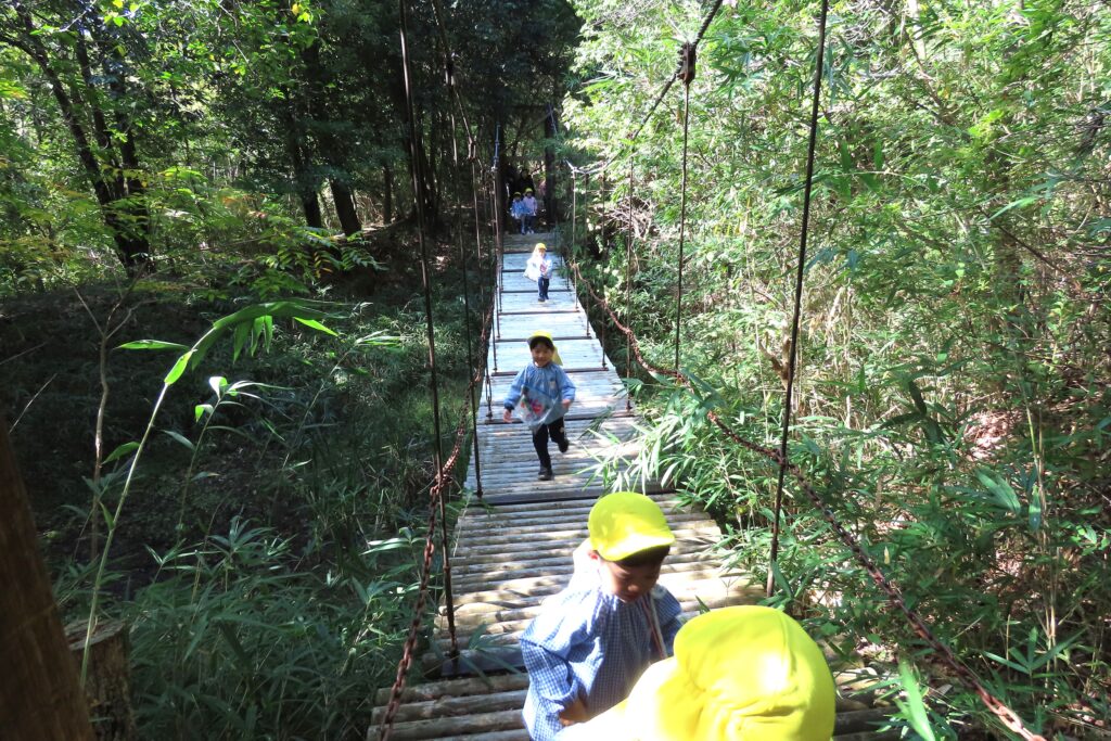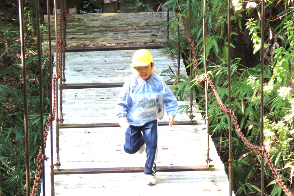 子どもたちが大好きなつり橋です。春に来たときはおそるおそる渡っていた子も今回は自信満々で…。一人ずつ走って渡る子もいて、この半年の成長はすごい!