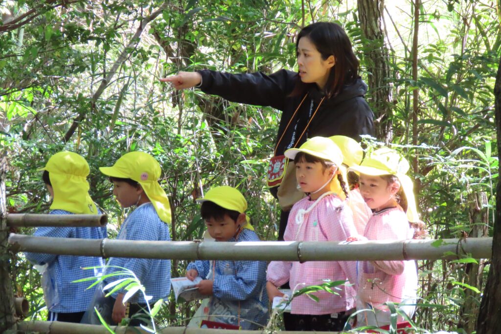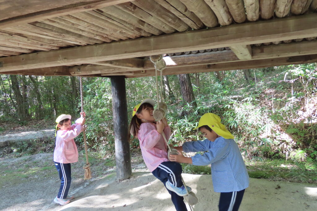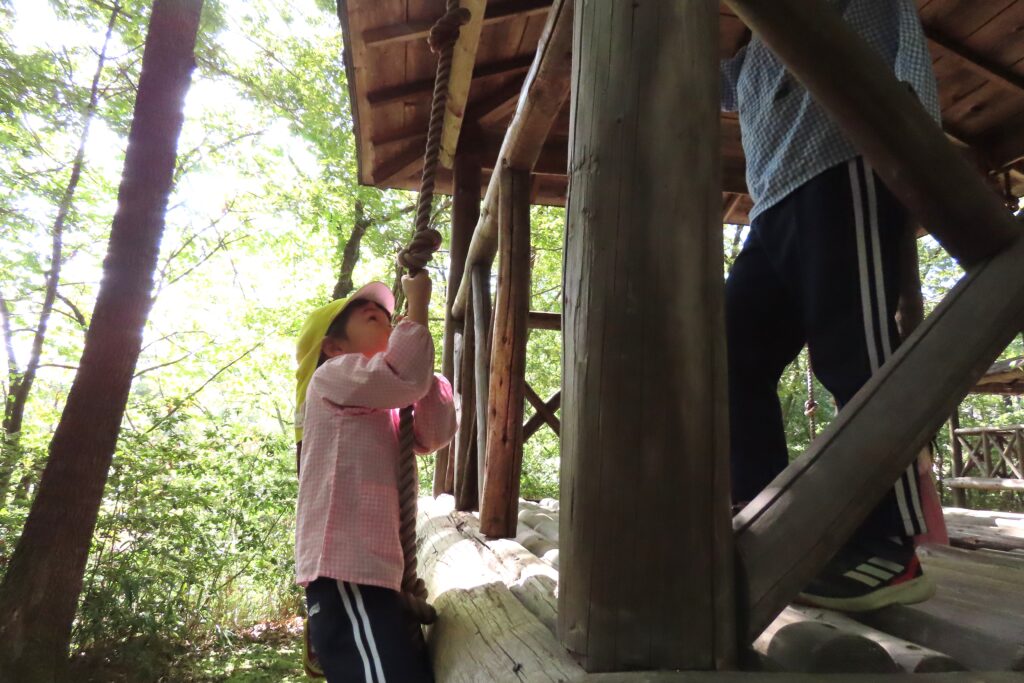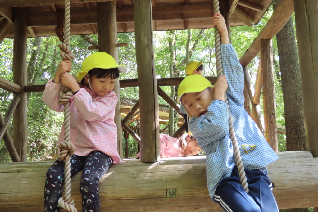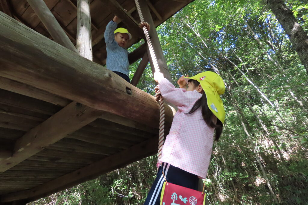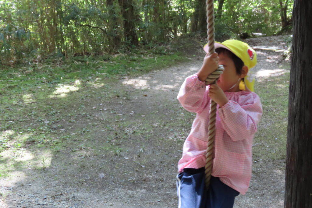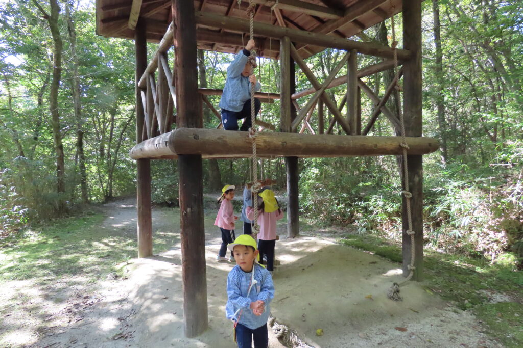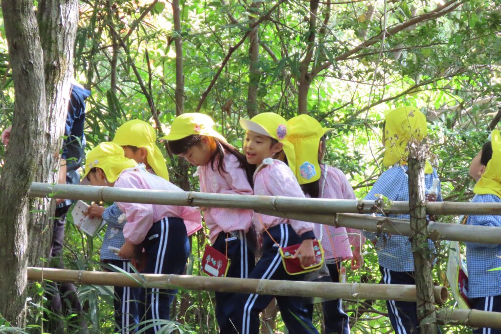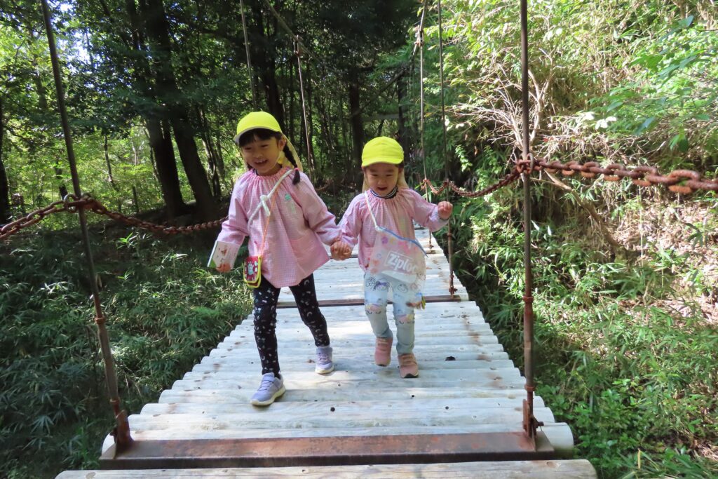 子どもたちが大好きなつり橋です。春に来たときはおそるおそる渡っていた子も今回は自信満々で…。一人ずつ走って渡る子もいて、この半年の成長はすごい!