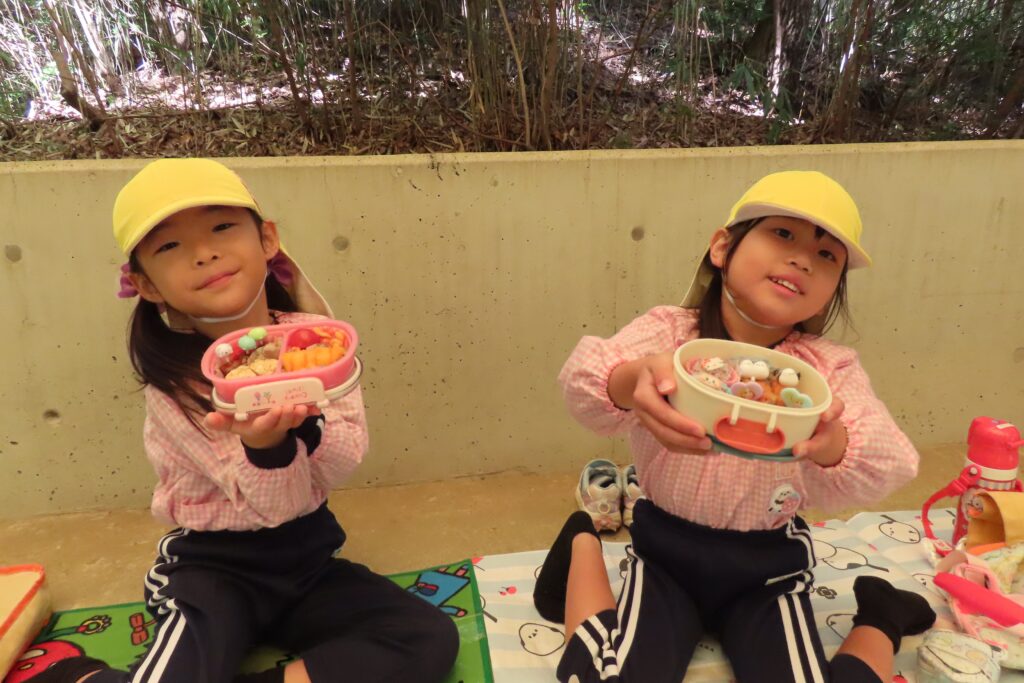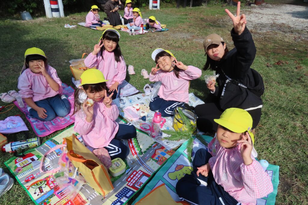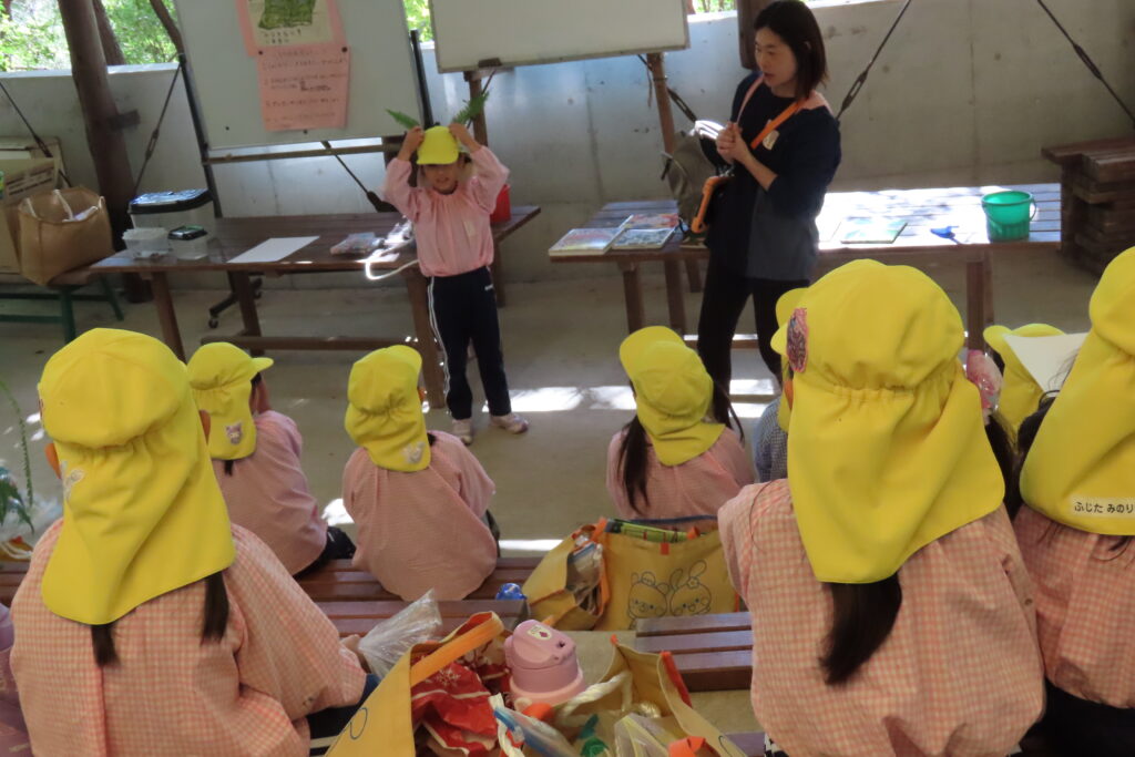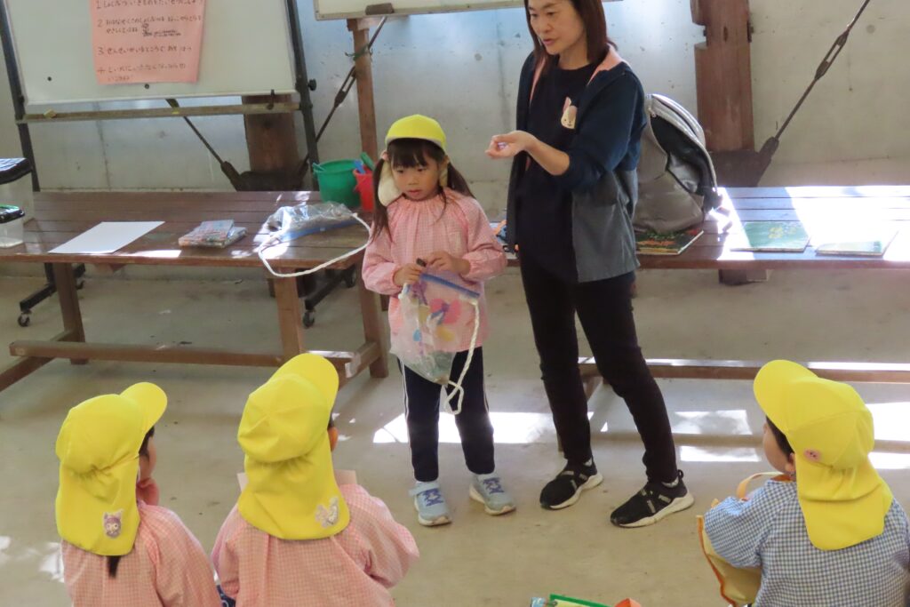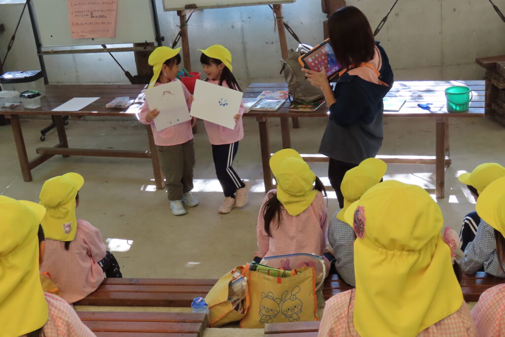 最後に、今日の振り返り。見つけた花の匂いをかいでもらったり、描いた絵を見せたり葉っぱでうさぎになったりと…。11月22日の思い出保育までには、森を知り尽くそうね!