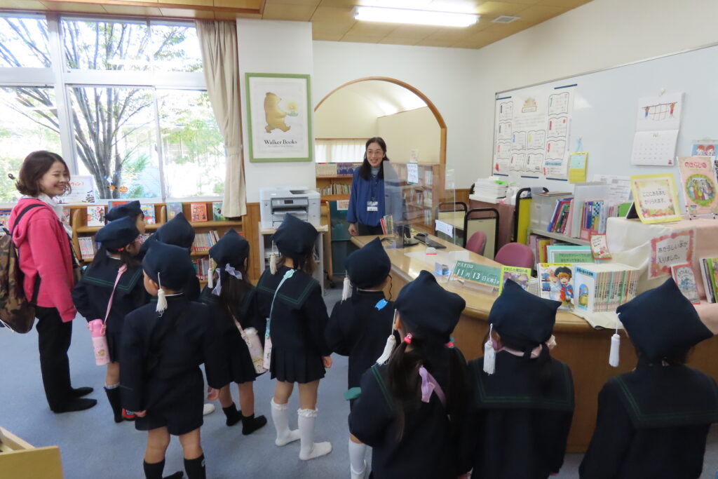 上靴に履き替えて廊下を進むと1年生の教室の前に。ちょうど奈良学園大学の学生が授業参観をしているところでした。「小学校の教室(勉強)って、こんな感じなんだ…。」とイメージしてもらって図書室に…。