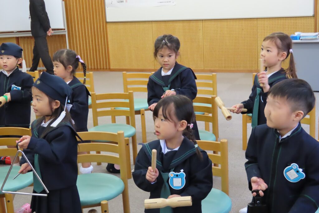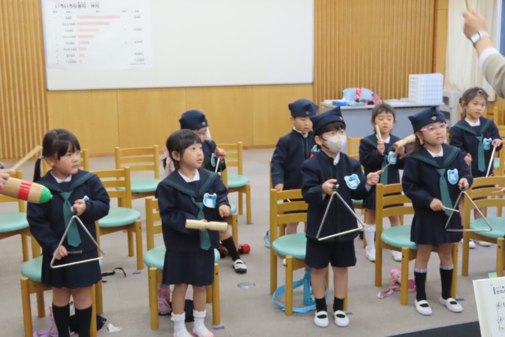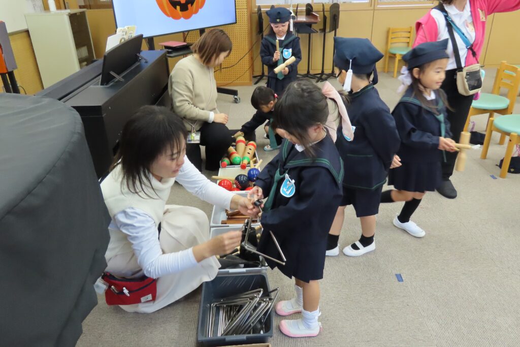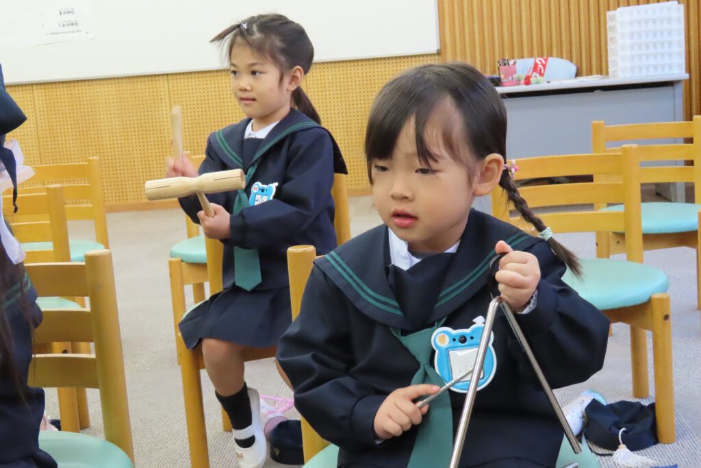 音楽室では秋の歌を歌った後、みんなで楽器演奏を…。ウッドブロックやトライアングル、カウベルやクラベスなど自分の好きな楽器をもって演奏を。とっても楽しそうにしていました。