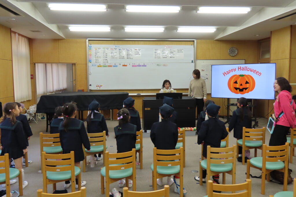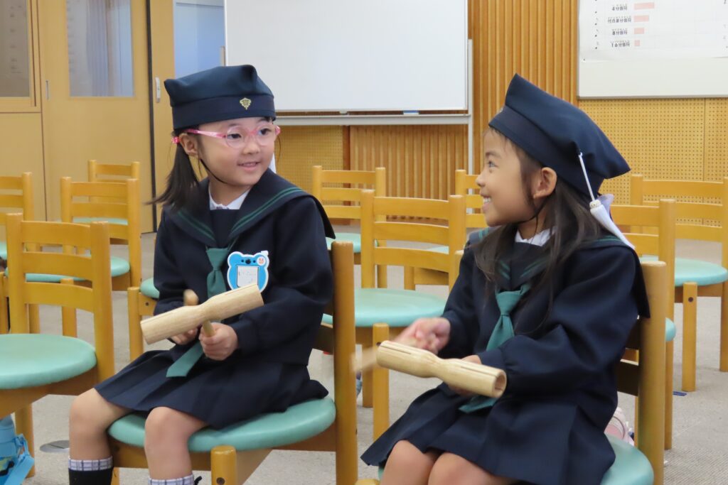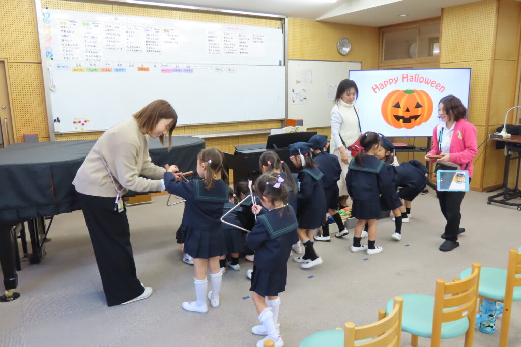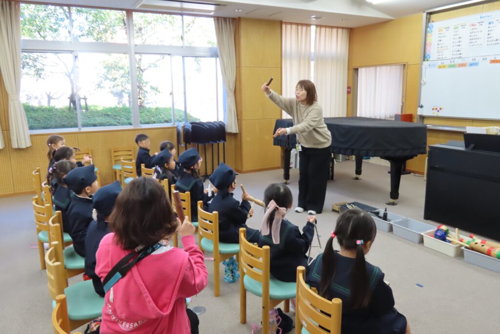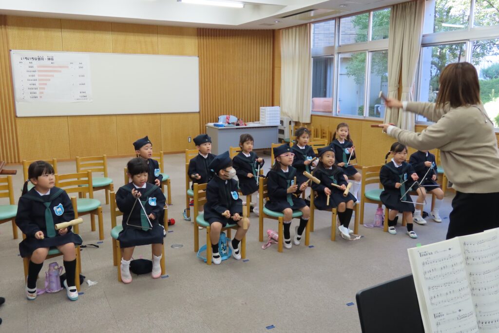 音楽室では秋の歌を歌った後、みんなで楽器演奏を…。ウッドブロックやトライアングル、カウベルやクラベスなど自分の好きな楽器をもって演奏を。とっても楽しそうにしていました。