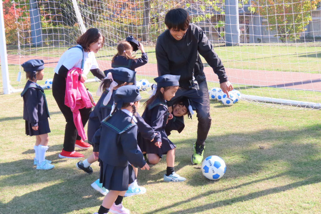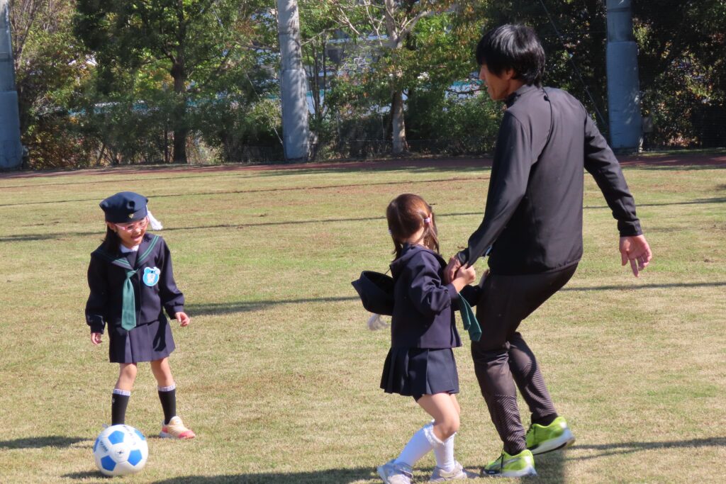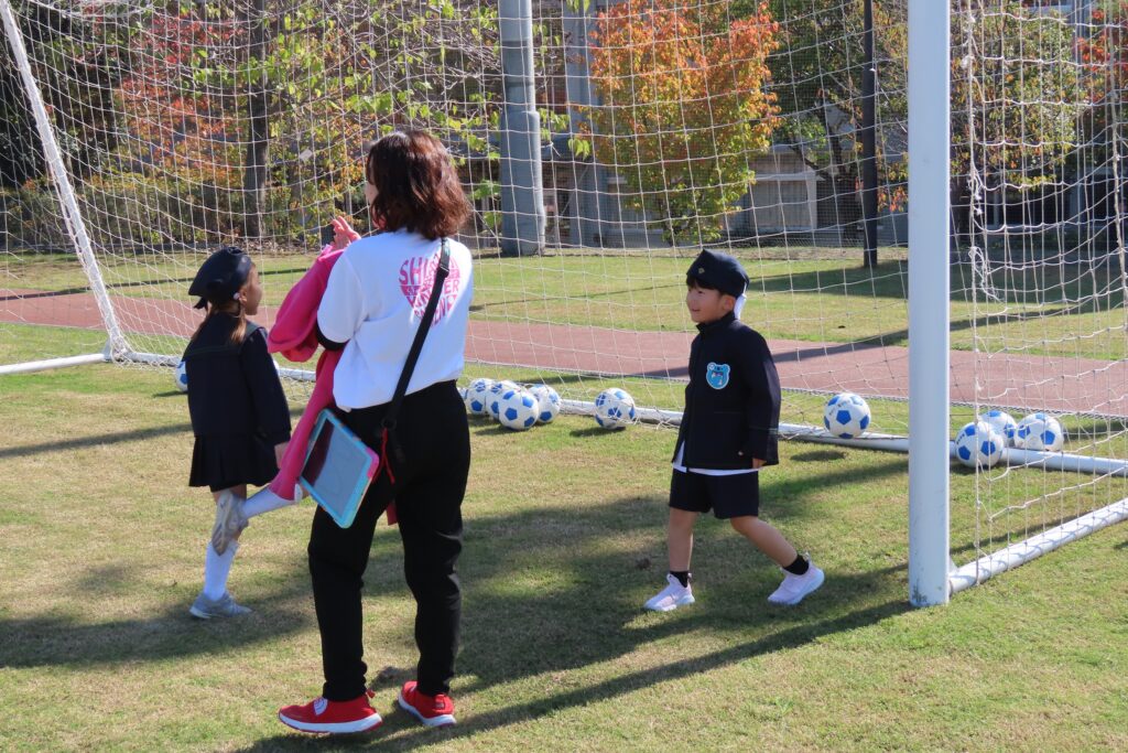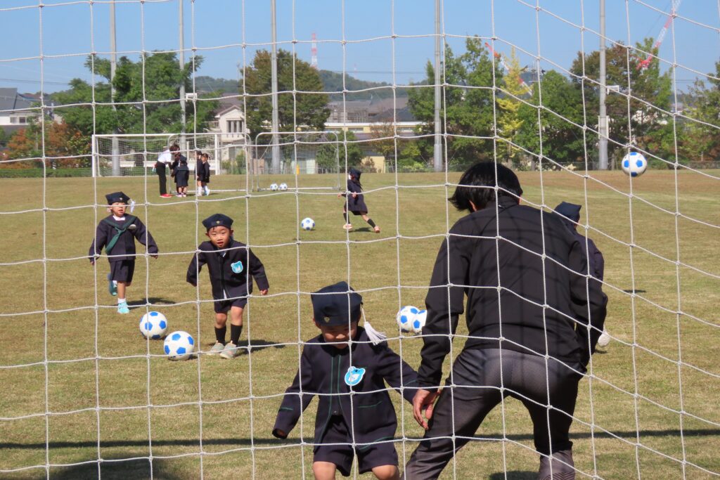体育の先生との勝負(先生がゴールキーパーになって、子どもたちのボールが全部ゴールに入ったら子どもたちの勝ち)です。最後は子どもたちの連係プレー(といっても、先生の邪魔をしているすきにボールを蹴りこむという、本当のサッカーなら反則技ですが…)で子どもたちの完全勝利! 協力(?)してやり遂げる力を見せつけた子どもたちでした。