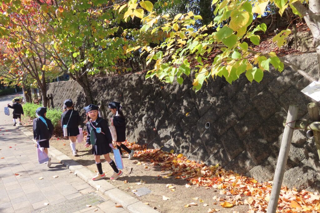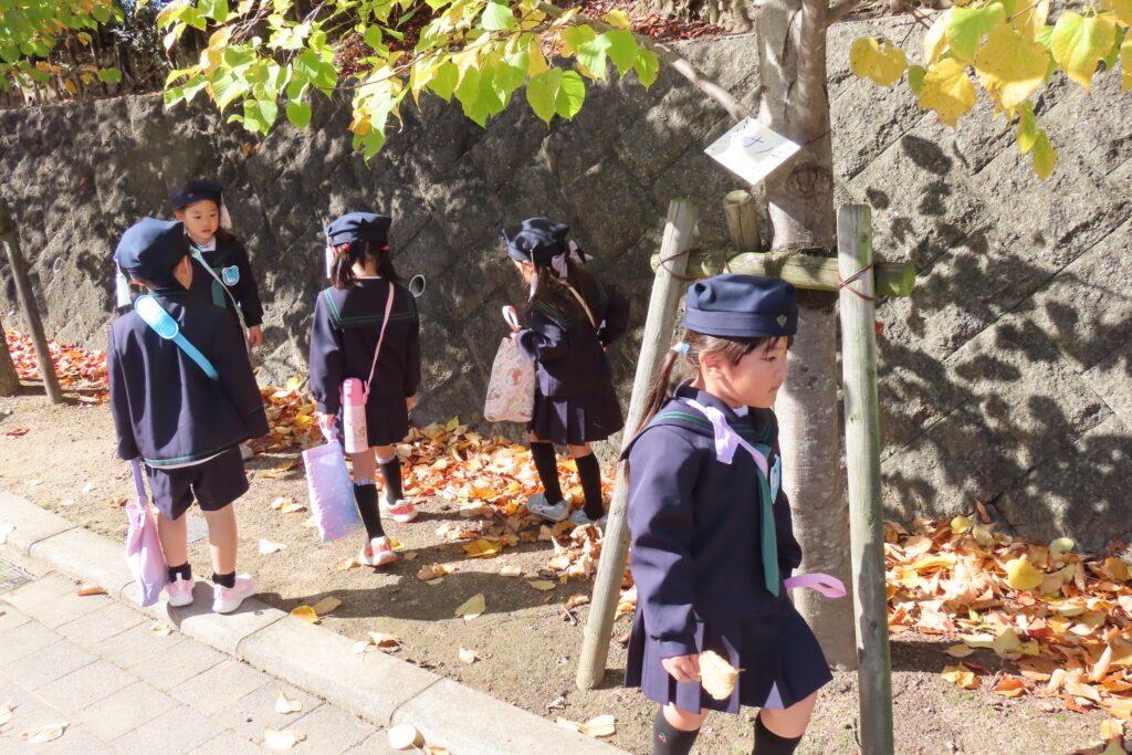 帰り道、子どもたちは紅葉した木の下でドングリを拾って持ち帰らせてもらいました。