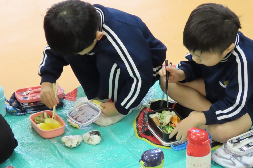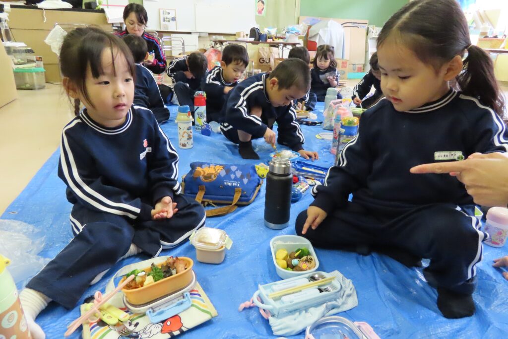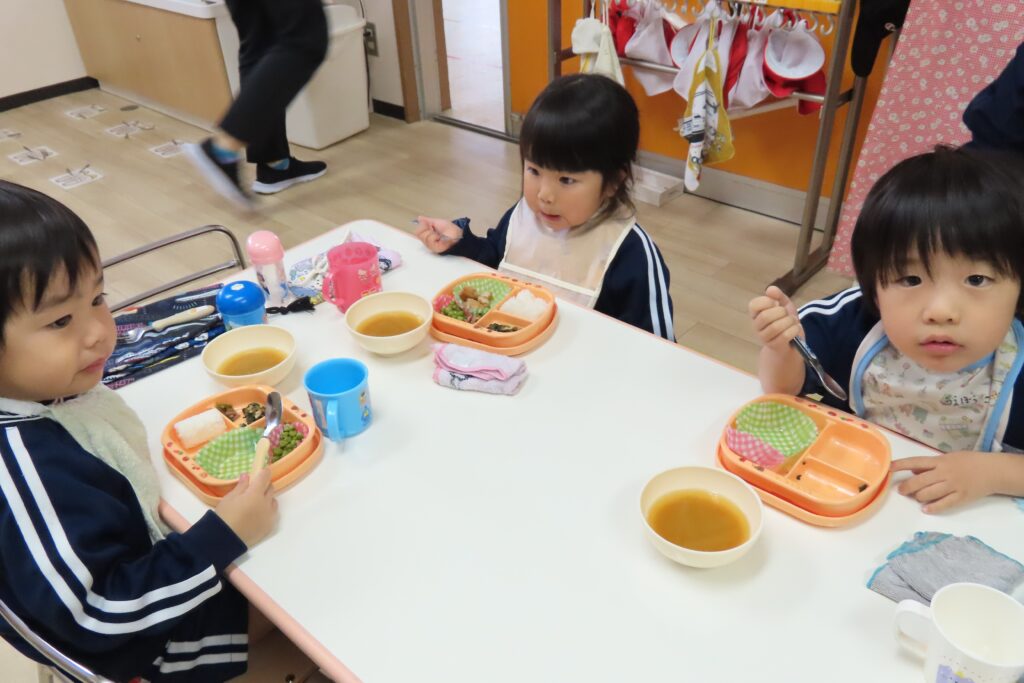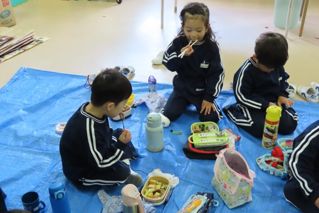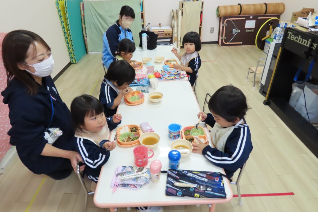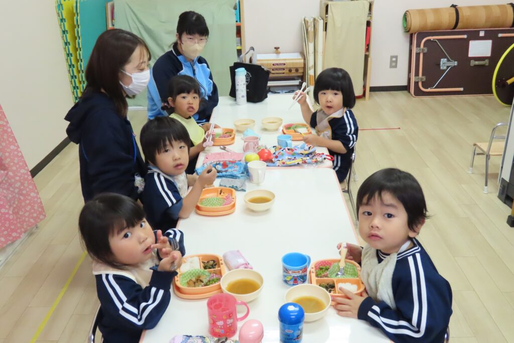 今日はみんな幼稚園で遊んだのですが「年少・年中さんの秋のハイキングの予備日」ということで、年少さんと年中さんはお弁当日となりました。2歳児・満3歳児さんは給食です。せっかくですので、その様子もご紹介します。