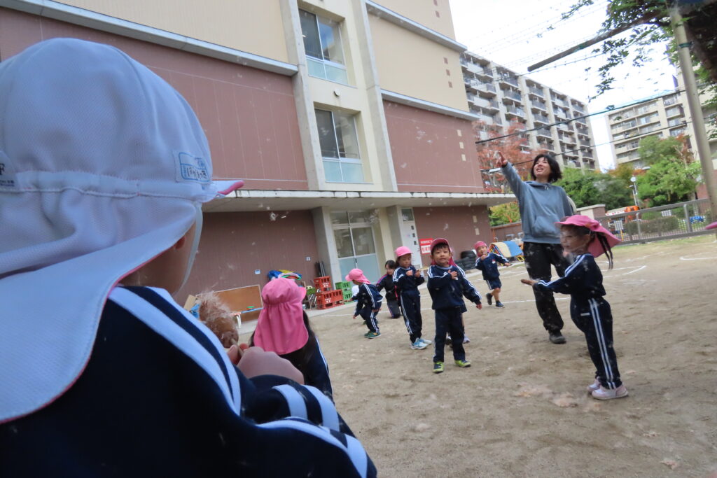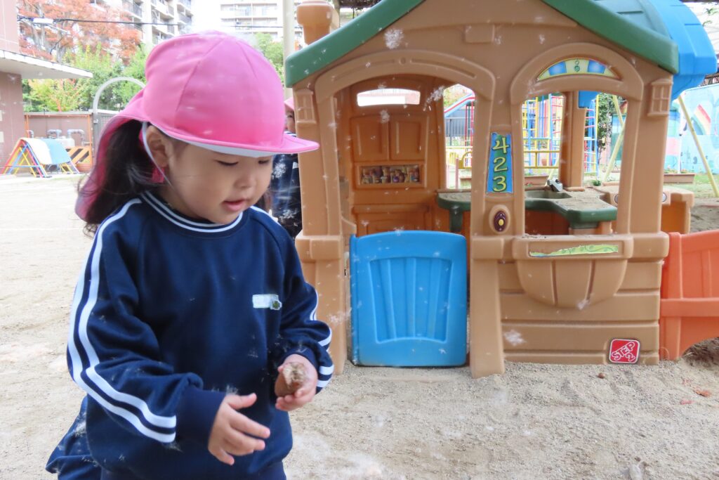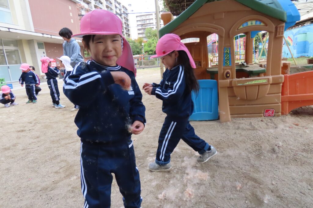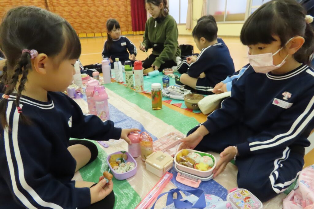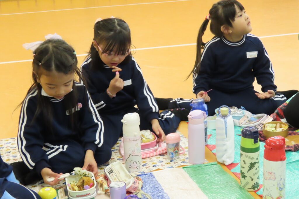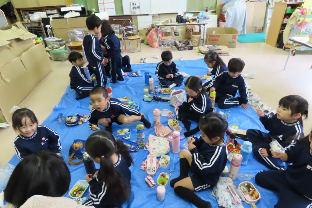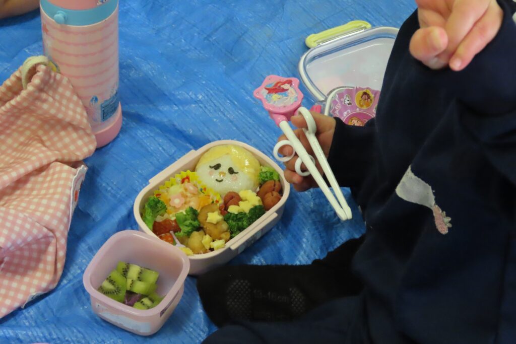 今日はみんな幼稚園で遊んだのですが「年少・年中さんの秋のハイキングの予備日」ということで、年少さんと年中さんはお弁当日となりました。2歳児・満3歳児さんは給食です。せっかくですので、その様子もご紹介します。