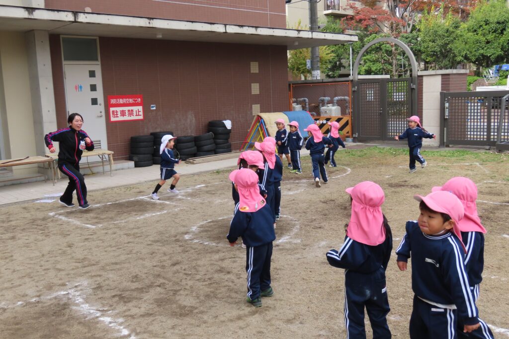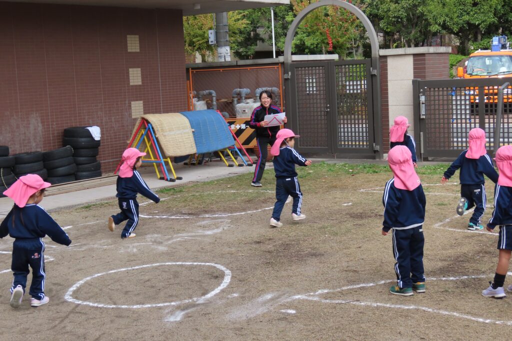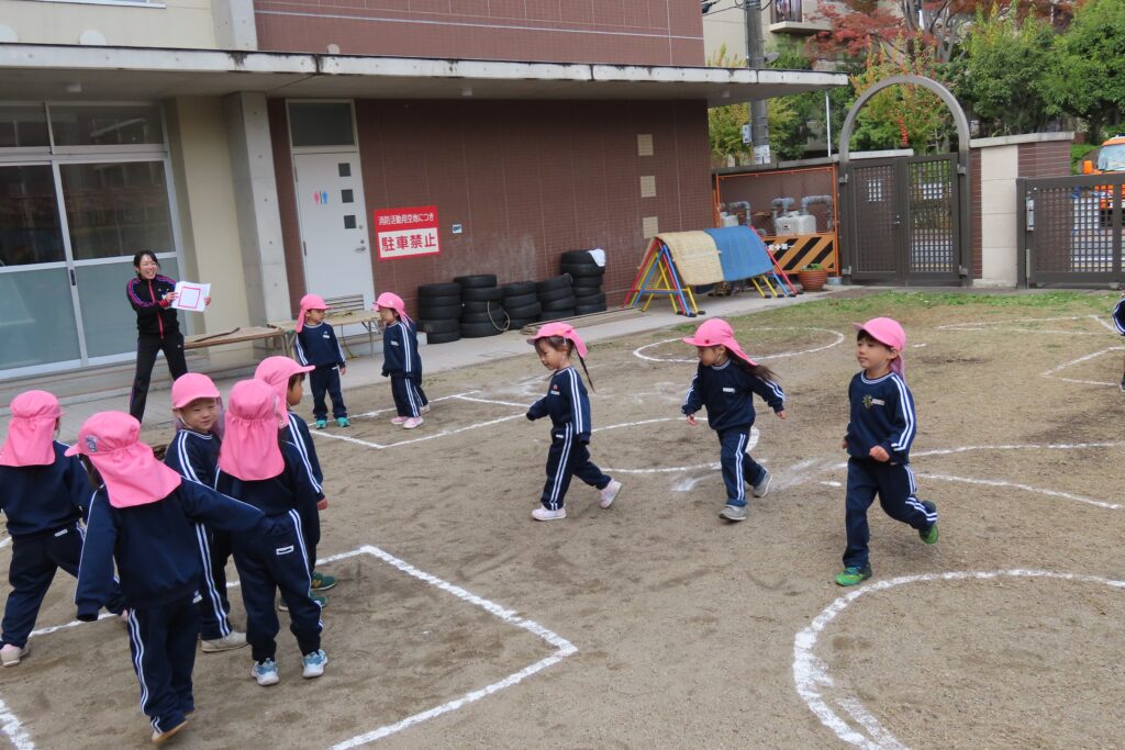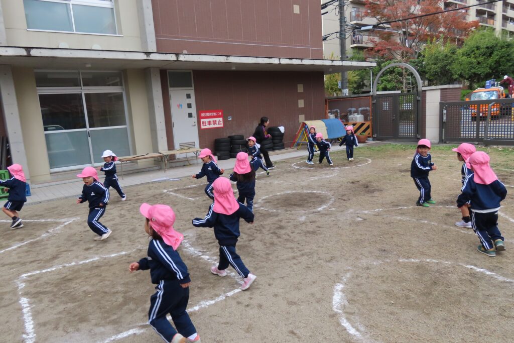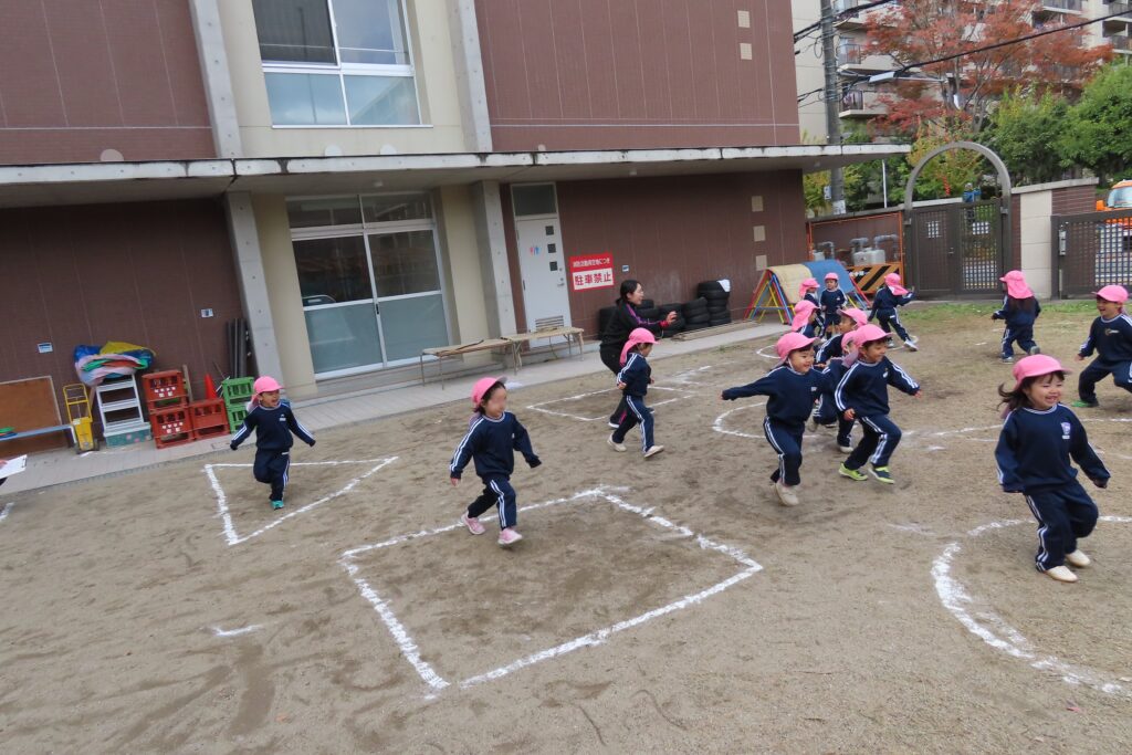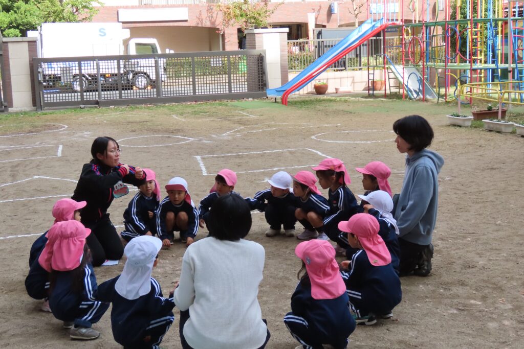 年少「さくら組」さんは、実習生のお姉ちゃん先生と『オオカミが来たぞゲーム』をしました。ルールは簡単。先生がオオカミおにになって子どもたちをつかまえます。逃げる子どもたちは、はじめに指定されたセーフティーゾーンの○・△・▢に逃げ込めばつかまりません。