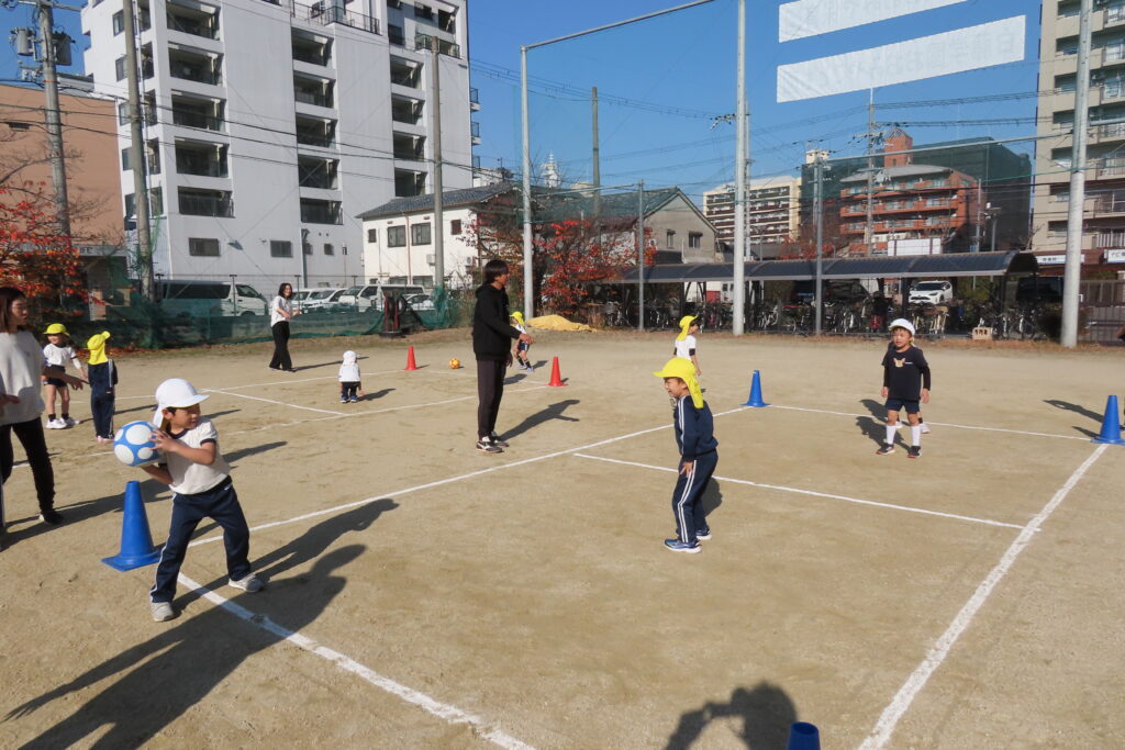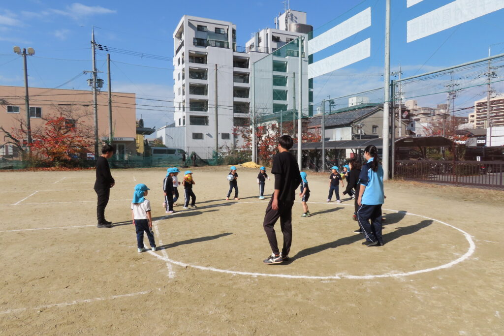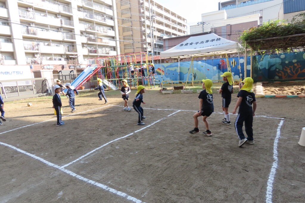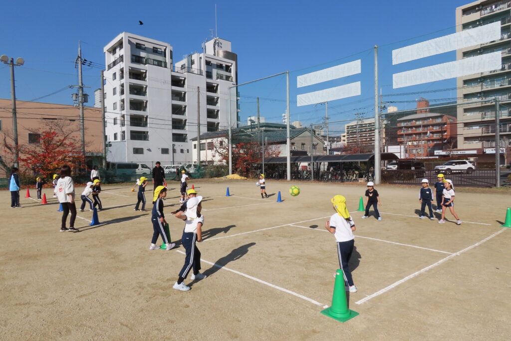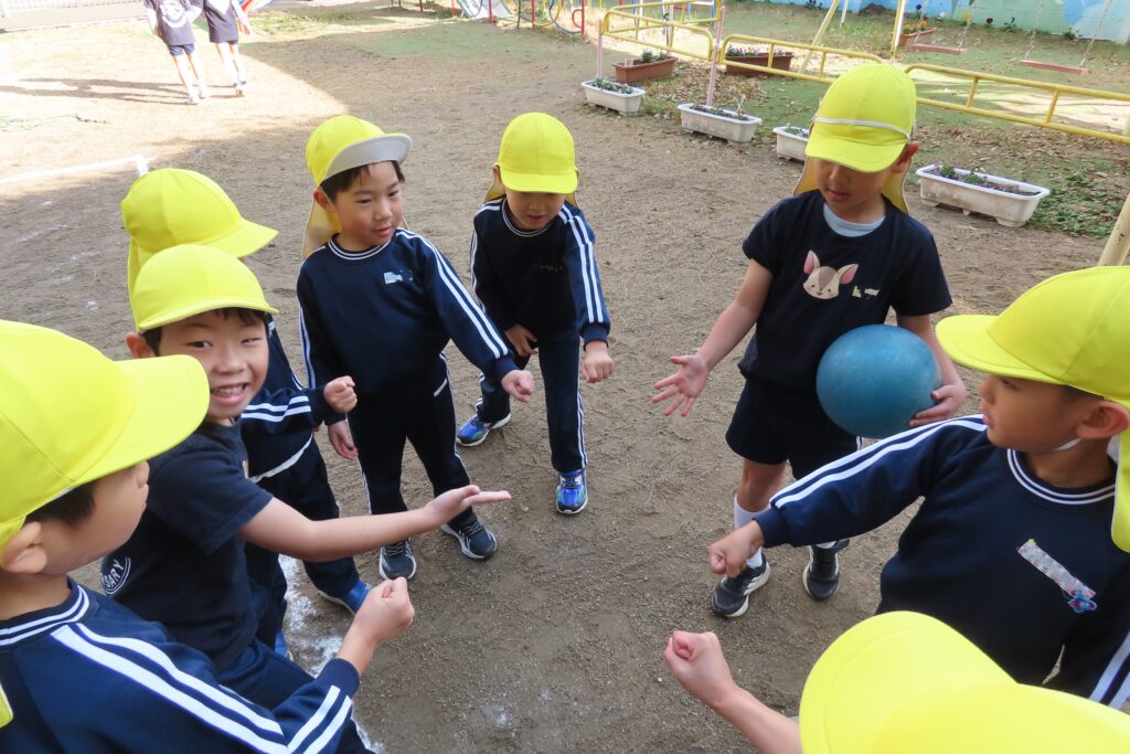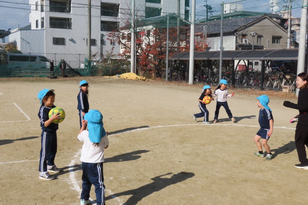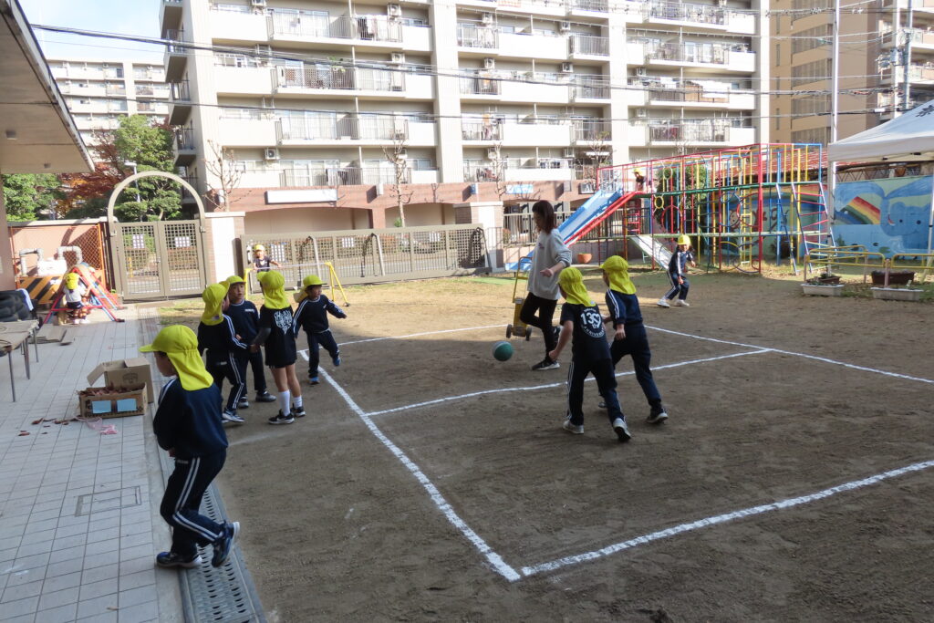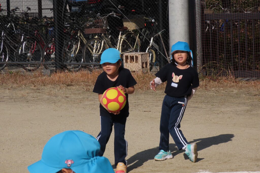 年長さんは運動場でドッジボールを楽しみました。小学生が遊ぶ球技といえばドッジボール。もうすぐ一年生になる年長さんにとっては、ぜひ慣れ親しんでおいてほしい遊びです。基本的なルールも確認しながら楽しみました。