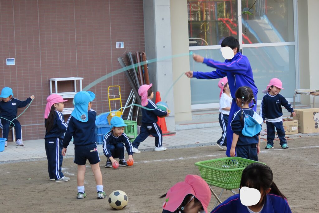 年中さんも運動場でドッジボールを…。でも、年長さんと少し遊び方が違います。大きな円を描いて外野と内野の2チームで遊びます。当てられるといったん外に出て、縄跳びのうえを5回ジャンプ。それからまた内野に戻って復活です。上手に投げたり避けたりできたかな?