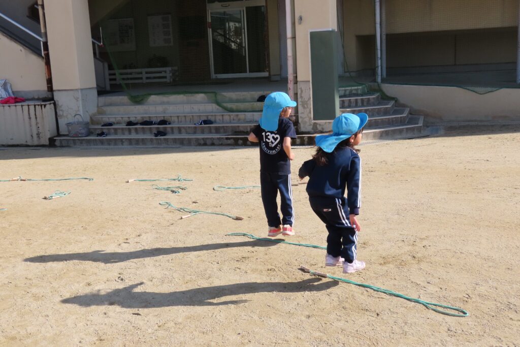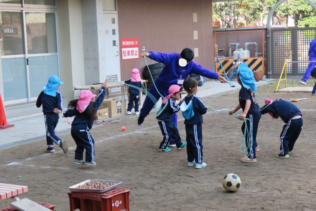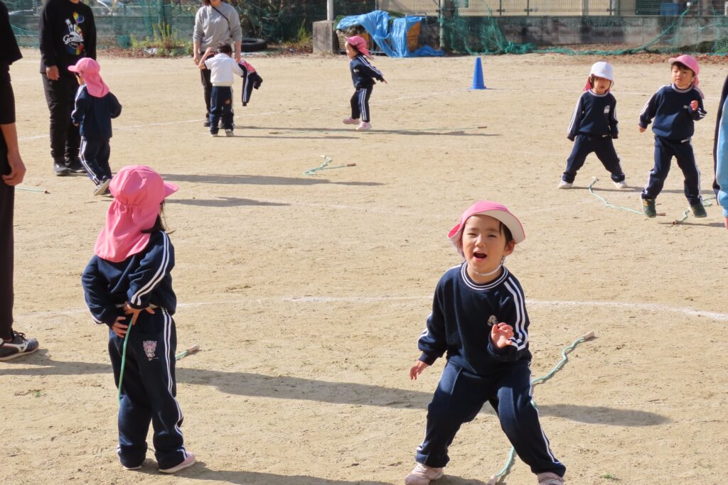 年少さんはなわとび遊び。まだまだ前跳び、後ろ跳びは難しいので、縄跳びをまたいで跳びはねたり、縄跳びからずれないように半回転ジャンプをしたりといろいろな基本の運動を楽しみました。