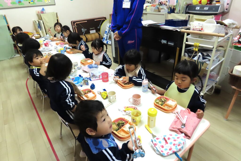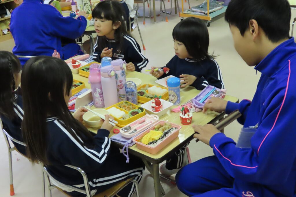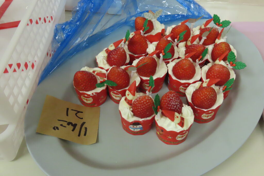 クリスマス会の後は、奈良女子高等学校のパテシエールの生徒さんたちが作ってくれたいちごケーキ🍓をいただきました。その様子をご紹介。「つき組」さんと「いちご組」さんは、給食後のデザートとして食後に配られていただきました。