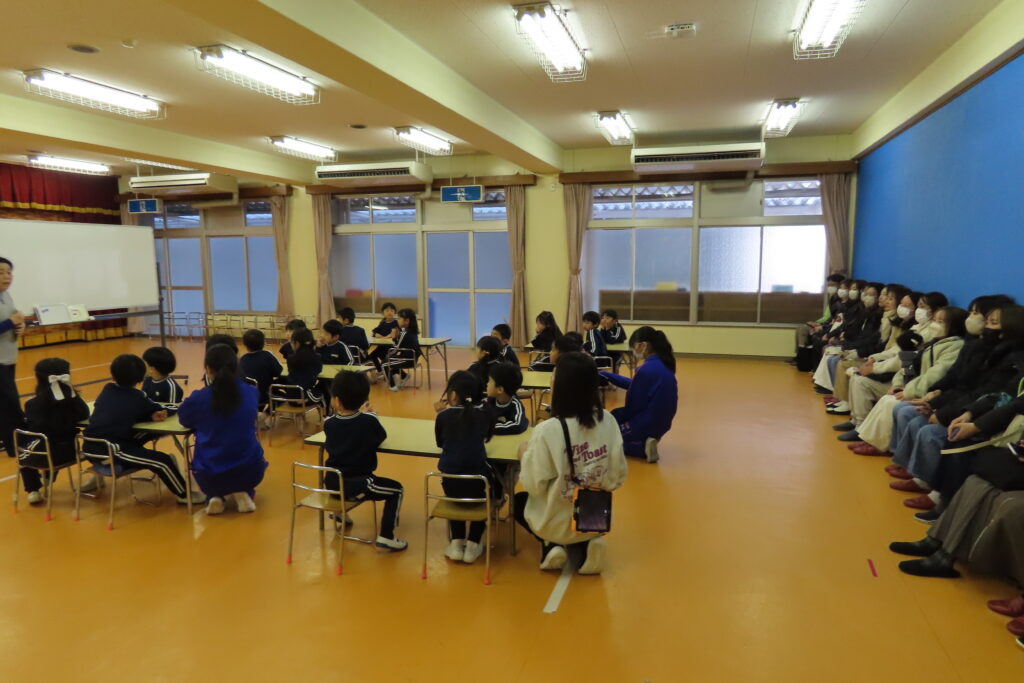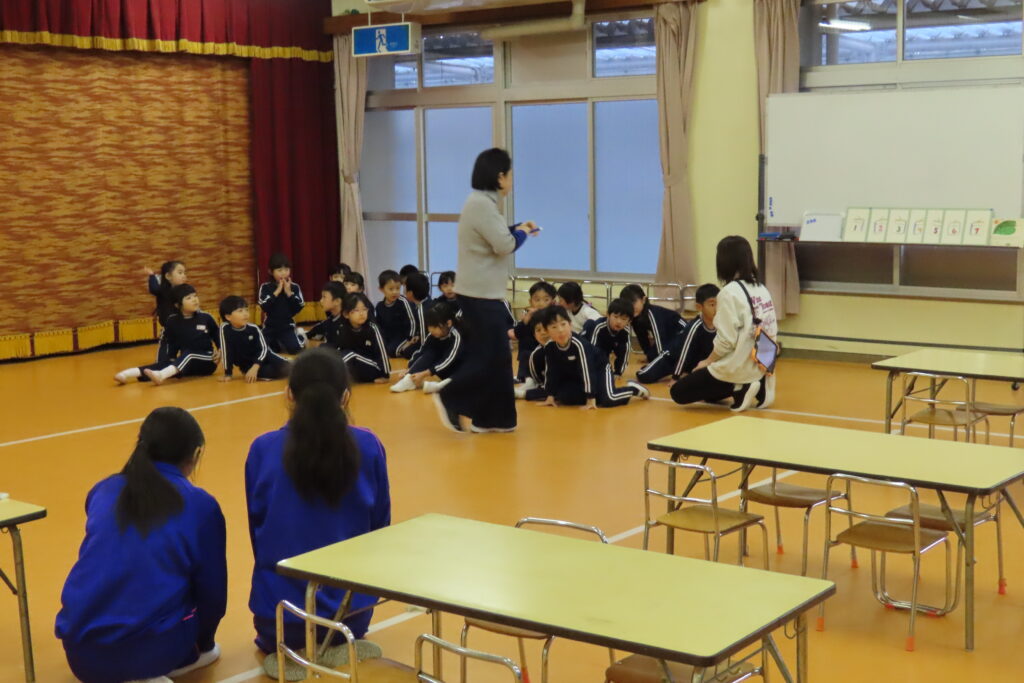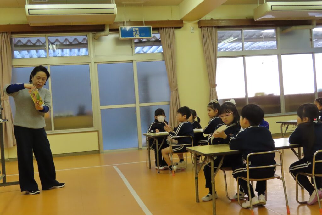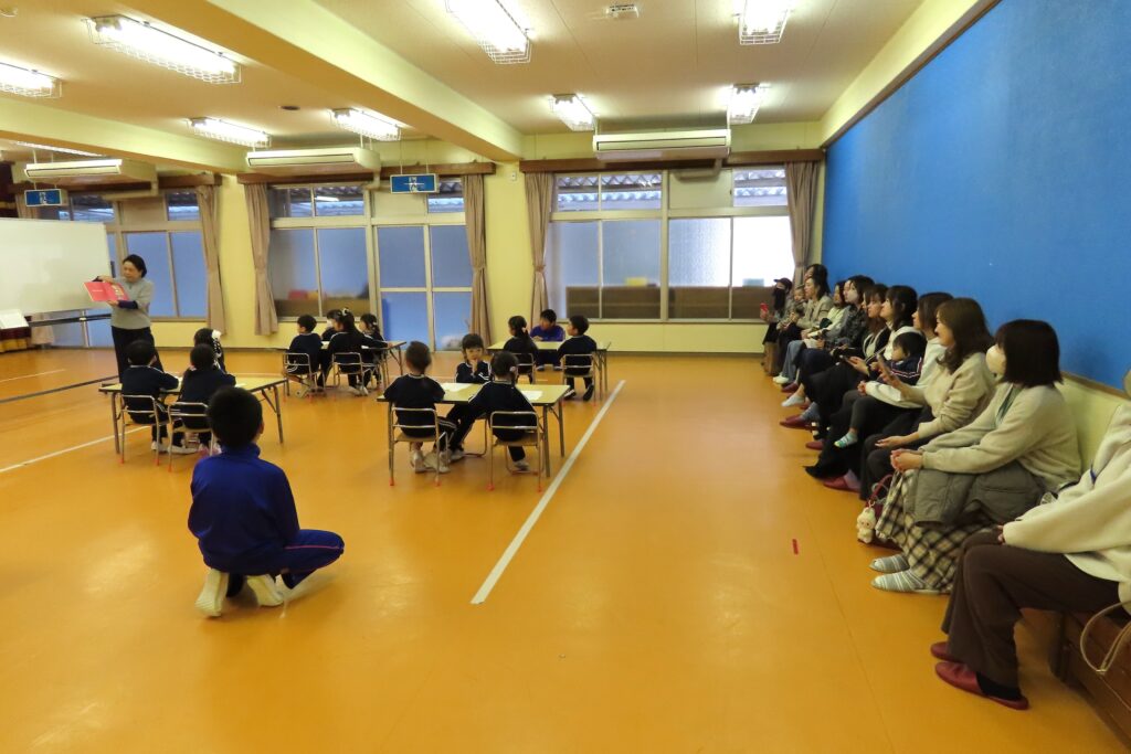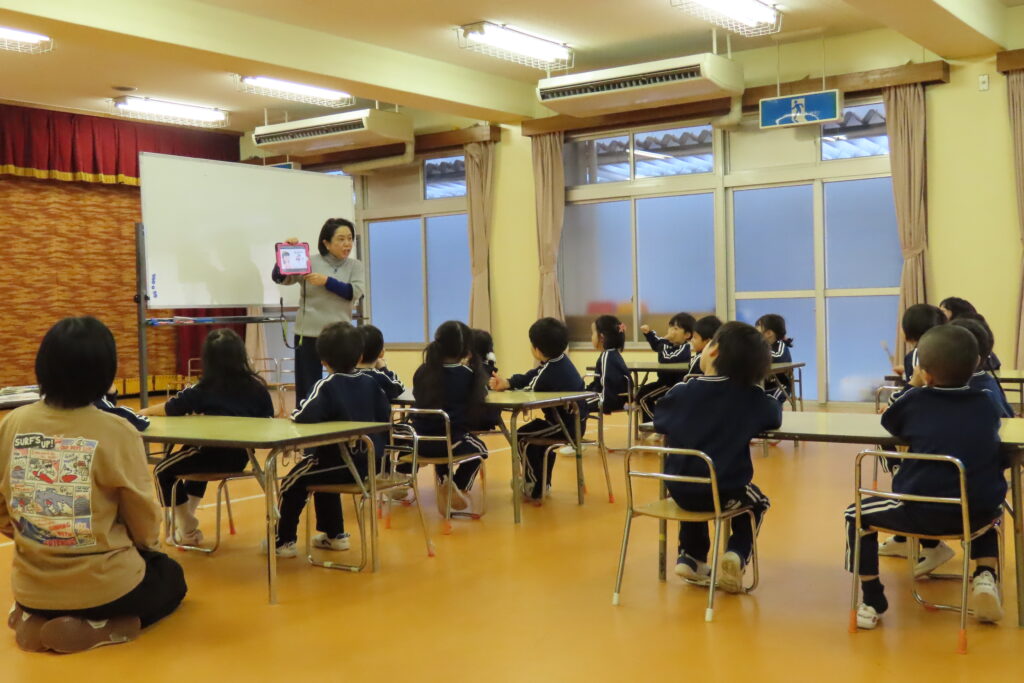 今日は英語教室の参観日。年に1回の「英語参観」です。子どもたちは、年中「ほし組」さん → 年少「さくら組」さん → 年長「つき組」さんの順に遊戯室で行いました。英語参観では絵本を読んでもらったりタブレットで楽しんだり、体を動かすアクティビティで楽しんだりしました。
