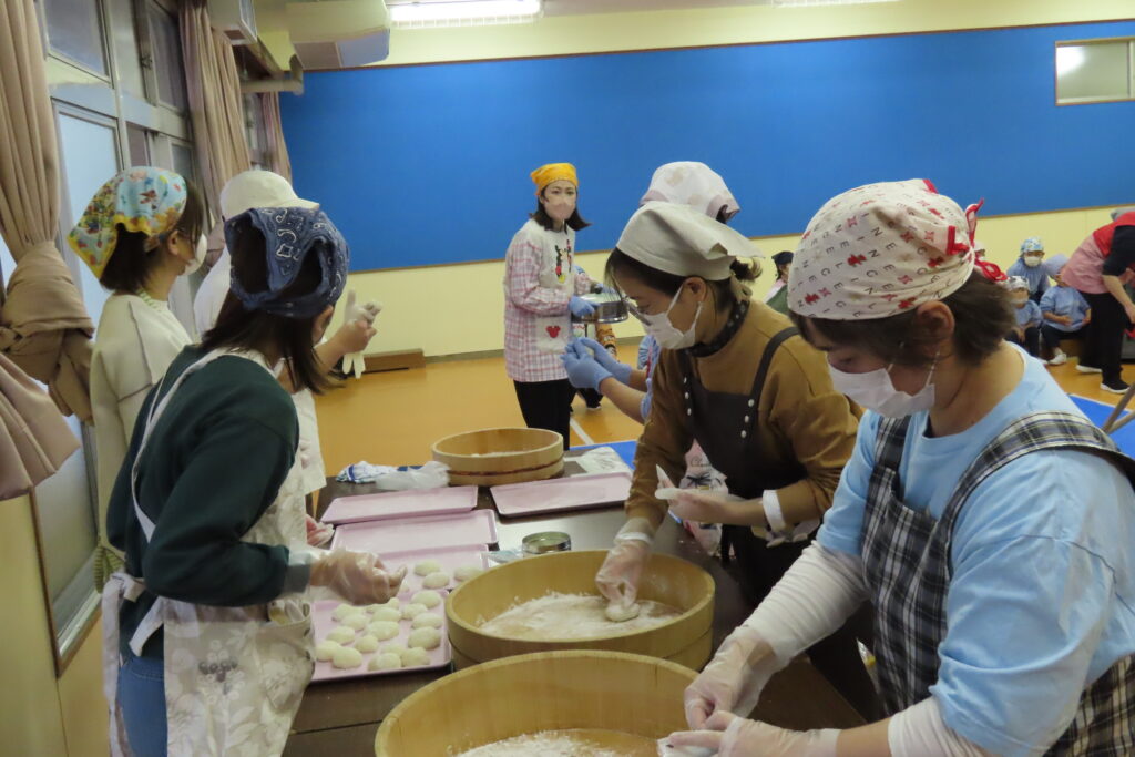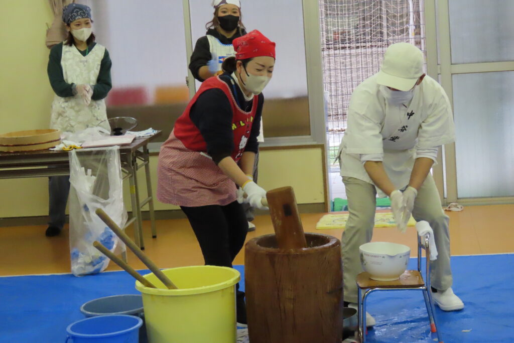 お餅つき体験は「杵をもってお餅を搗く」だけが体験ではありません。炊きあがったもち米の香りをかいだり、搗きたてのお餅をちぎるといった五感すべてを使った体験です。子どもたちが搗く前は、大人(保護者ボランティアの皆さんや先生たち)でまずは下ごしらえ…。