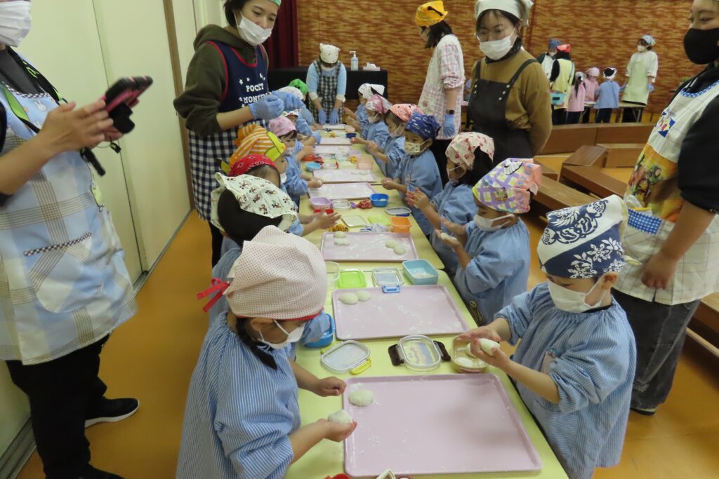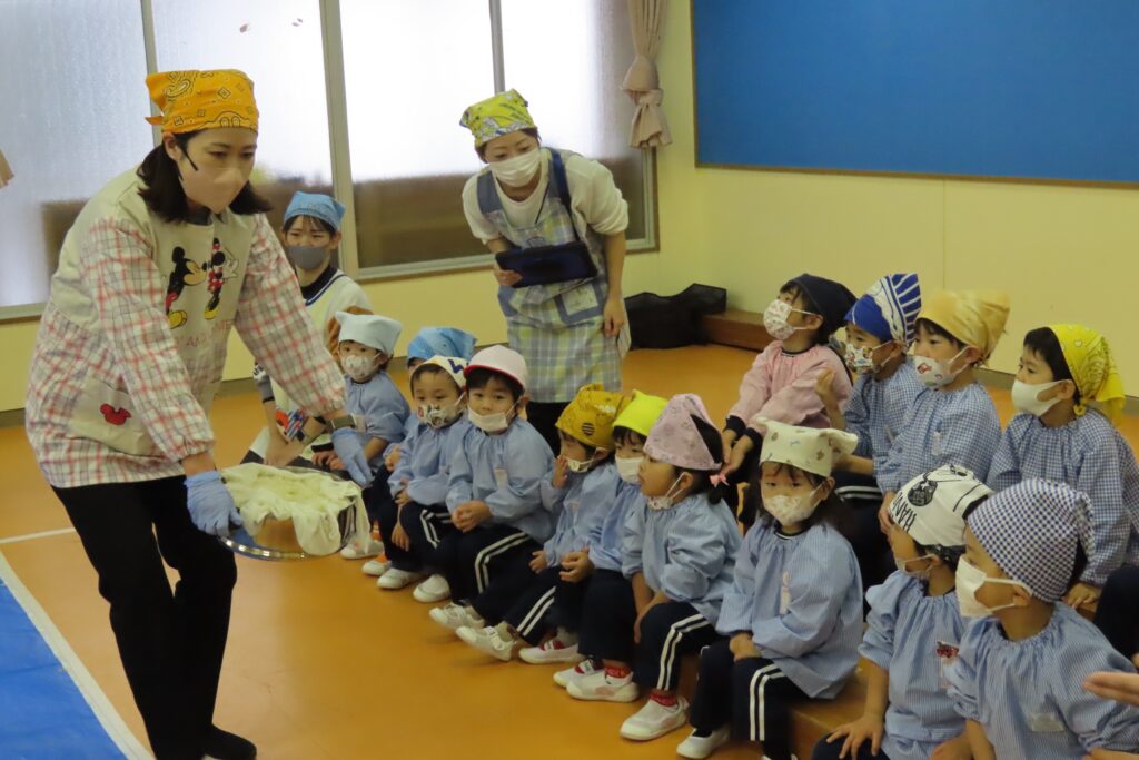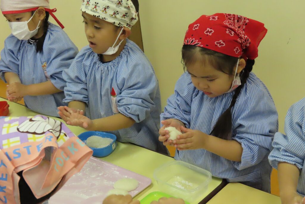 (^^♪ もういくつ寝ると お正月…♪というように、今年もあと3週間となりました。「お正月」といえば「お餅」…。ということで、今日はお餅つきの様子をご紹介します。今年も、あの高速餅つきで有名な(もちろん、お味も絶品ですが…)三条通の『中谷堂』にお勤めの卒園児の保護者様に来ていただきました。この日は保護者ボランティアも募集したのですが、大変応募が多く(なんと倍率5~6倍!)お子様に抽選を引いてもらい、各クラス2名限定でお願いしました。応募された皆様、参加いただいた皆様、ありがとうございました。