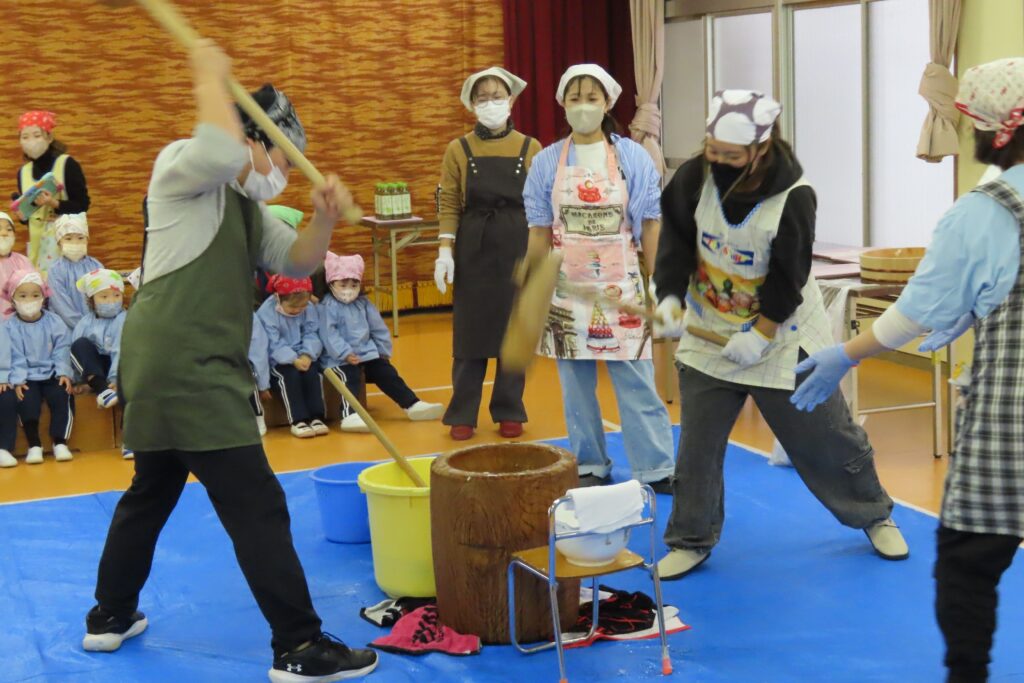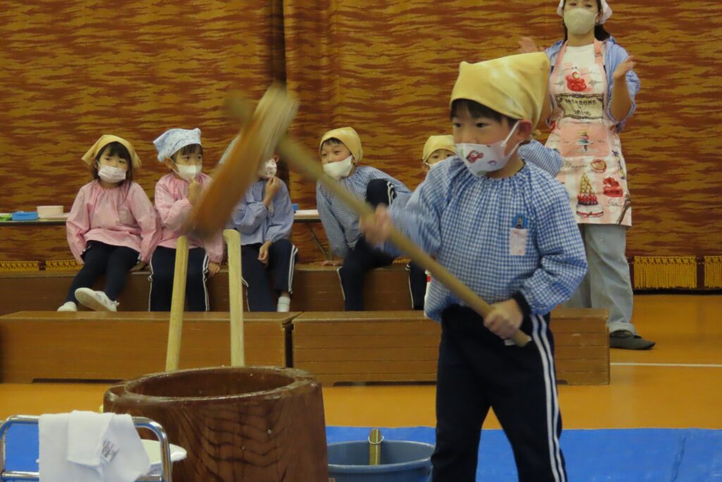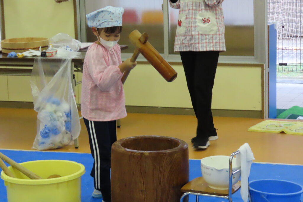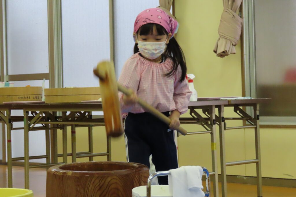 さすが、年長さん。年長さんは今年で3回目の経験です。一人で杵をもって、おもちつきの歌にあわせながらペッタンペッタン上手に搗いていました。