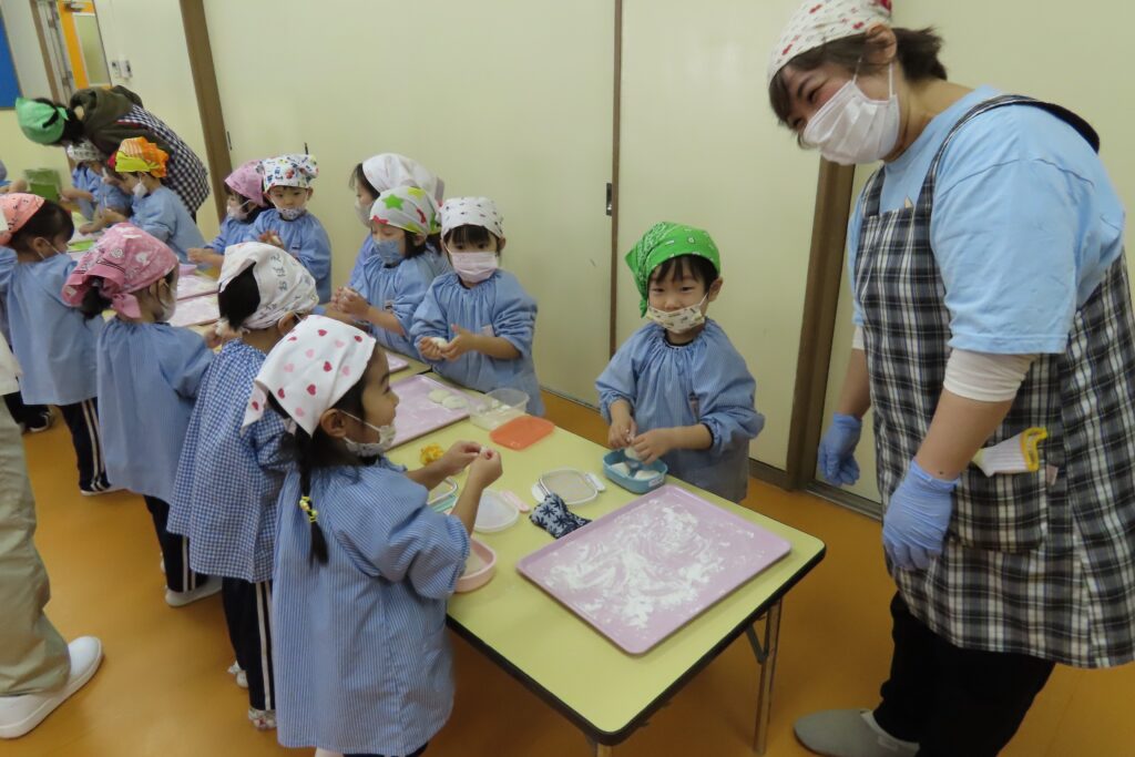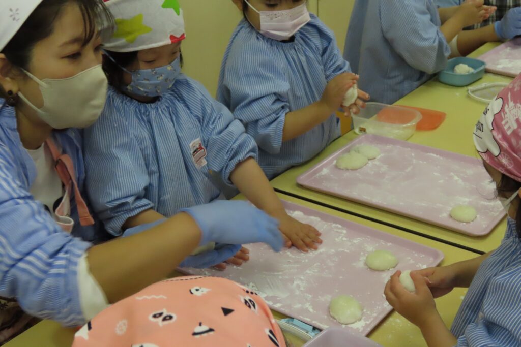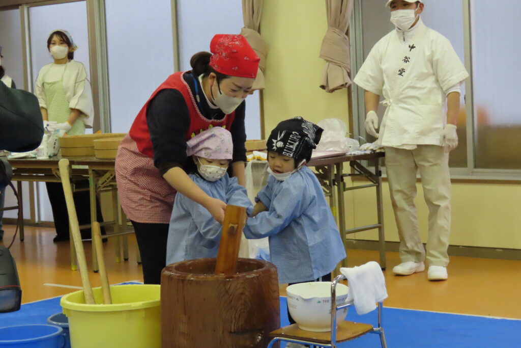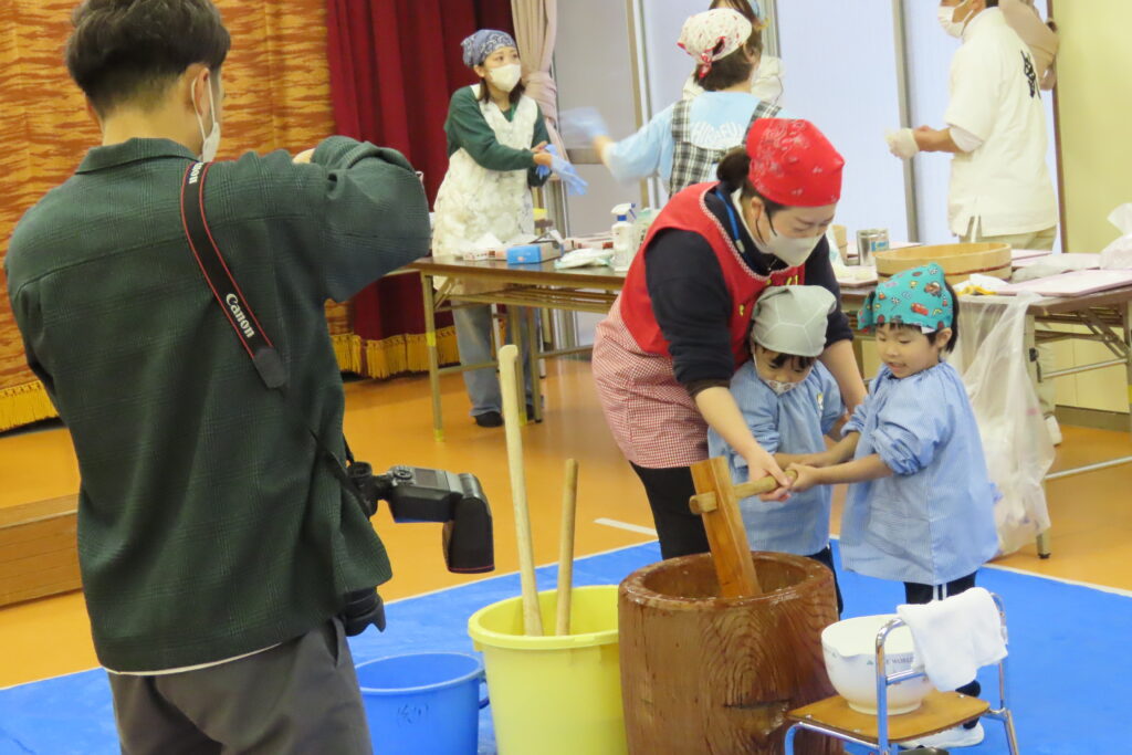 ほぼ搗きあがったところで、仕上げは子どもたちが…。2歳児・満3歳児クラスの「りんご組」さんから順に体験してもらいました。