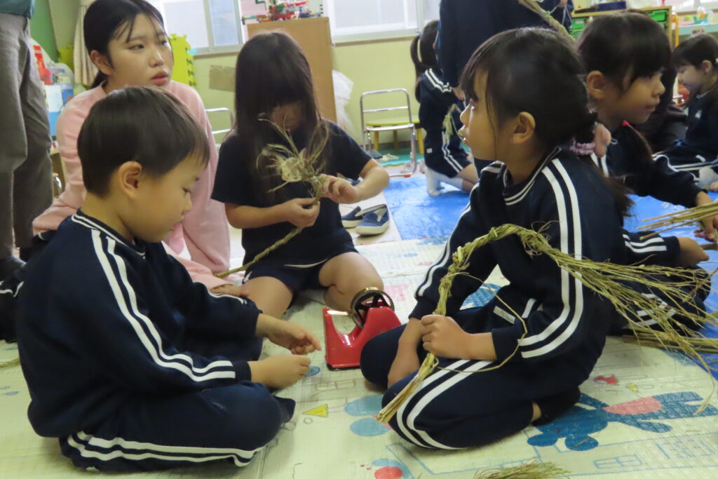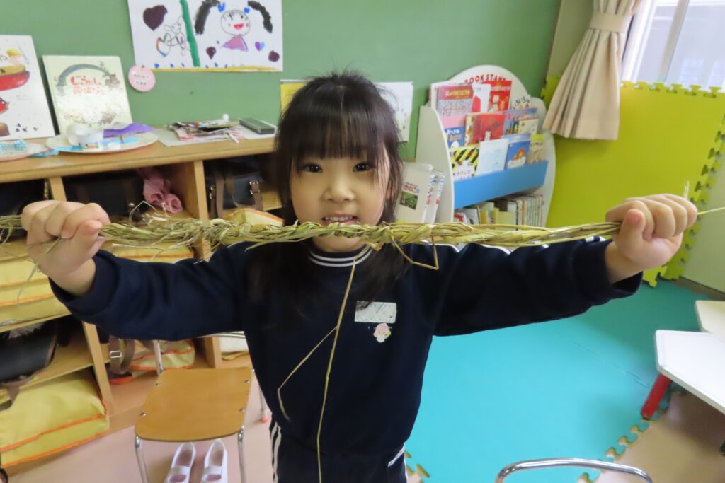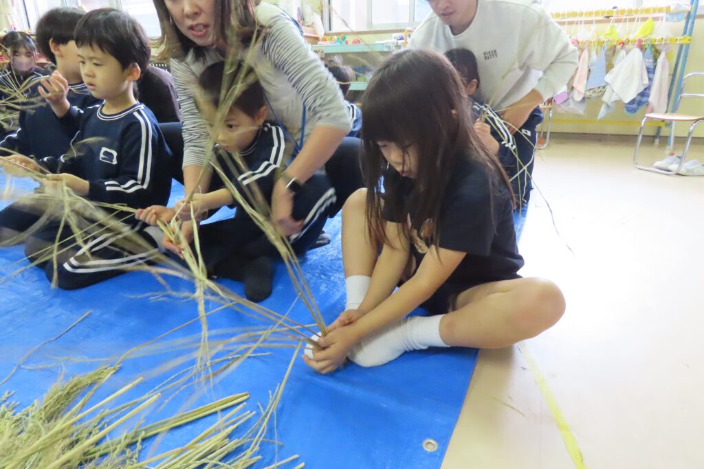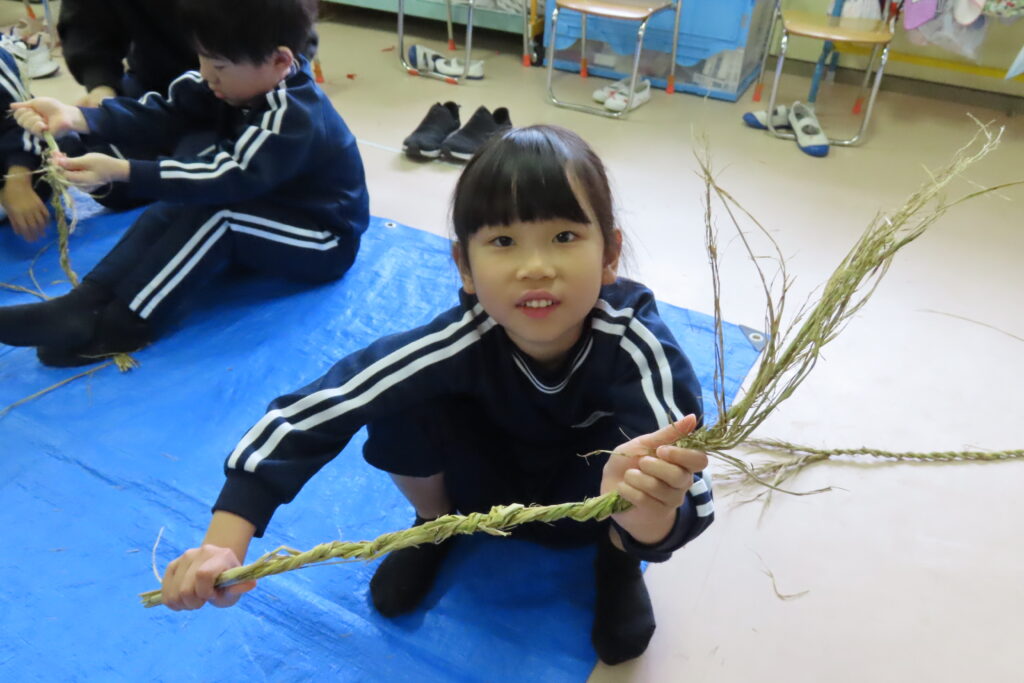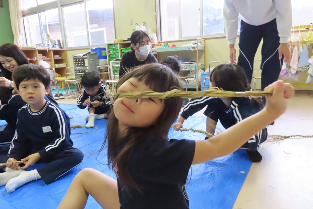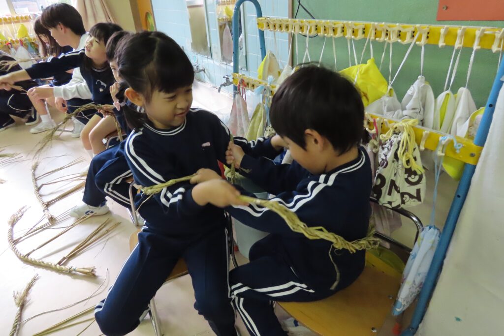 子どもたちは10本の藁を5本ずつに分け、悪戦苦闘しながらがんばって綯っていました。出来上がった縄を使って「つかまえた~。」と言いながら遊ぶのも楽しかったようです。