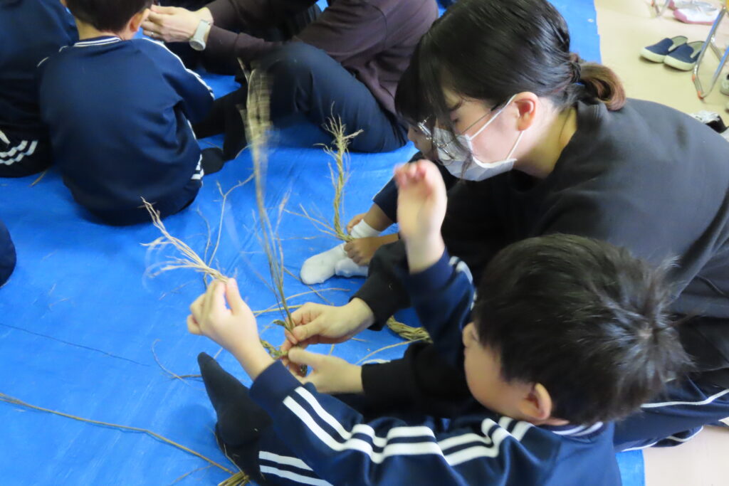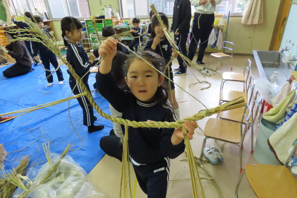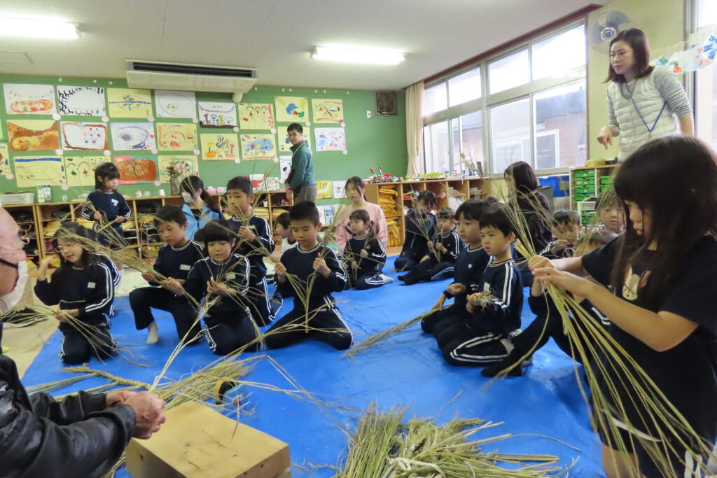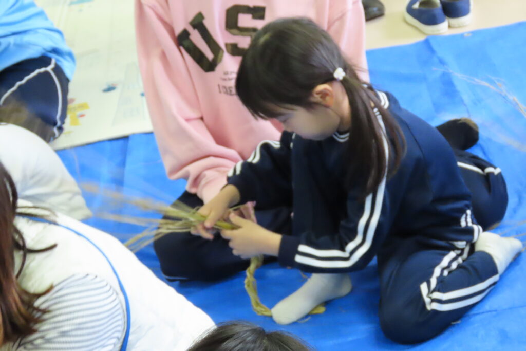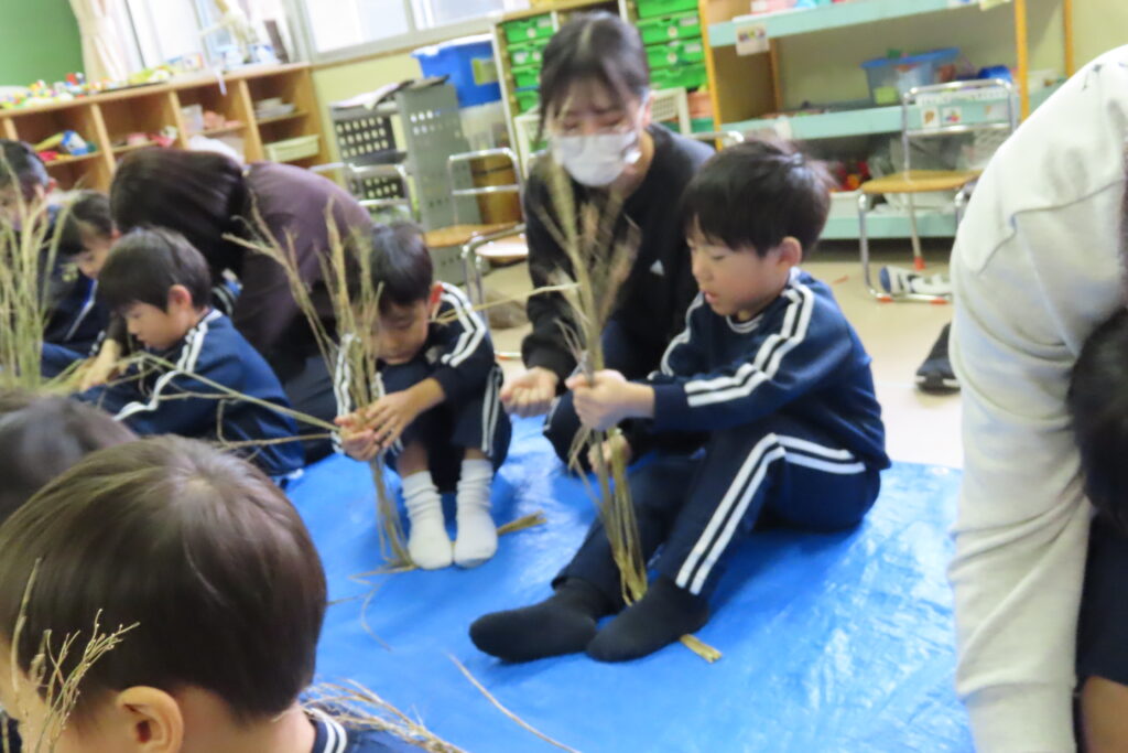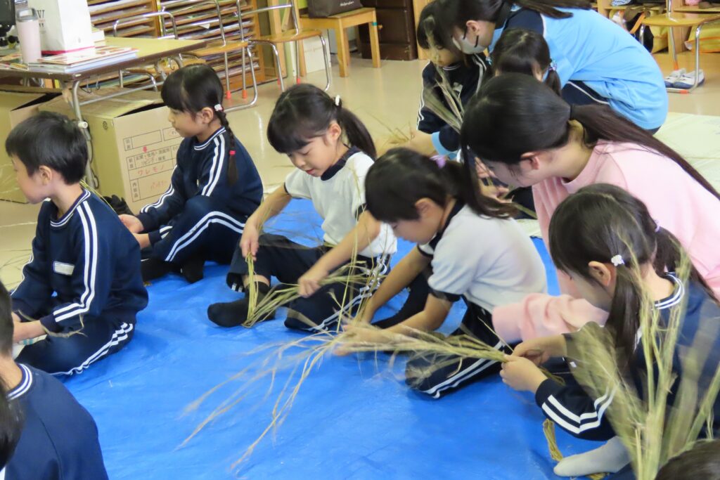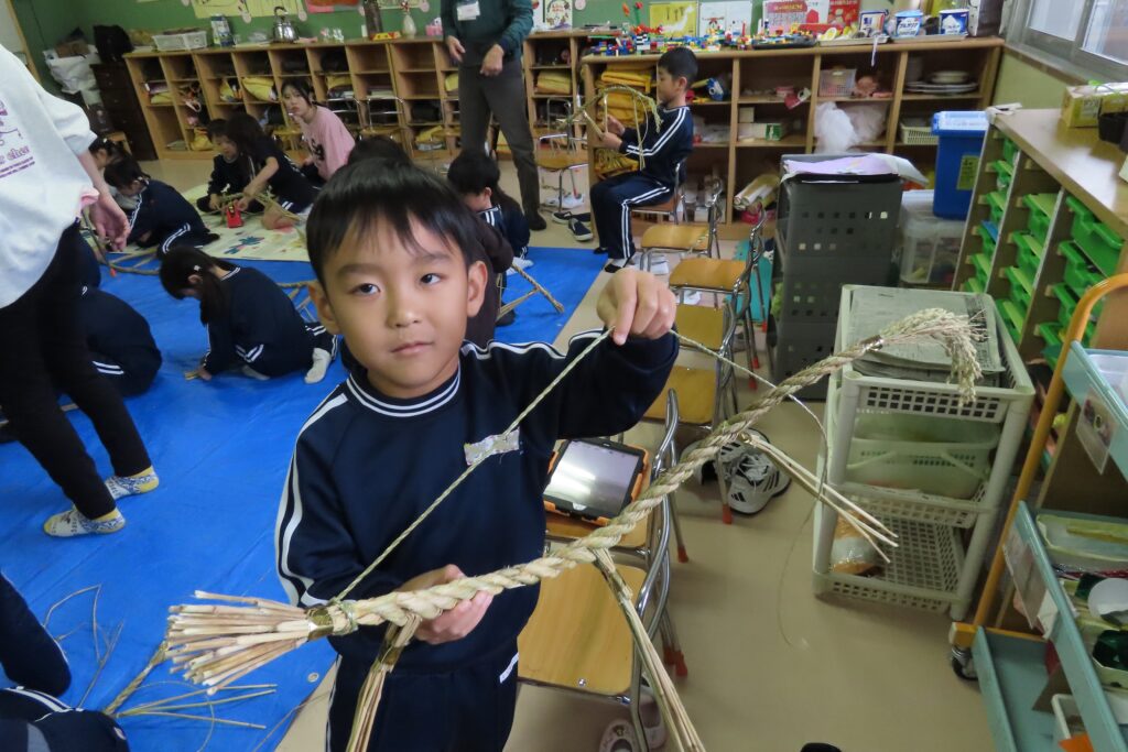 子どもたちは10本の藁を5本ずつに分け、悪戦苦闘しながらがんばって綯っていました。出来上がった縄を使って「つかまえた~。」と言いながら遊ぶのも楽しかったようです。