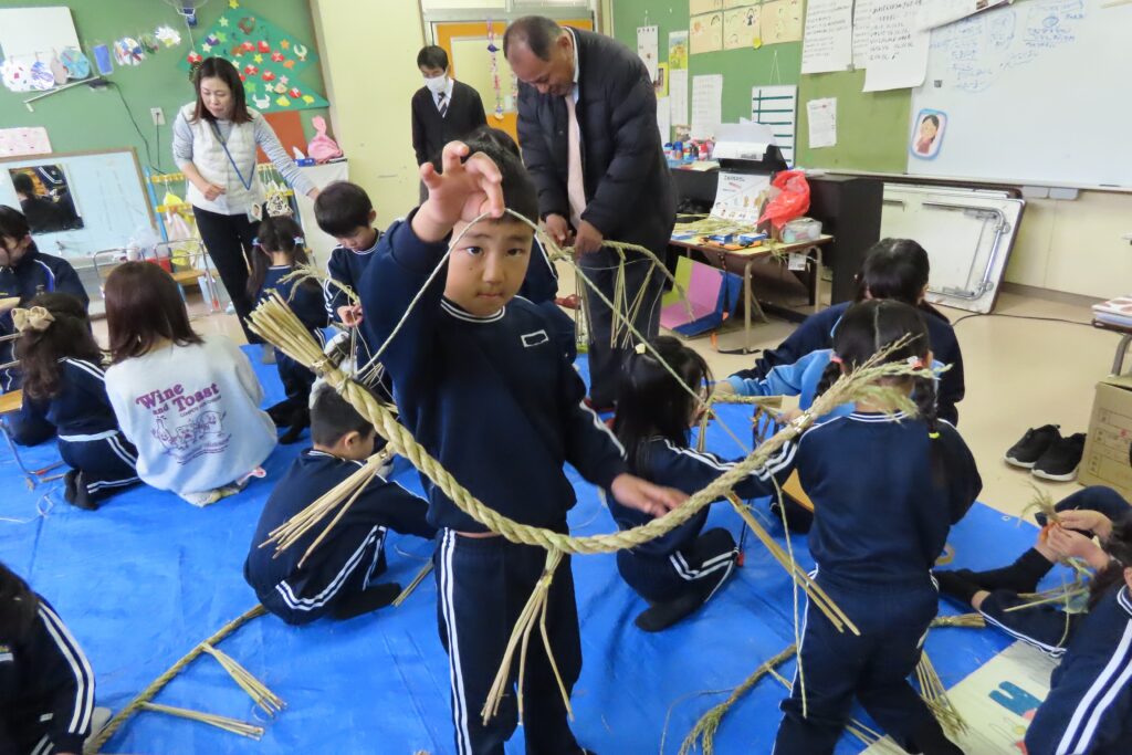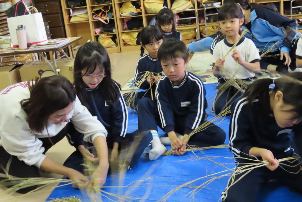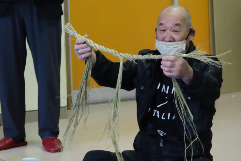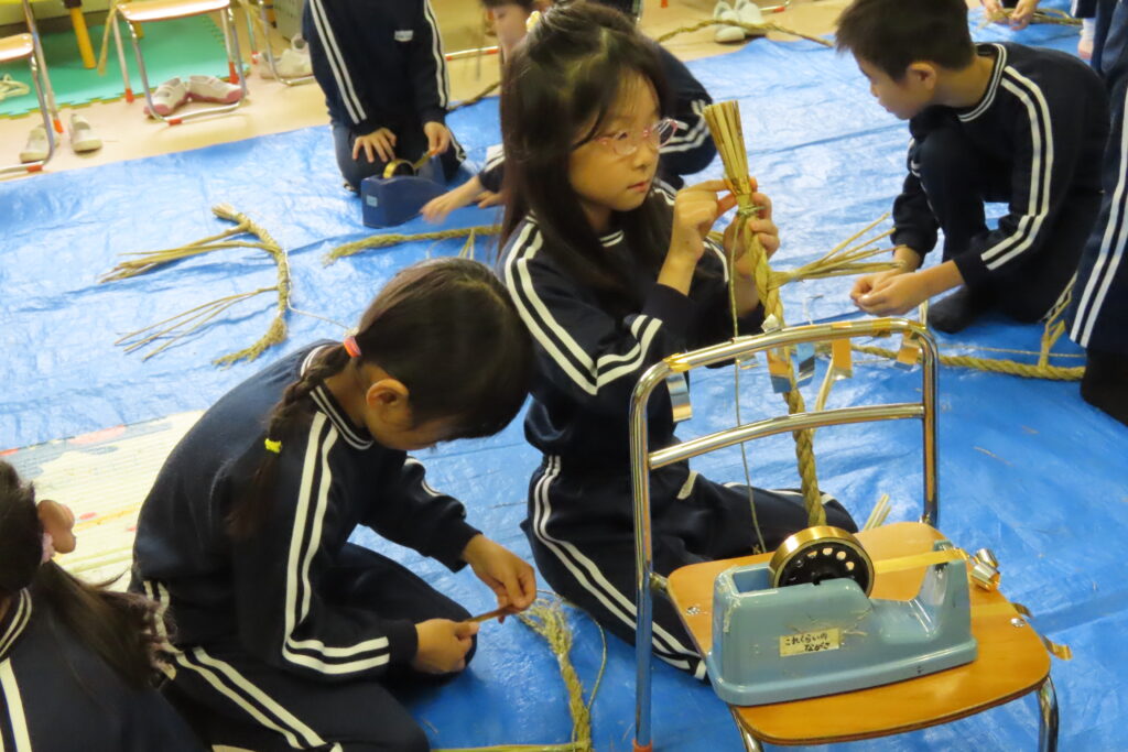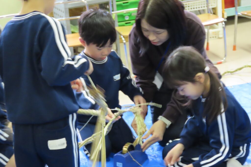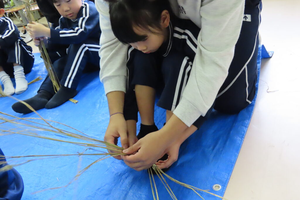 子どもたちは10本の藁を5本ずつに分け、悪戦苦闘しながらがんばって綯っていました。出来上がった縄を使って「つかまえた~。」と言いながら遊ぶのも楽しかったようです。