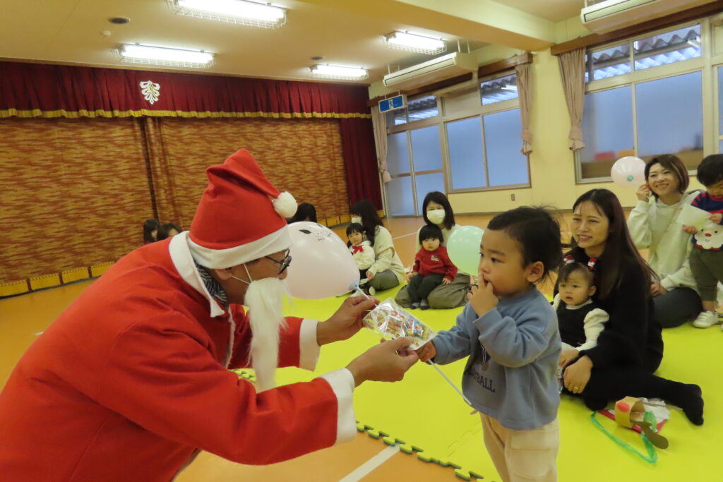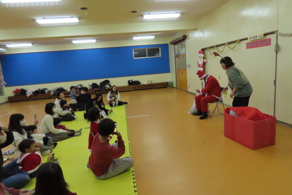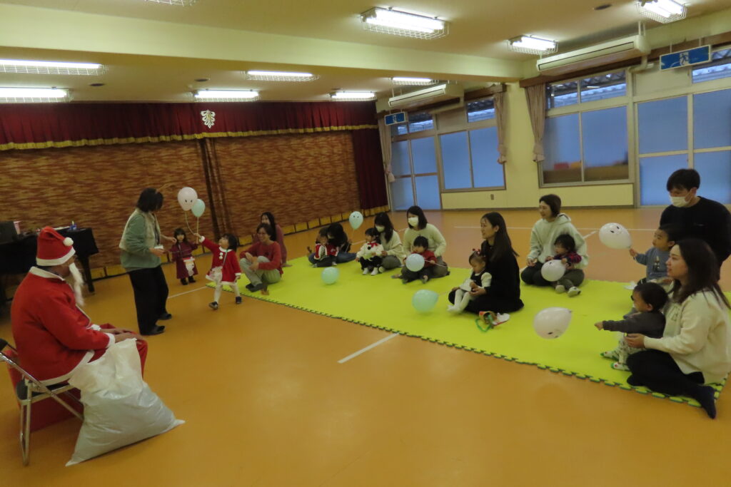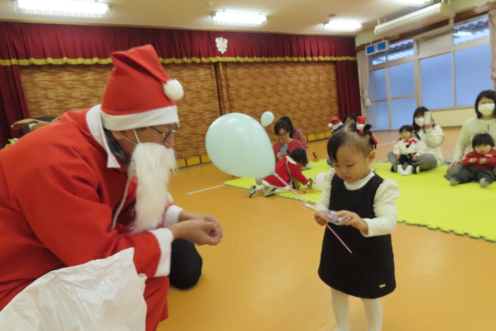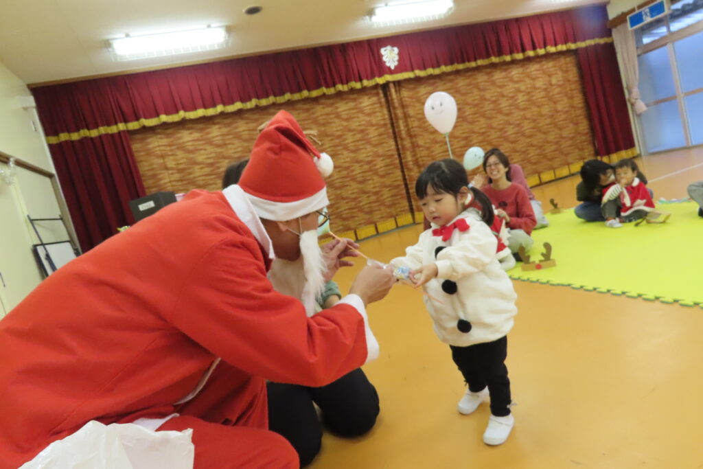 今日の1歳児プレ保育「たんぽぽ組」さんは今年最後の集まりで、「クリスマス会」をしました。親子でサンタのかばんをつくったり「♪赤鼻のトナカイ」を歌ったり、スズやマラカスを使って踊ったりと楽しい時間を過ごしました。 最後にはサンタクロースが登場して子どもたちにプレゼント。楽しい一日になったね。