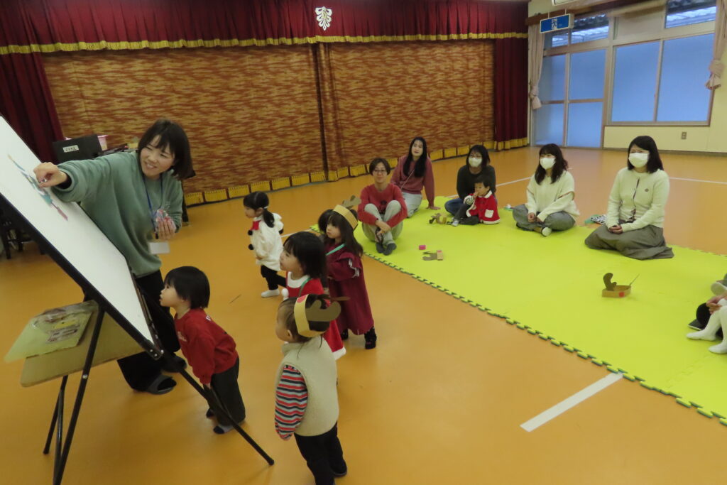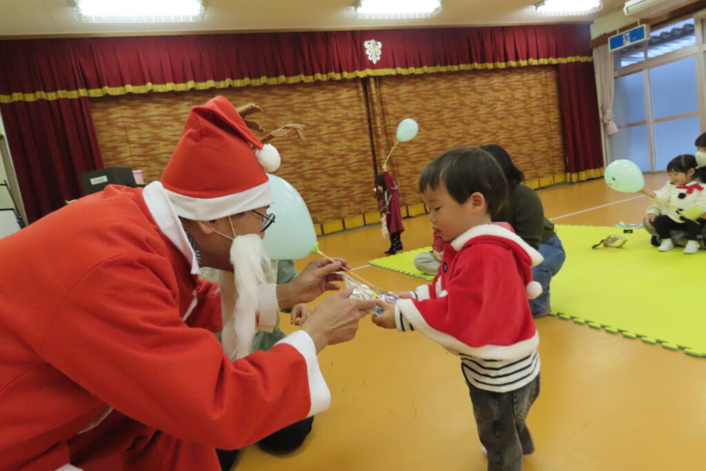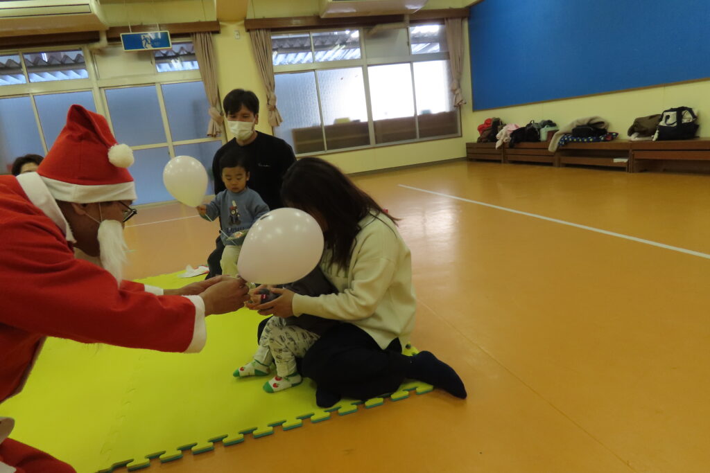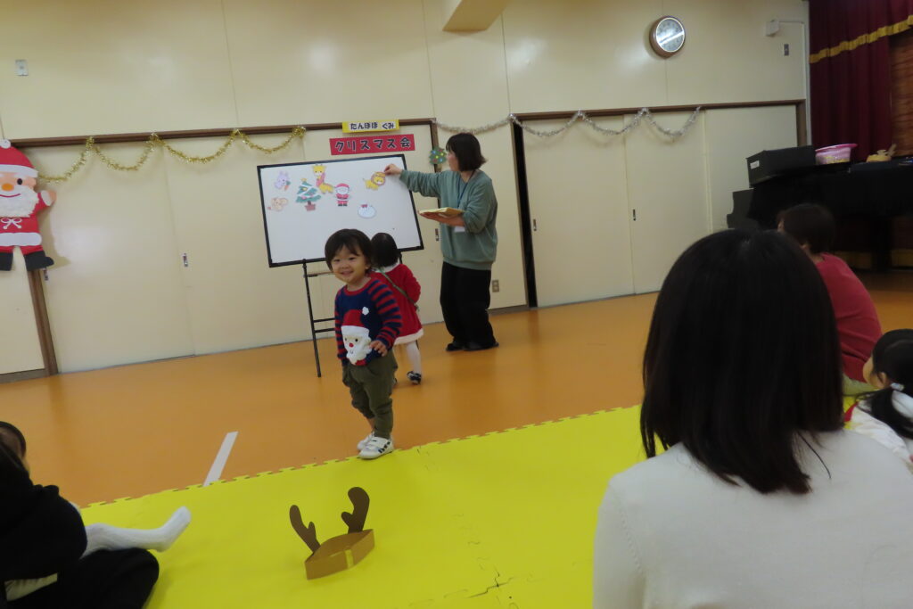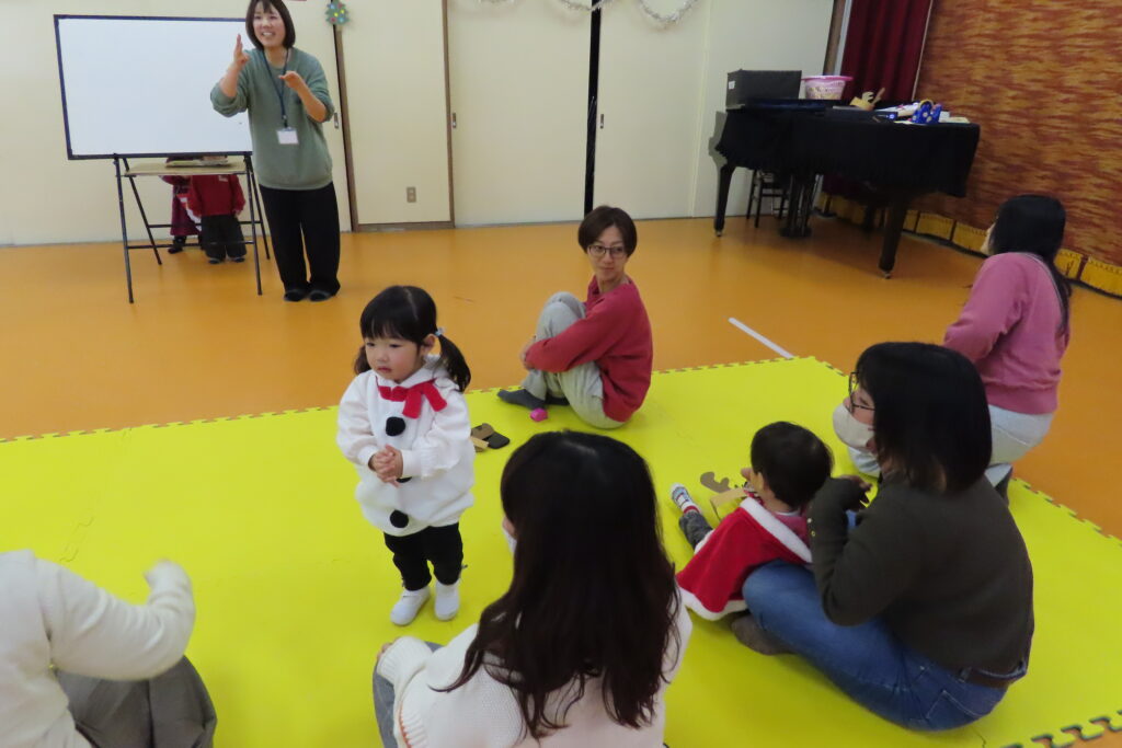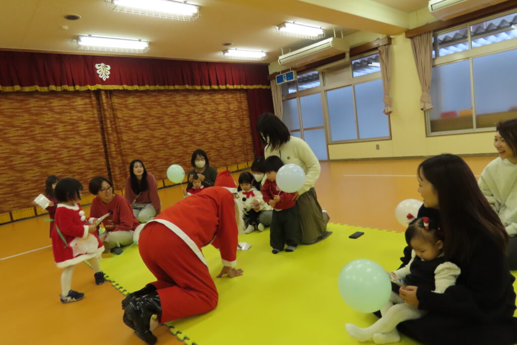 今日の1歳児プレ保育「たんぽぽ組」さんは今年最後の集まりで、「クリスマス会」をしました。親子でサンタのかばんをつくったり「♪赤鼻のトナカイ」を歌ったり、スズやマラカスを使って踊ったりと楽しい時間を過ごしました。 最後にはサンタクロースが登場して子どもたちにプレゼント。楽しい一日になったね。