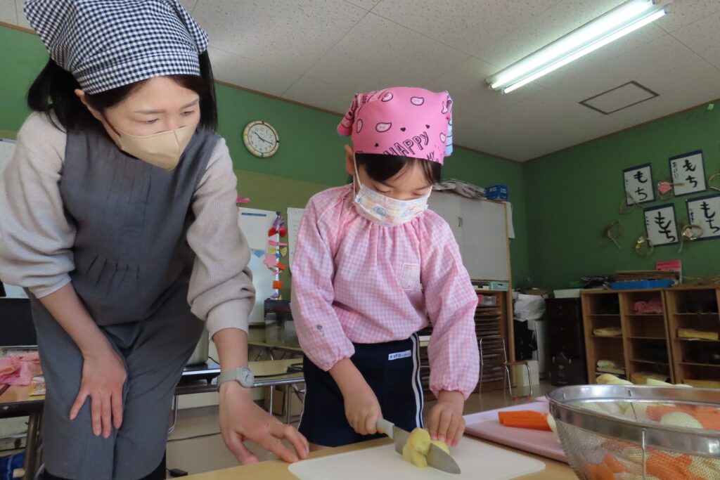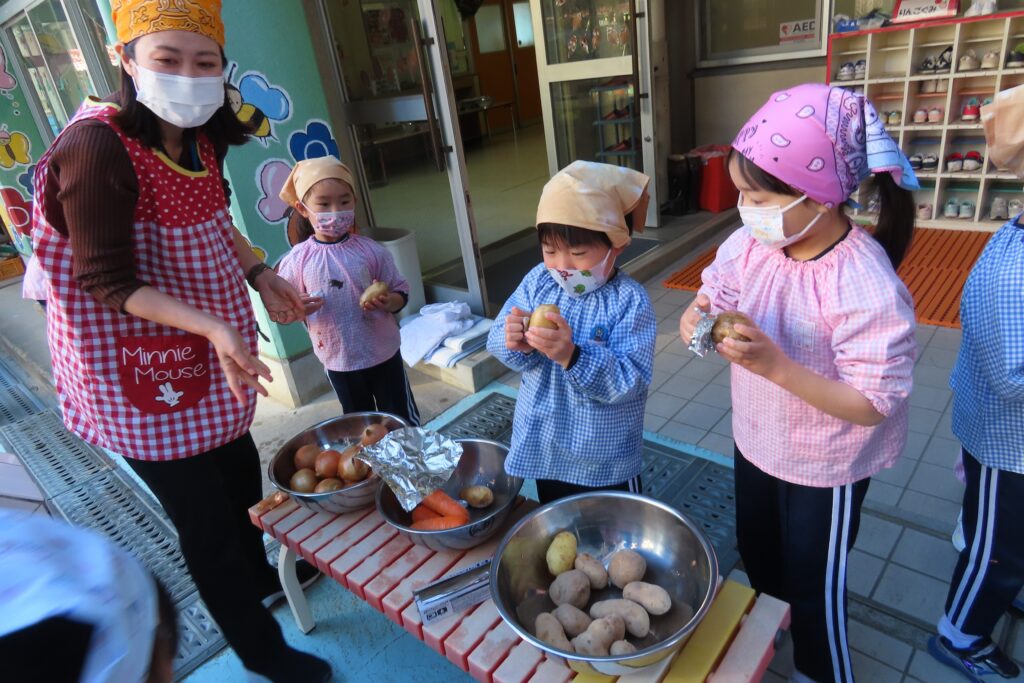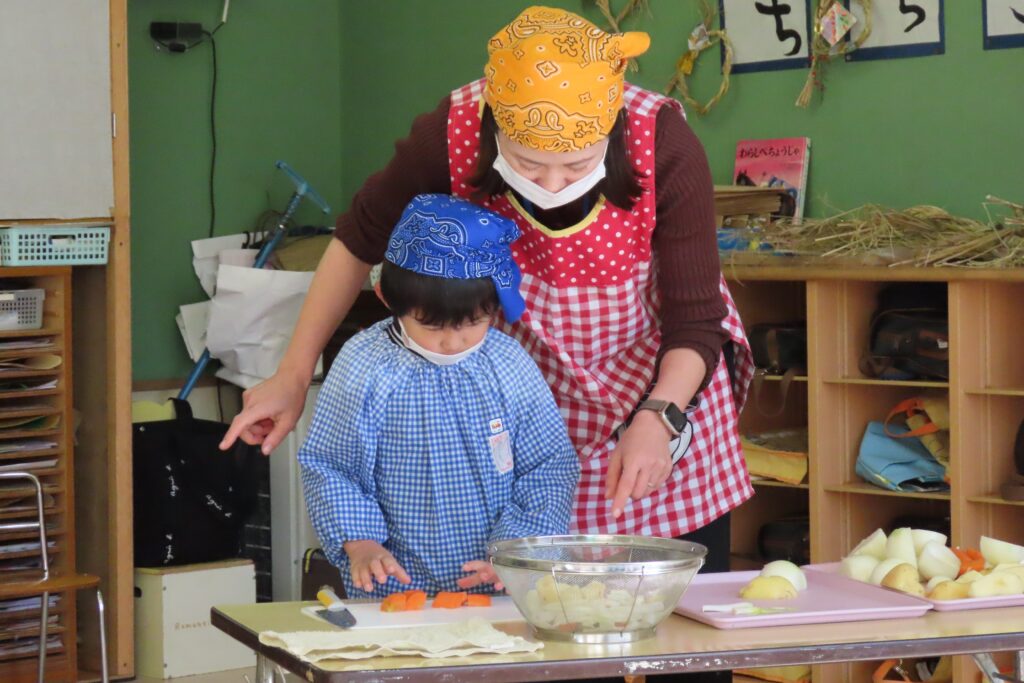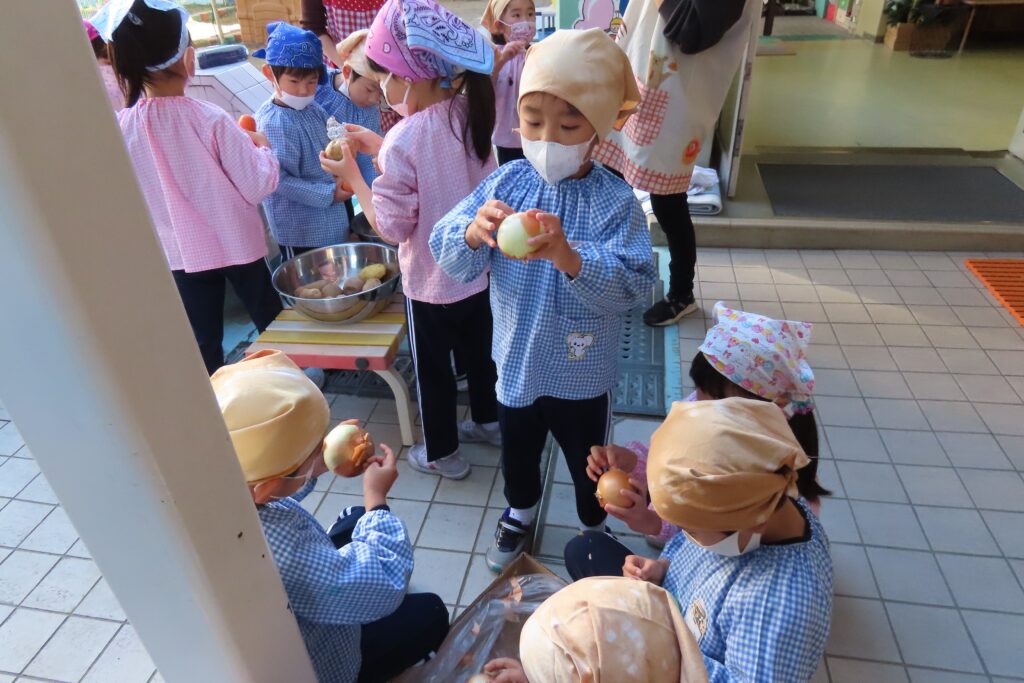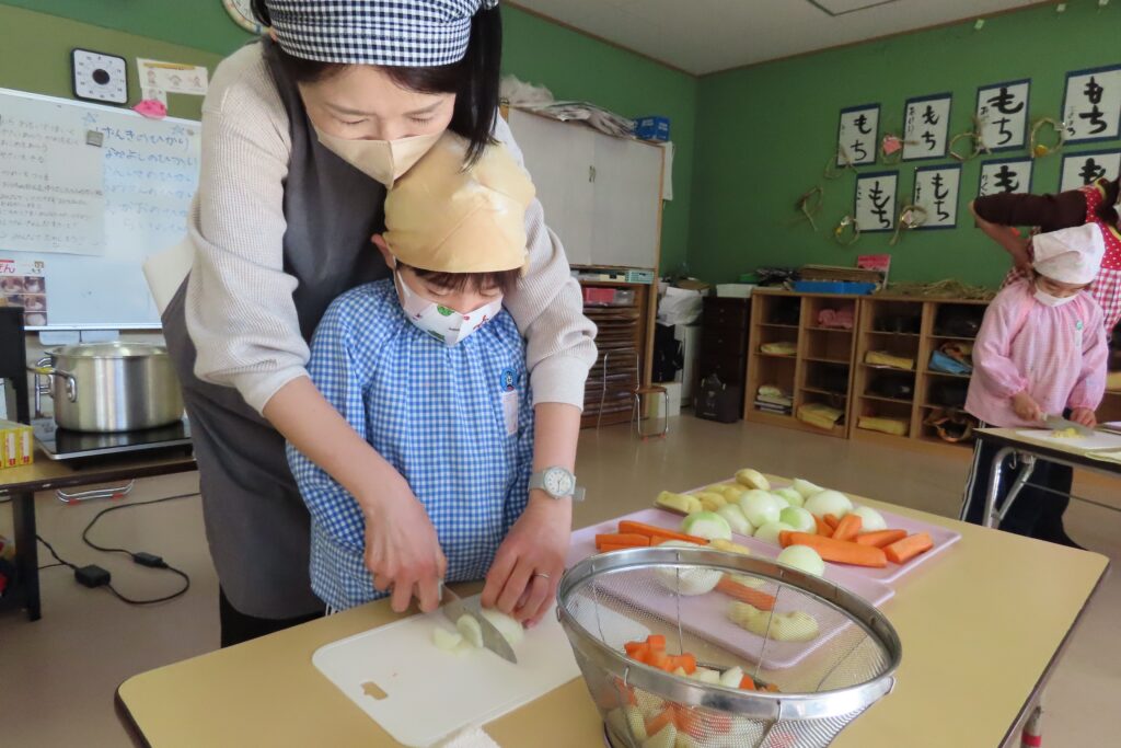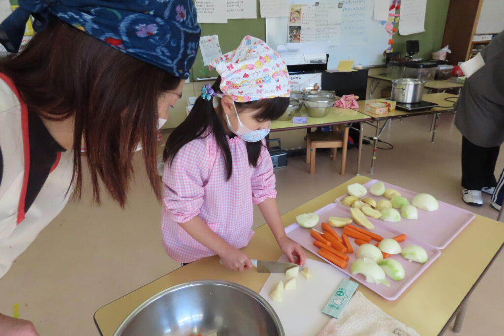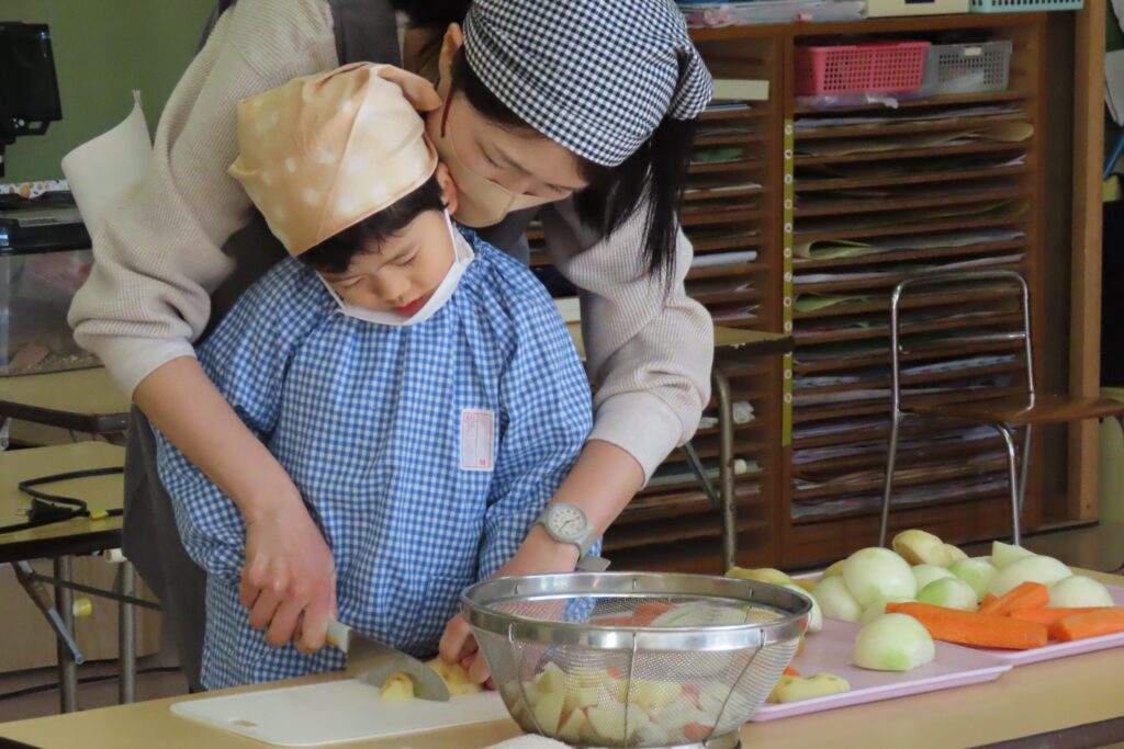今日は、「つき組」さんの思い出保育。保護者の皆様を子どもたちお手製のカレーライスでおもてなし。カレーのメニューも中に入れる具材も子どもたちが選びました。今朝は最低気温が0度という厳しい寒さの日でしたが、子どもたちは「水が冷たい!」と言いながら、一生懸命野菜を洗い、お米を研いでくれました。