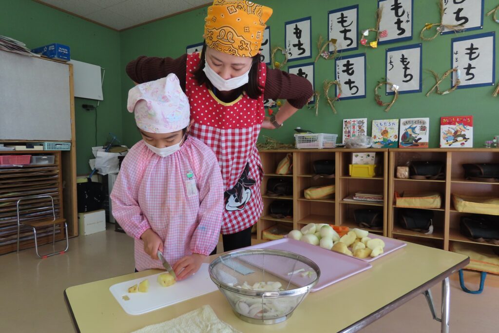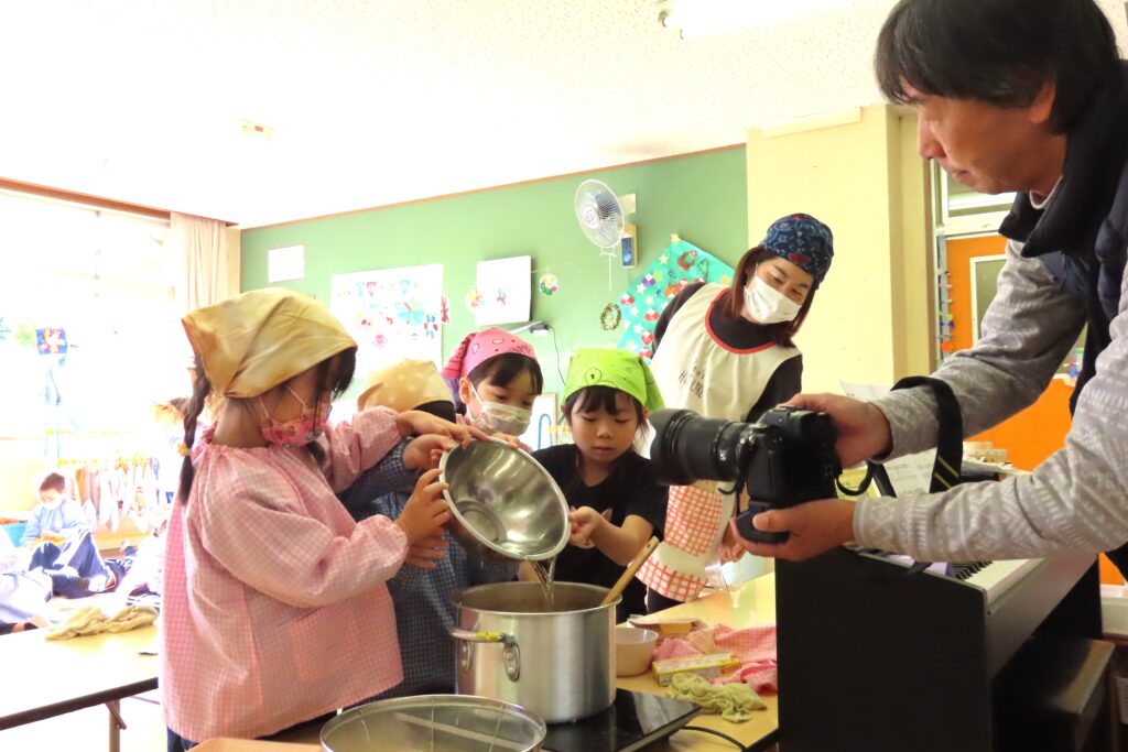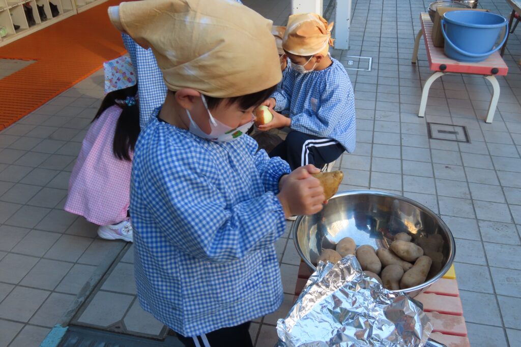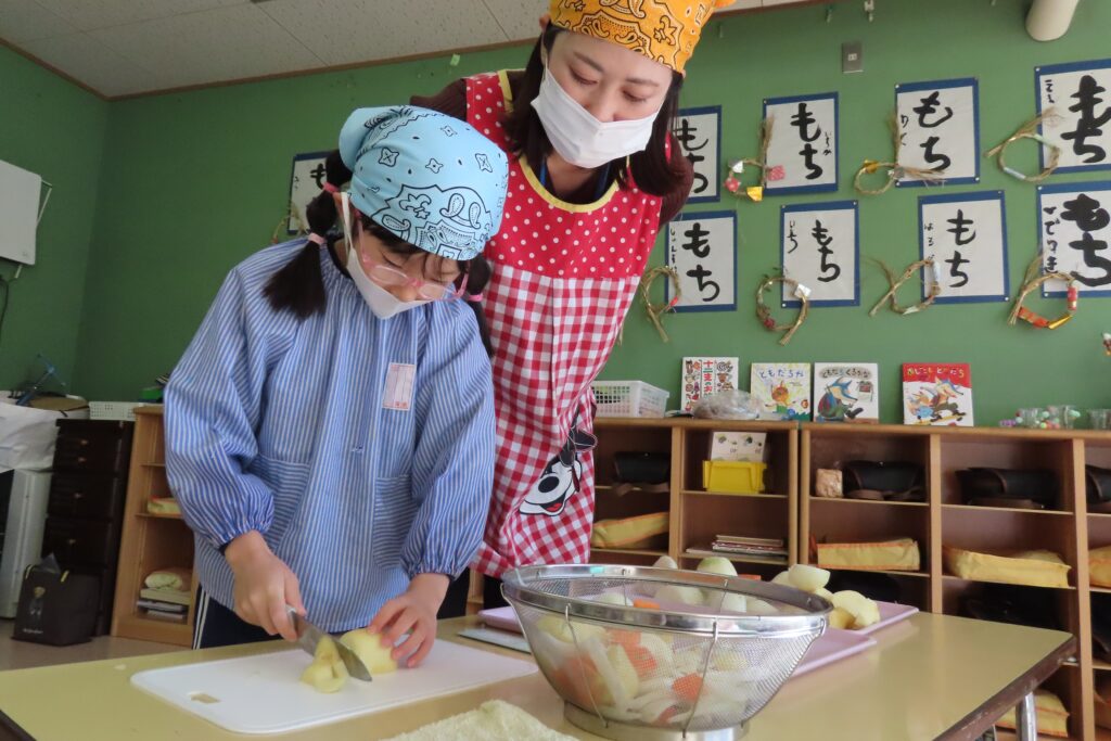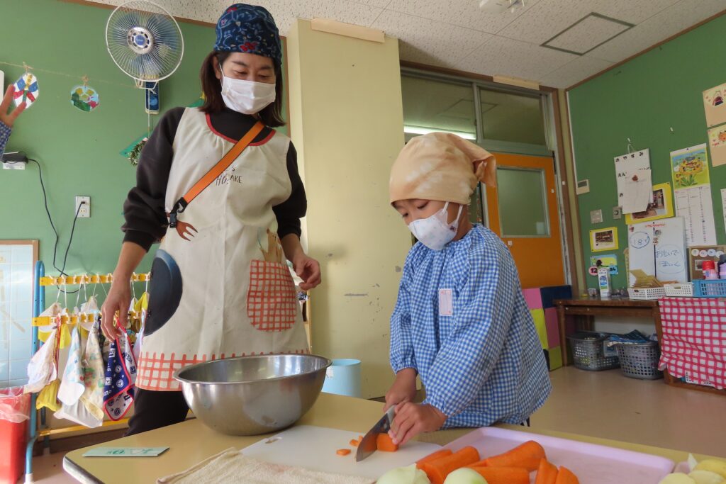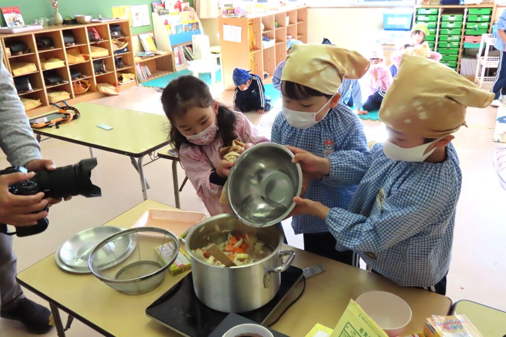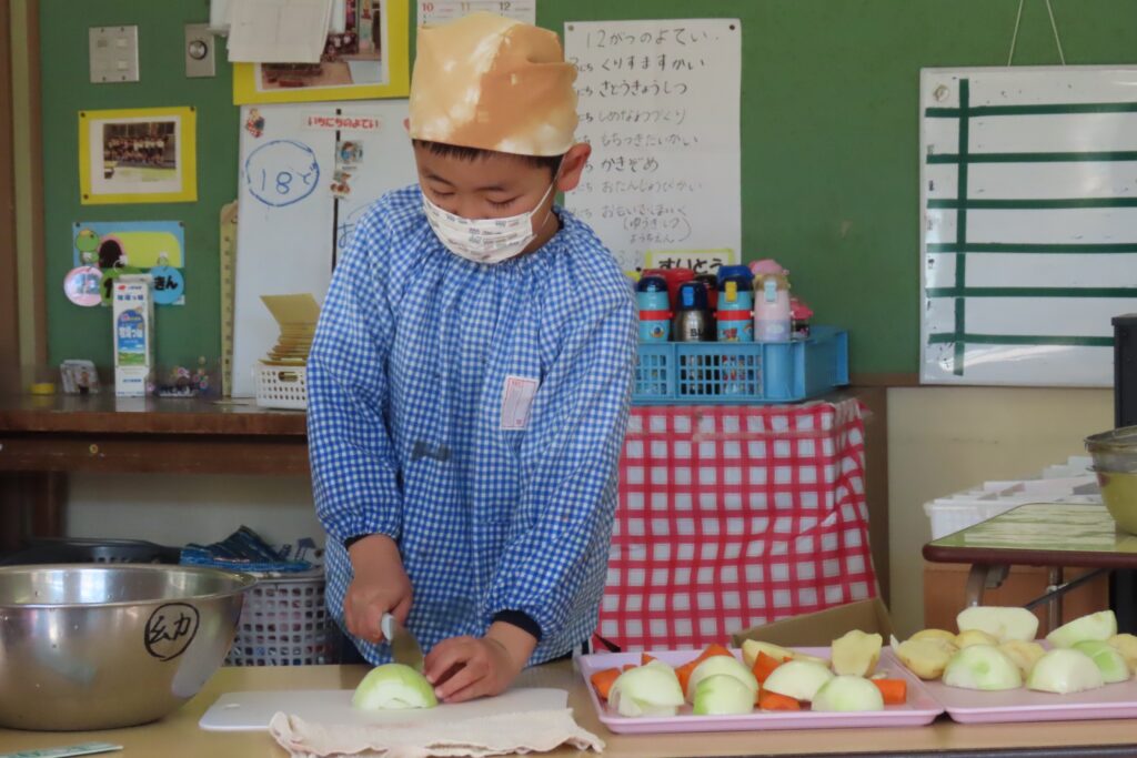 今日は、「つき組」さんの思い出保育。保護者の皆様を子どもたちお手製のカレーライスでおもてなし。カレーのメニューも中に入れる具材も子どもたちが選びました。今朝は最低気温が0度という厳しい寒さの日でしたが、子どもたちは「水が冷たい!」と言いながら、一生懸命野菜を洗い、お米を研いでくれました。