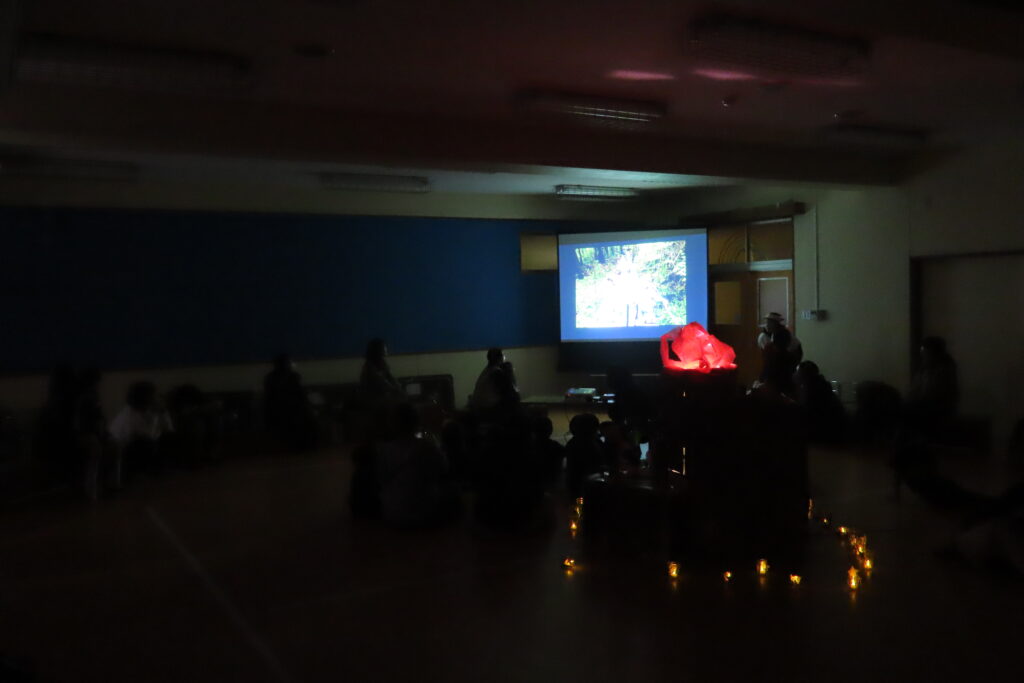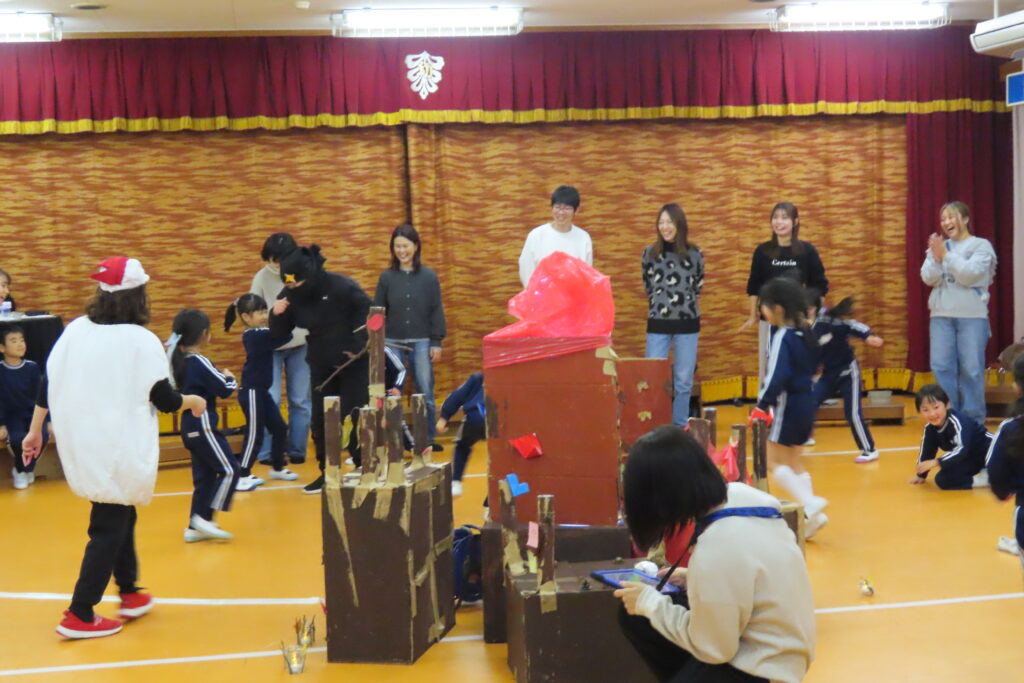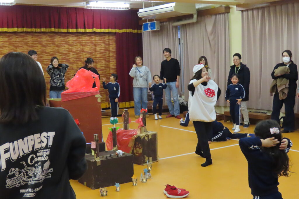 この後は、お待ちかねのキャンプファイヤー。と言っても室内の「森」ですので火は使えません。そこでライトホルダーを使ったキャンドルサービスで行いました。遊戯室の中を暗くして、子どもたちが「光」の神様といっしょに入場です。そのセレモニーの写真はありませんが、子どもたちの「光」が一つになって部屋が明るくなった後の楽しい時間の様子をご紹介します。