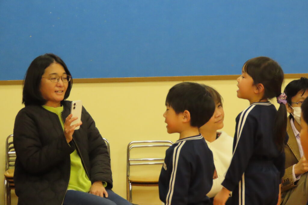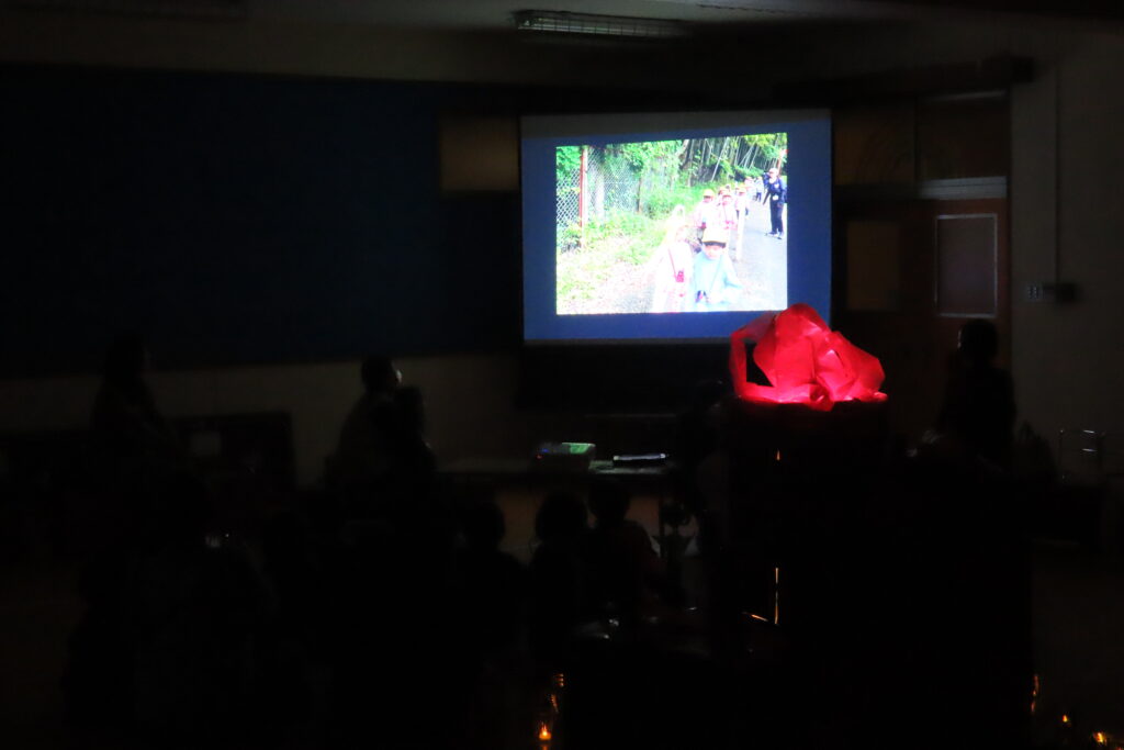 楽しいひとときを過ごした後は「森の教室」を中心にスライドショーを…。子どもたちの活用の様子を見ていただきました。後半は、懐かしい年少「さくら組」さんのときの写真や年中「ほし組」さんのときの写真も交えてこの3年間を振り返っていただきました。