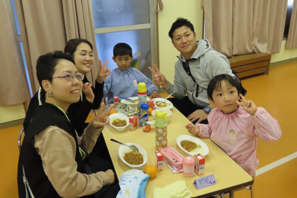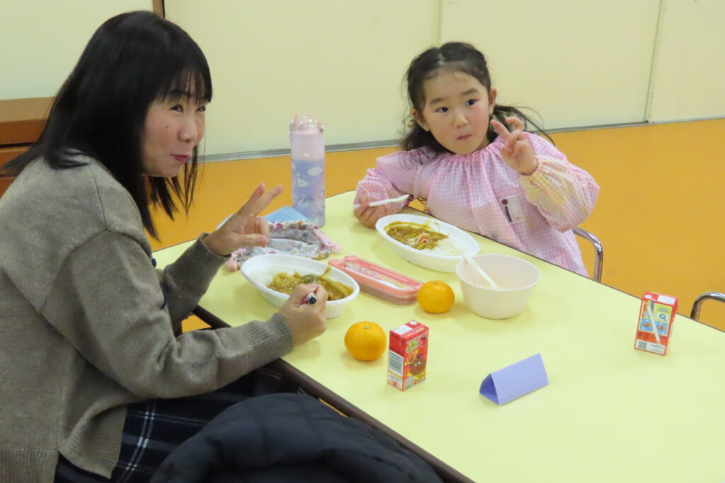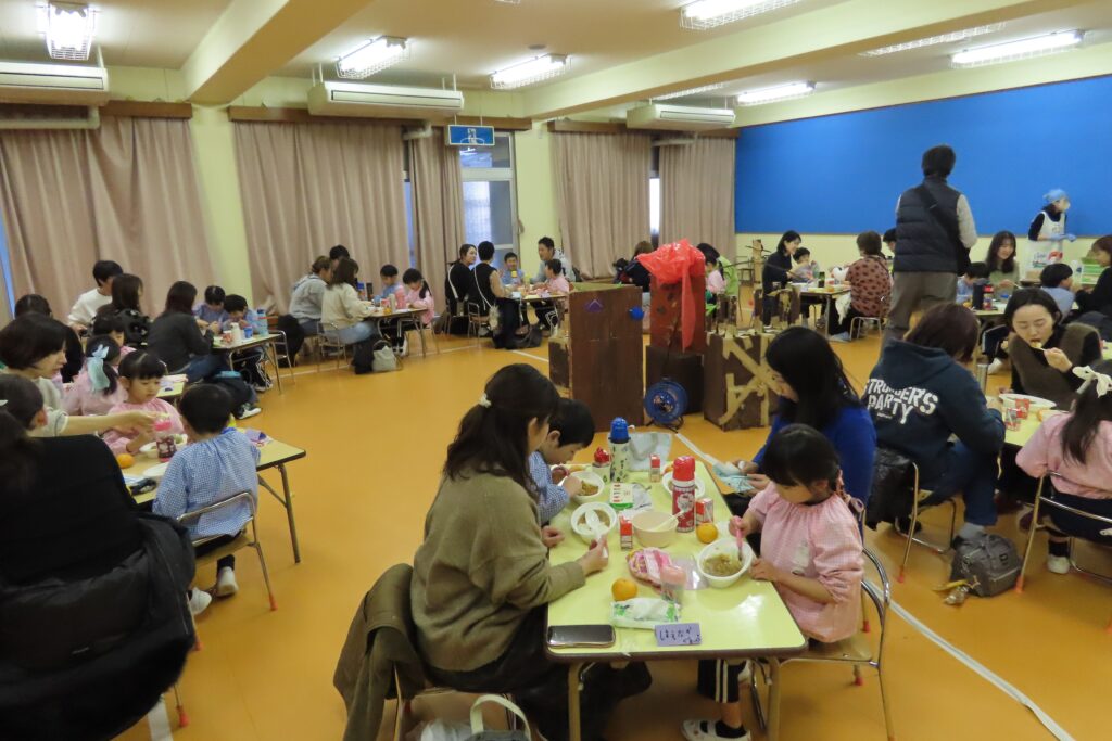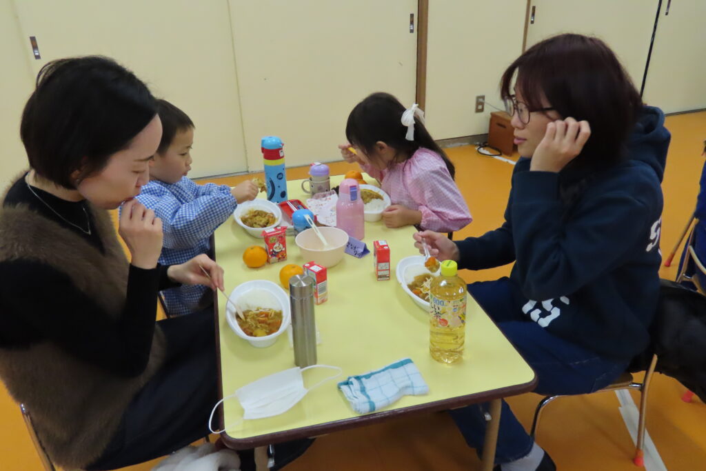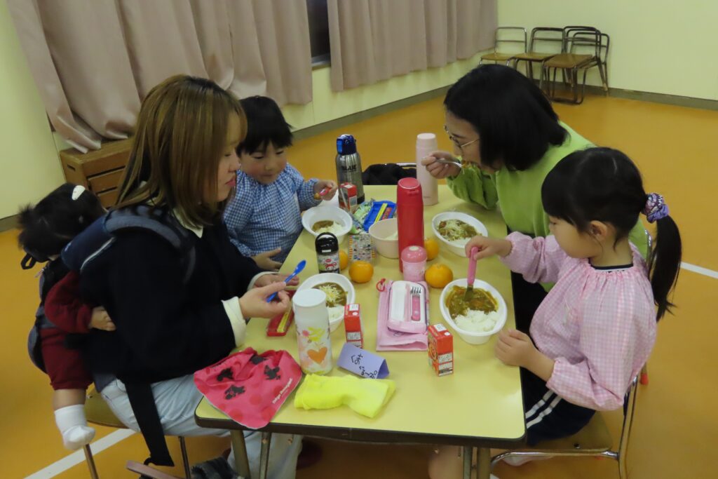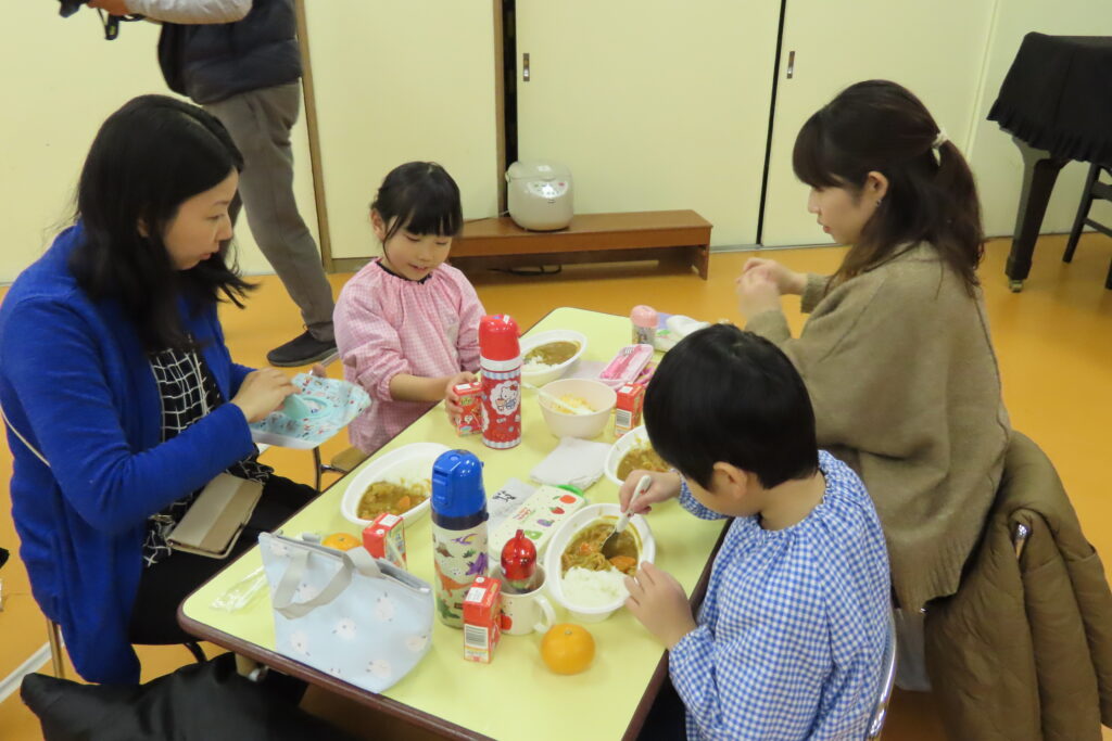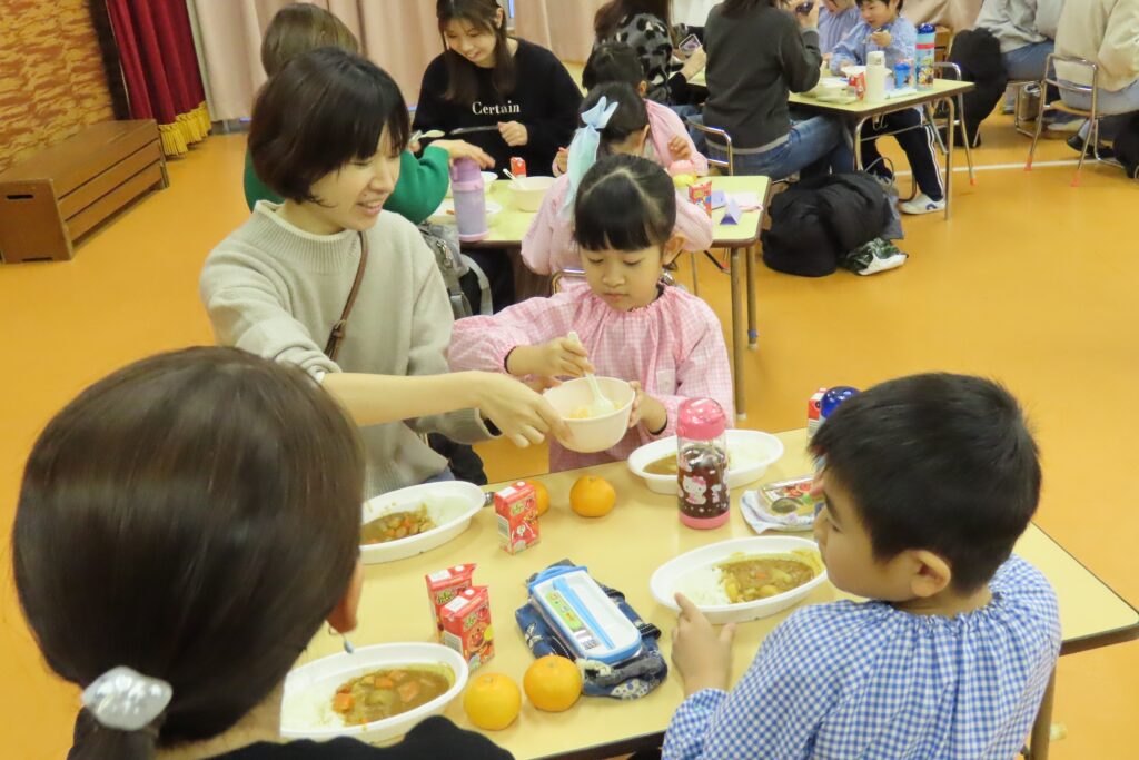 予定通り12時にはランチタイムが始まりました。場所はいつもの遊戯室・・・ですが、ちょっと雰囲気が違います。子どもたちが遊戯室を森のキャンプ場にして、その周りでいただきます。アツアツのカレーと炊き立てのご飯。子どもたちが作った森のキャンプ場で、お家の人といっしょに楽しく食べました。
