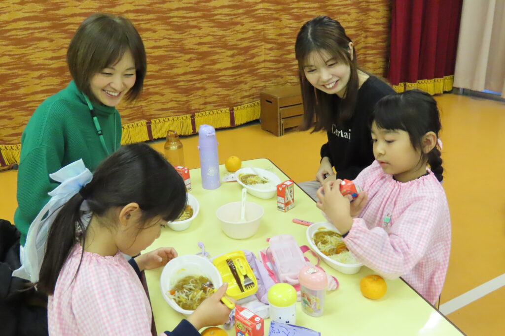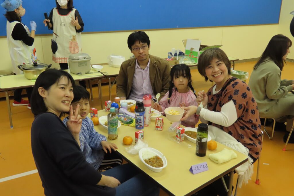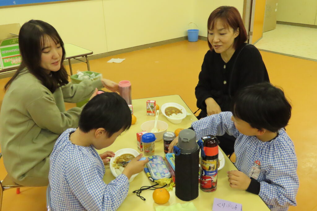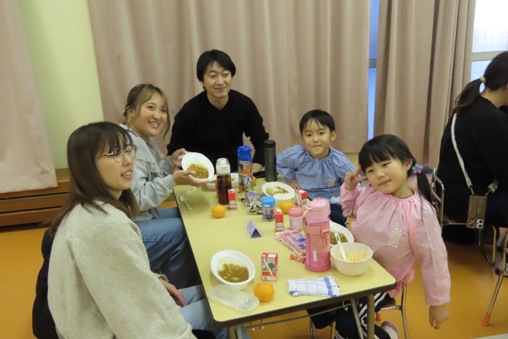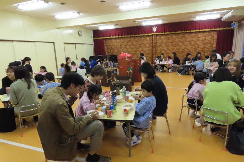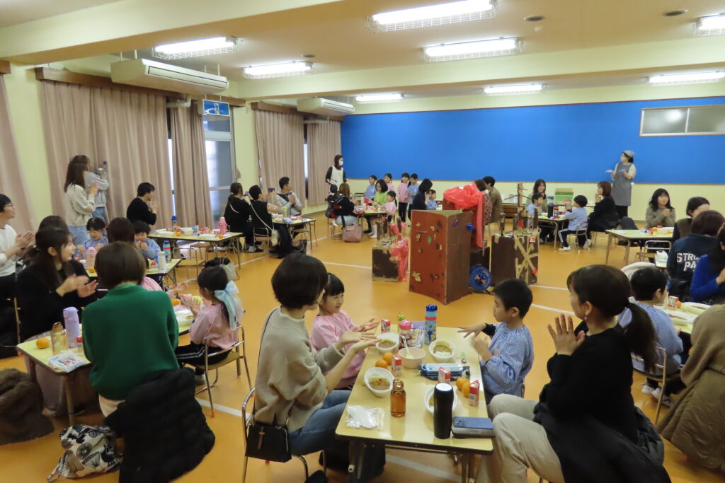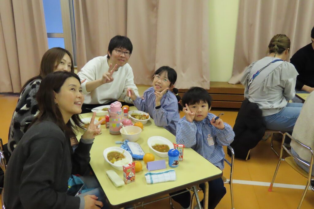 予定通り12時にはランチタイムが始まりました。場所はいつもの遊戯室・・・ですが、ちょっと雰囲気が違います。子どもたちが遊戯室を森のキャンプ場にして、その周りでいただきます。アツアツのカレーと炊き立てのご飯。子どもたちが作った森のキャンプ場で、お家の人といっしょに楽しく食べました。