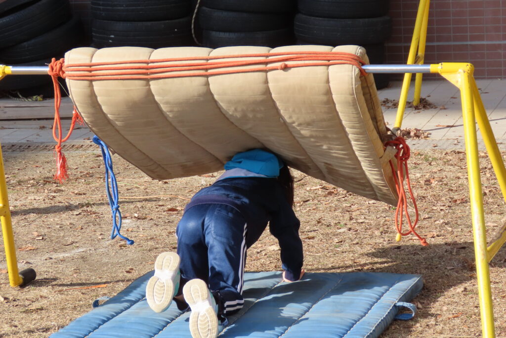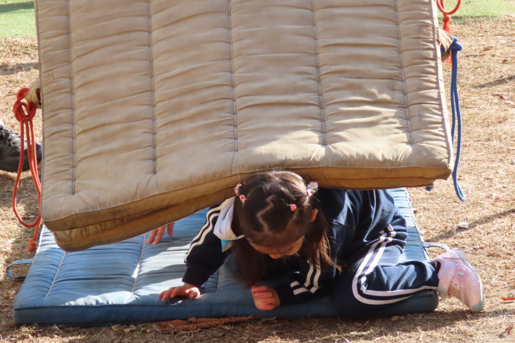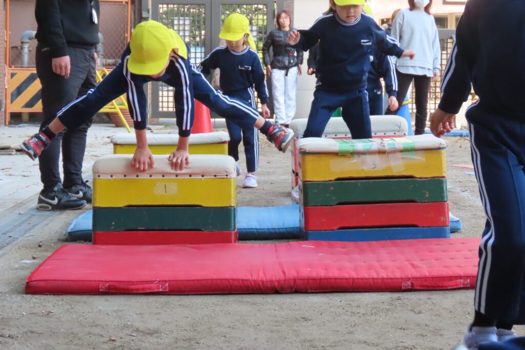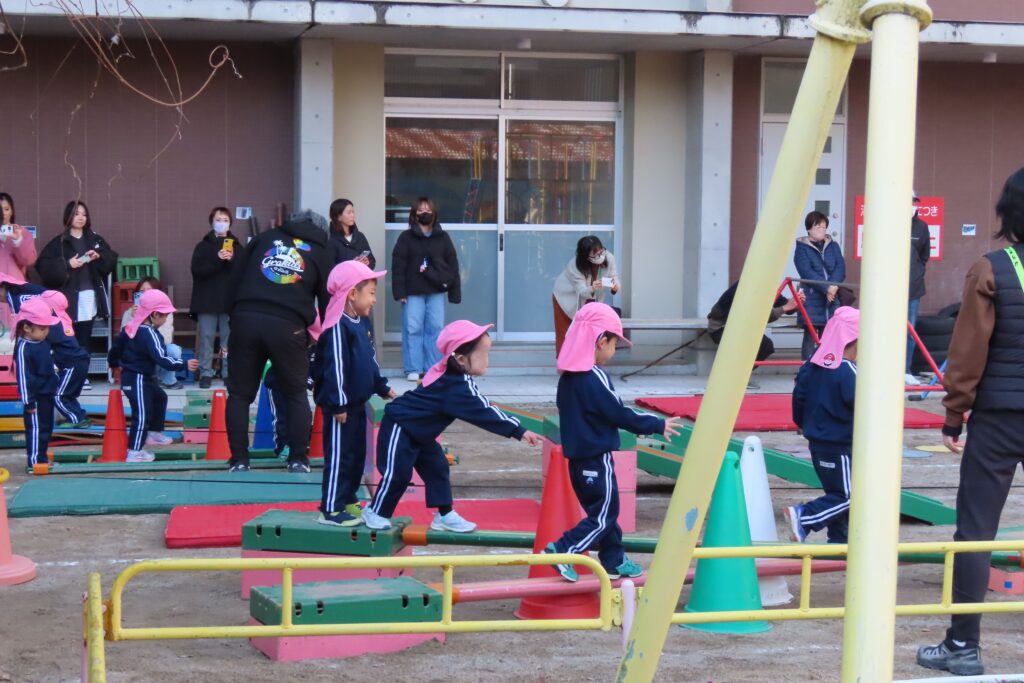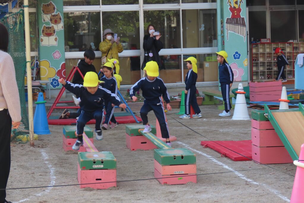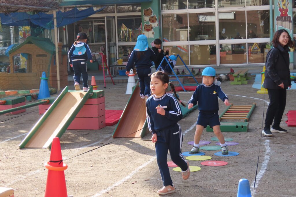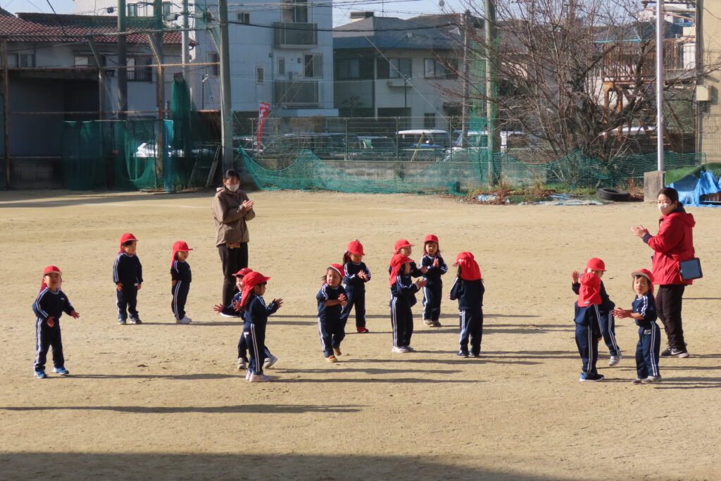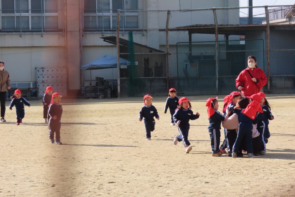りんご組さんは、運動場でかけっこの様子です。ちょっと遠景になってしまいますが…。