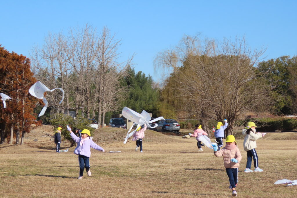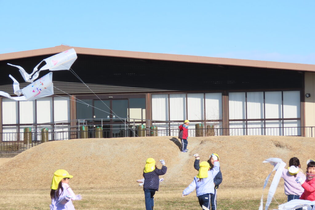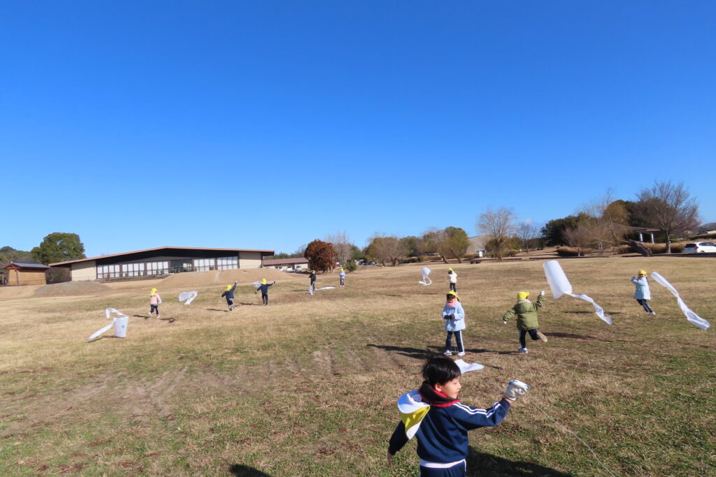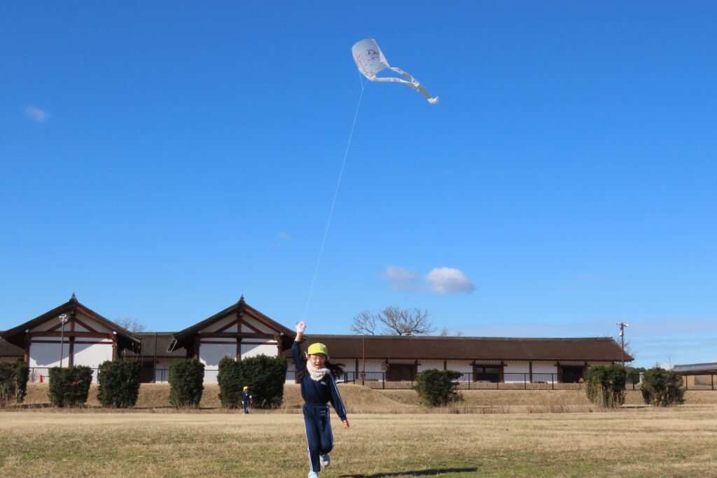 今日は朝からなかなか気温が上がらなかったのですが、日中は日が差し風も穏やかであまり寒さを感じない一日となりました。そうしたなか、年長「つき組」さんは平城宮跡まで凧揚げに行ってきました。