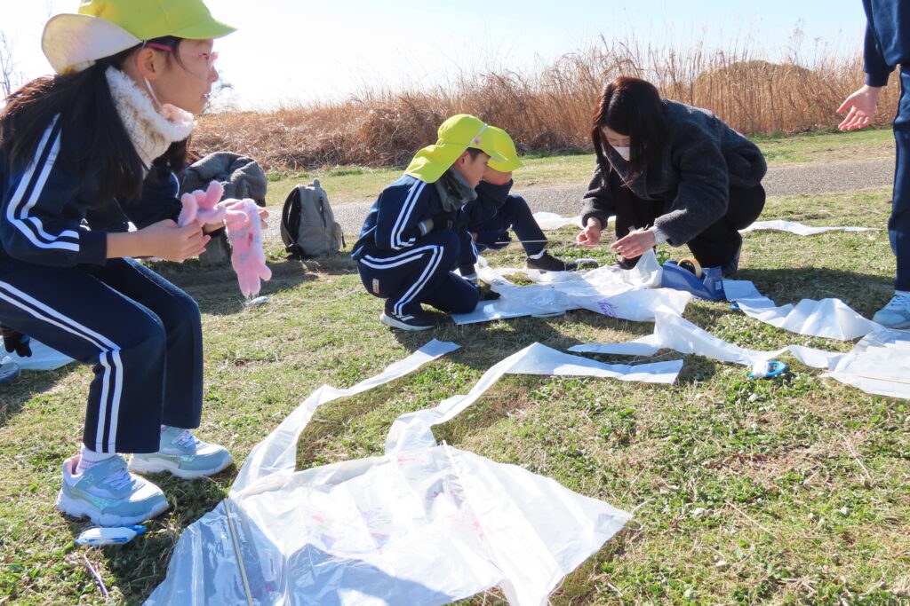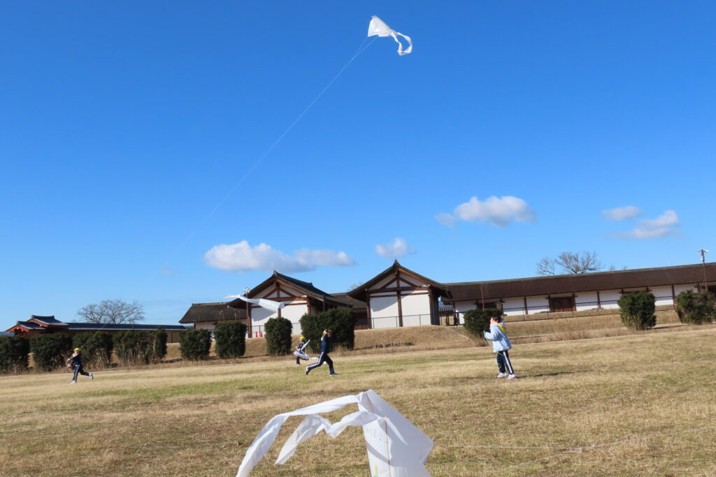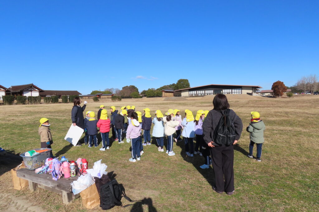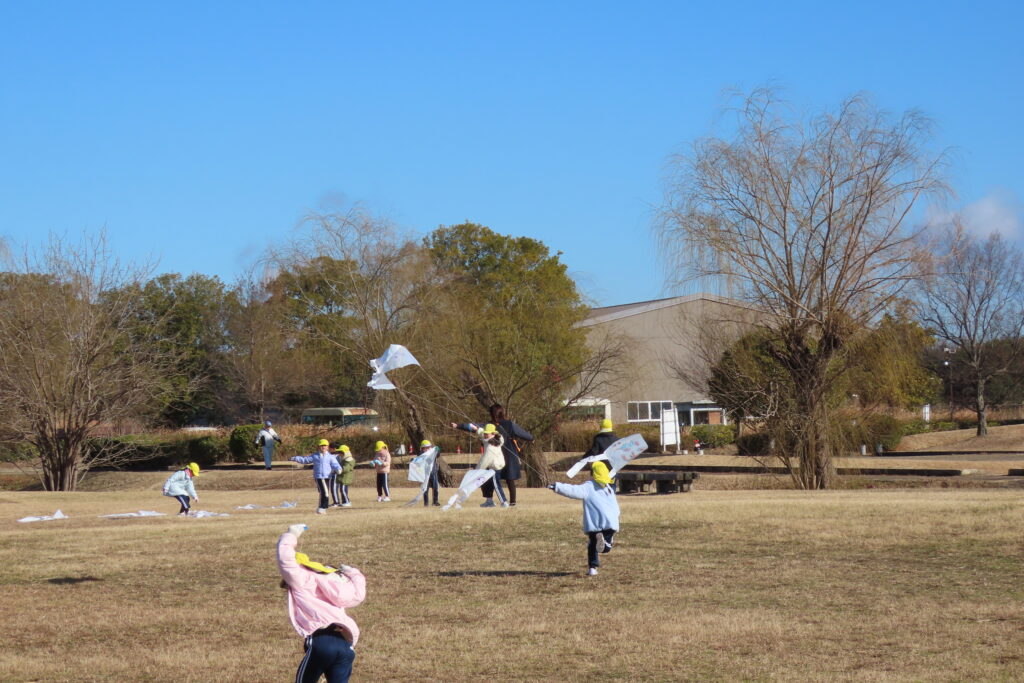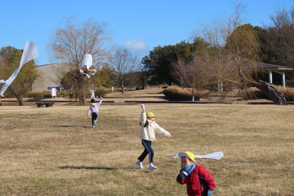 今日は朝からなかなか気温が上がらなかったのですが、日中は日が差し風も穏やかであまり寒さを感じない一日となりました。そうしたなか、年長「つき組」さんは平城宮跡まで凧揚げに行ってきました。