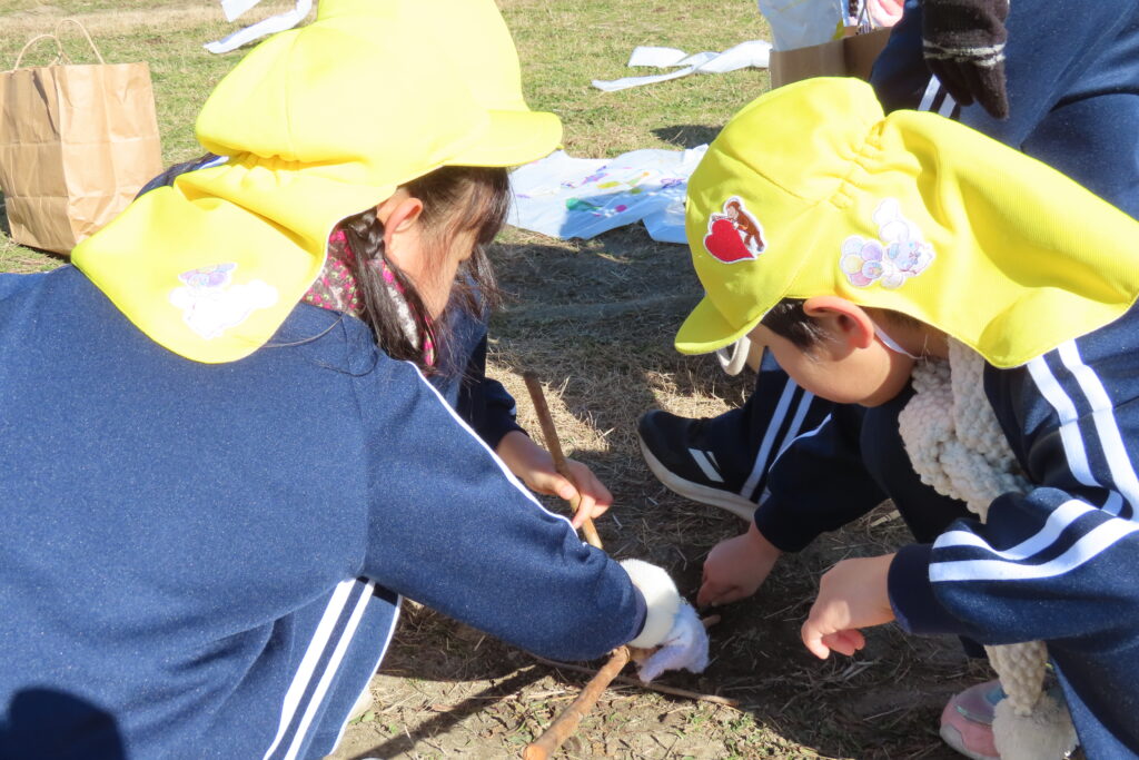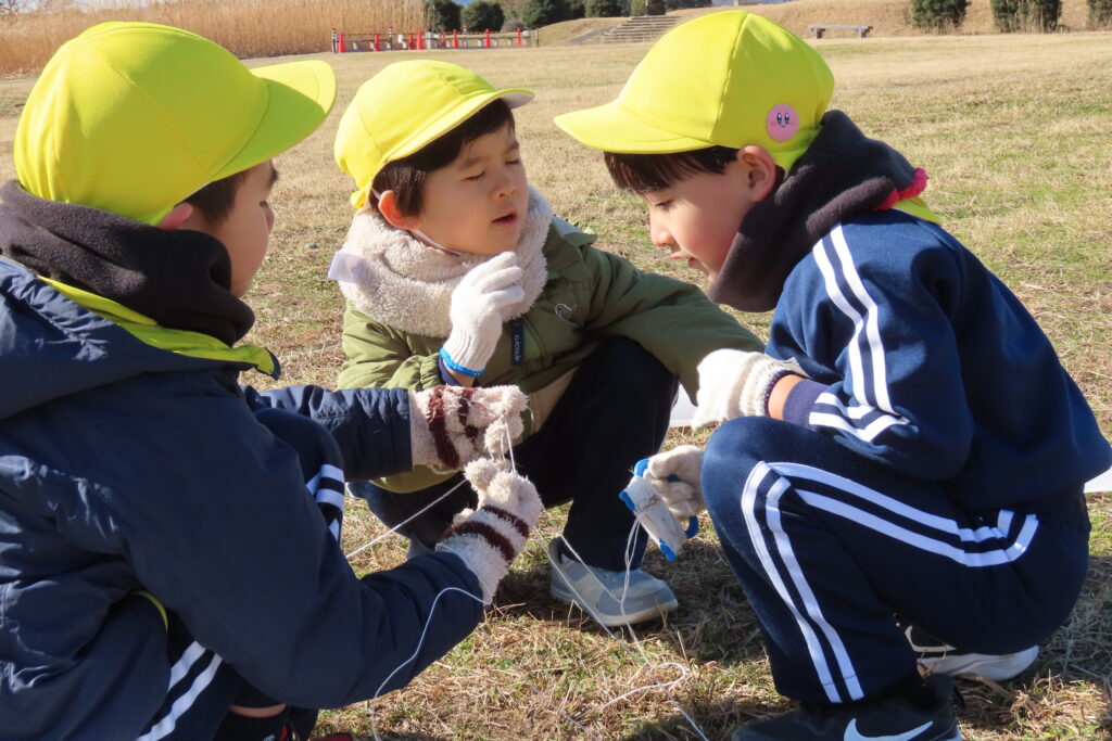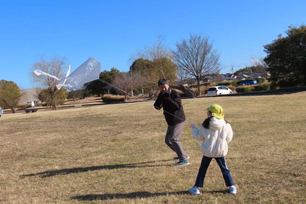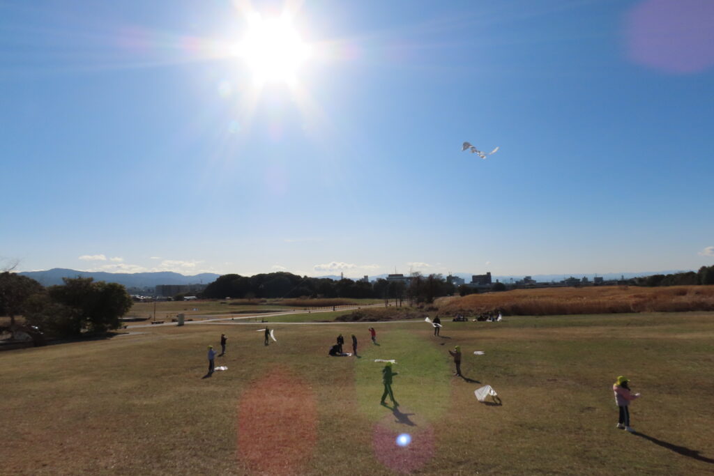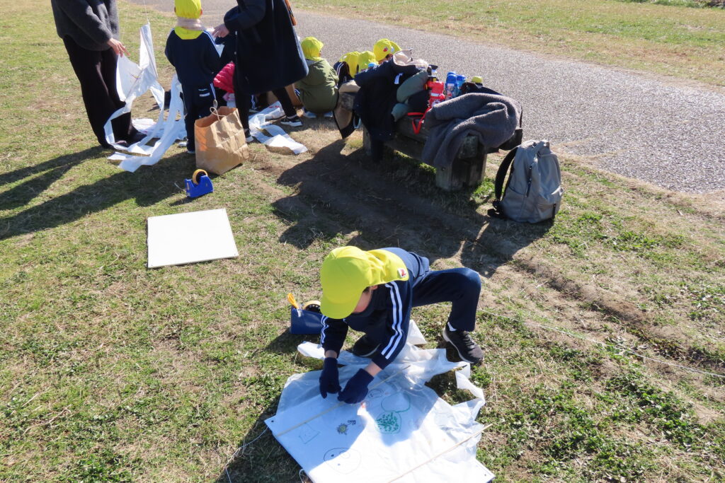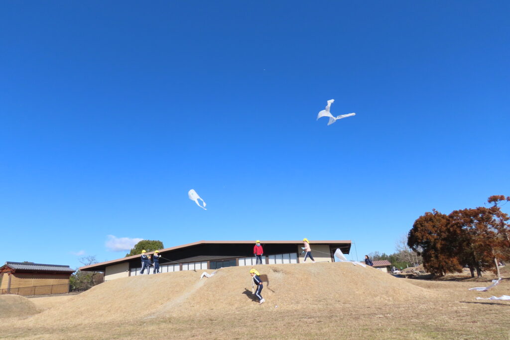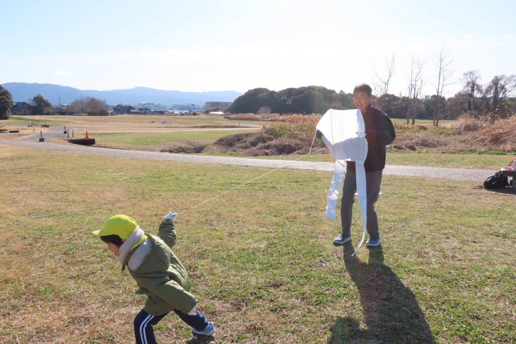 微風を捉えて、空高く揚がる凧もありました。そんな子どもたちが頑張っている様子です。