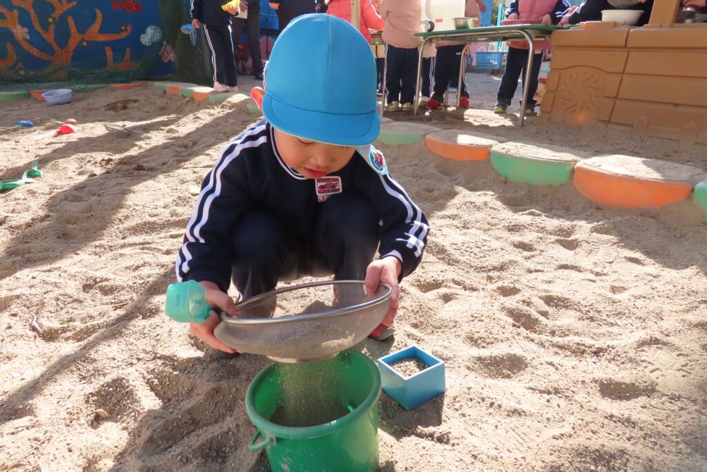 砂場の砂をふるいにかけて…。「なにつくってるの?」と聞くと、