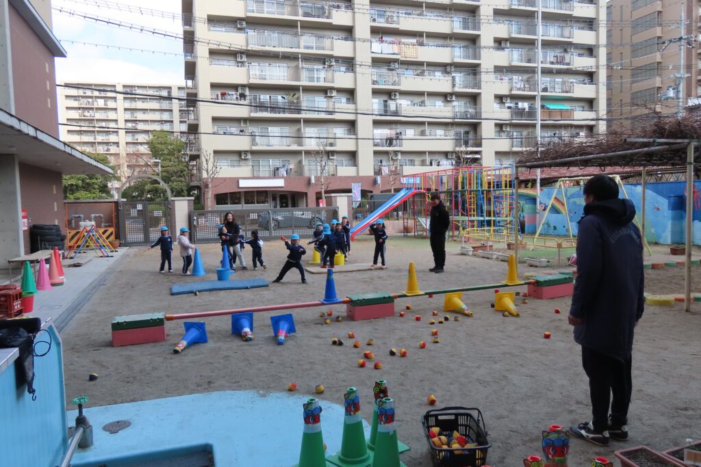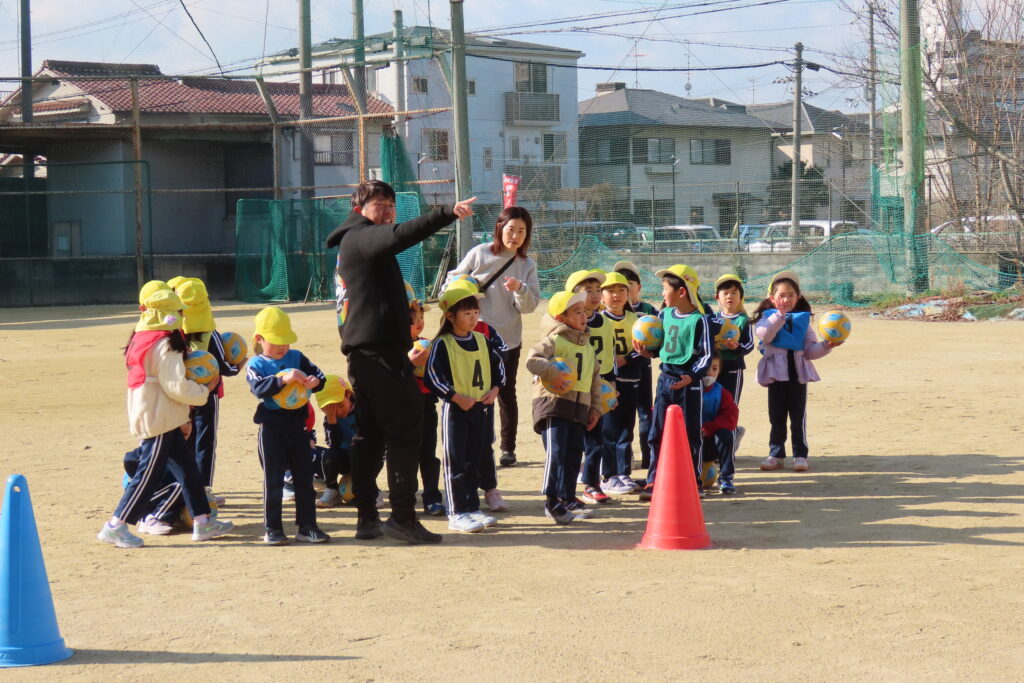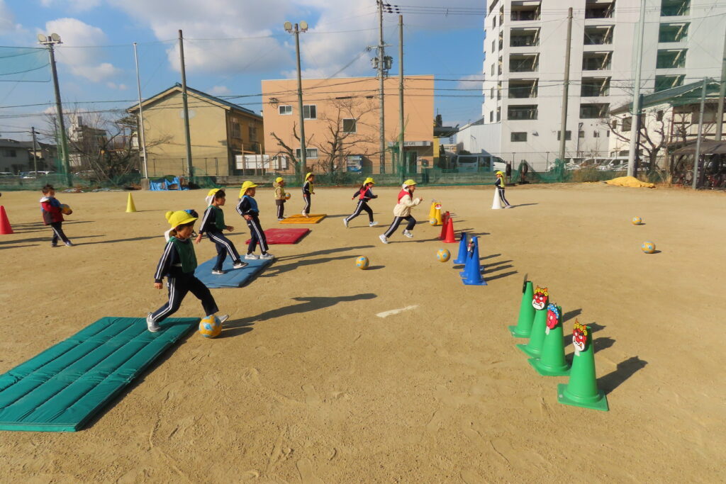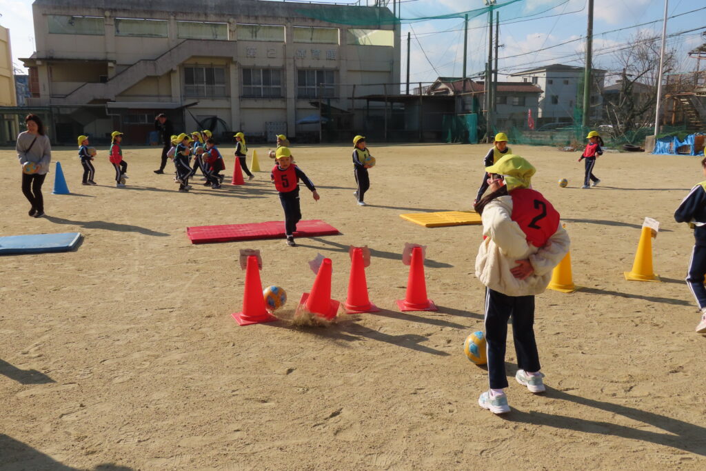 年長「つき組」さんは高校のグランドで体育教室。鬼さんコーンめがけてキック!4チームに分かれ、4色のゼッケンをつけて競争していました。