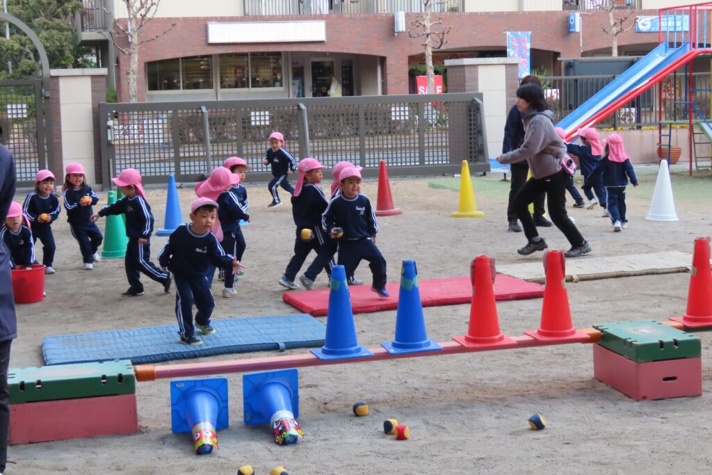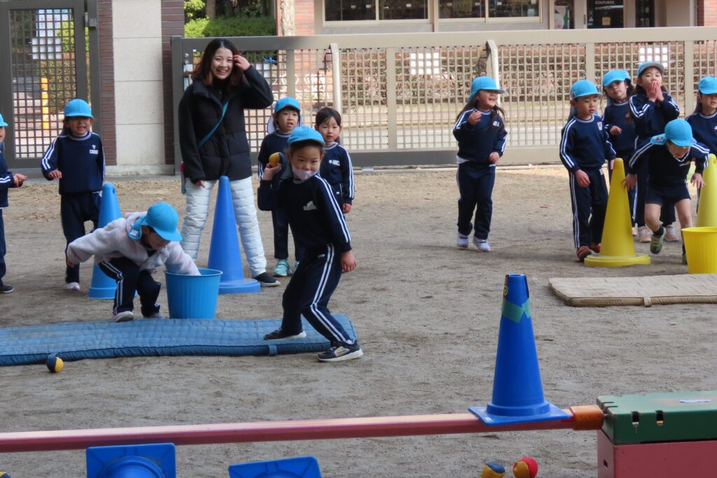 年中「ほし組」さんと年少「さくら組」さんは園庭での体育教室です。こちらは鬼さんコーンめがけてボール投げ。距離を変えての挑戦です。