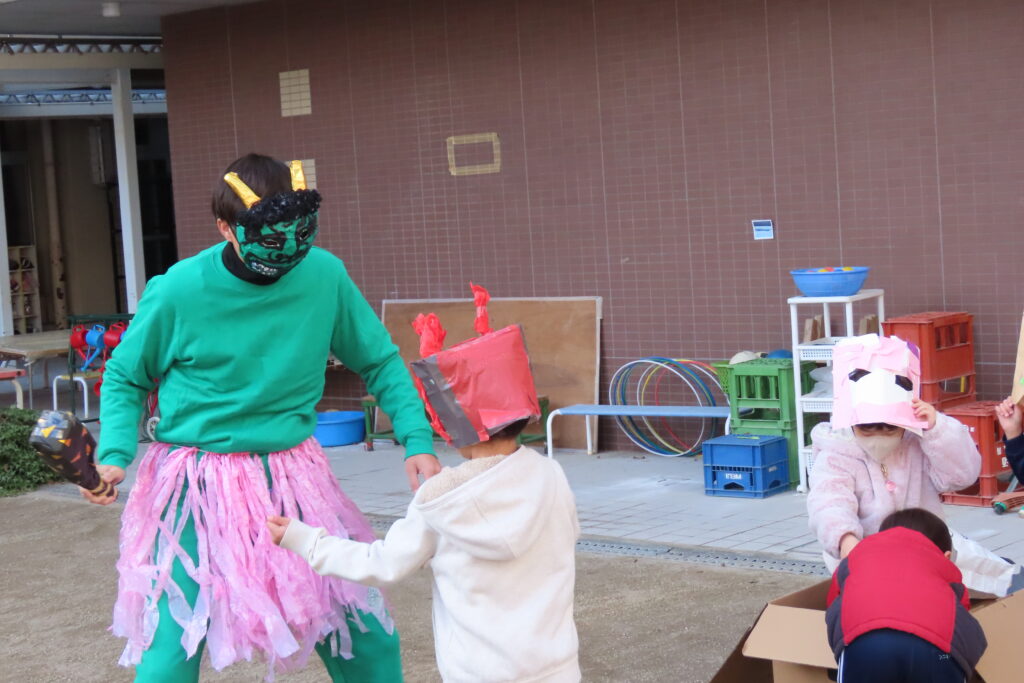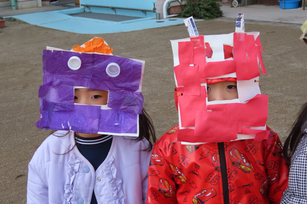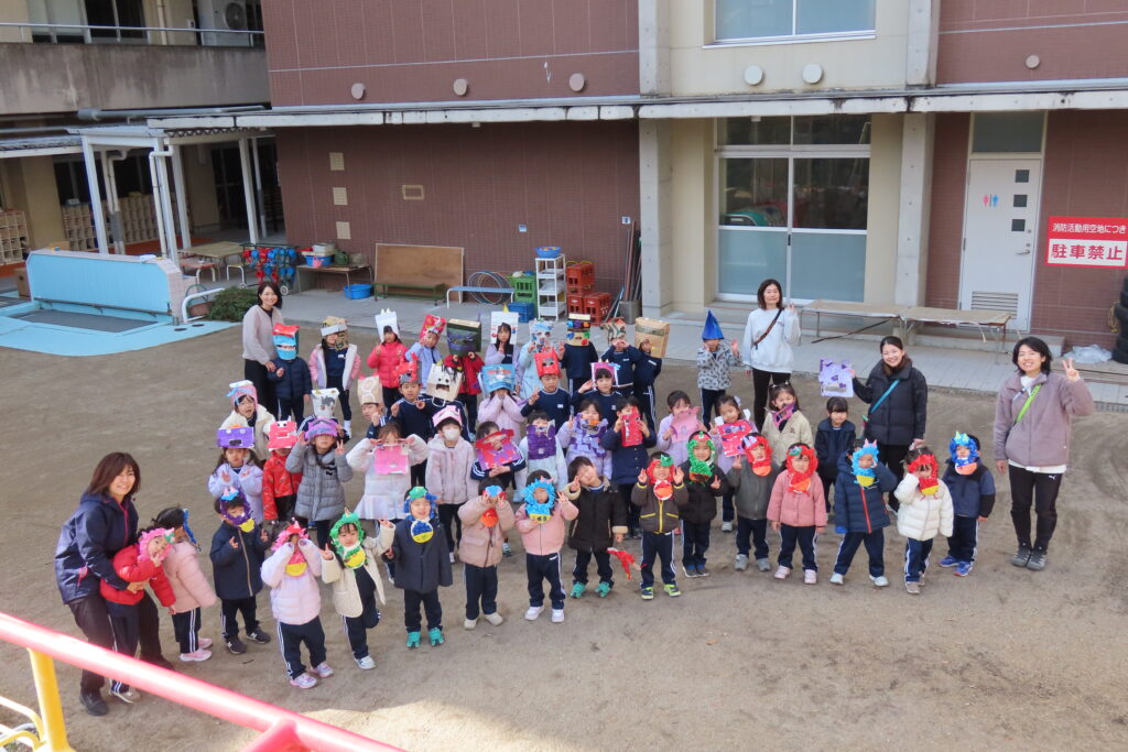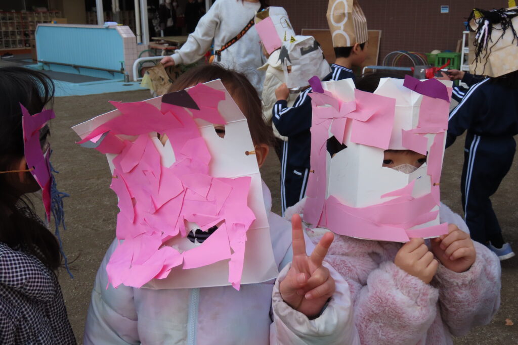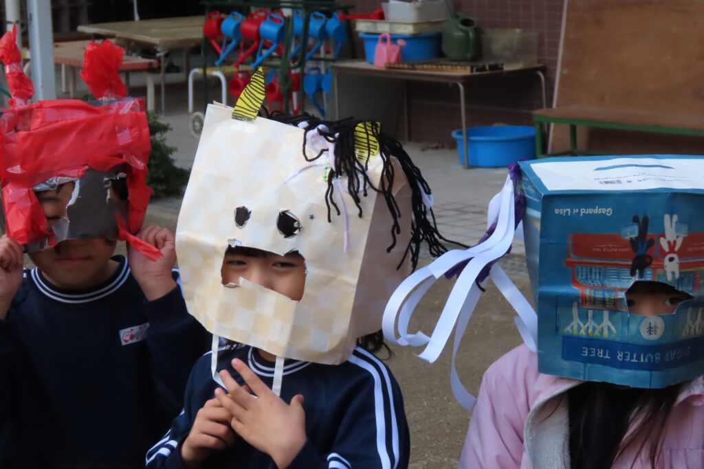今日は節分。豆まきの日です。子どもたちは自分が作った鬼の面をつけて園庭に集合。まずは記念写真の撮影から豆まきが始まりました。