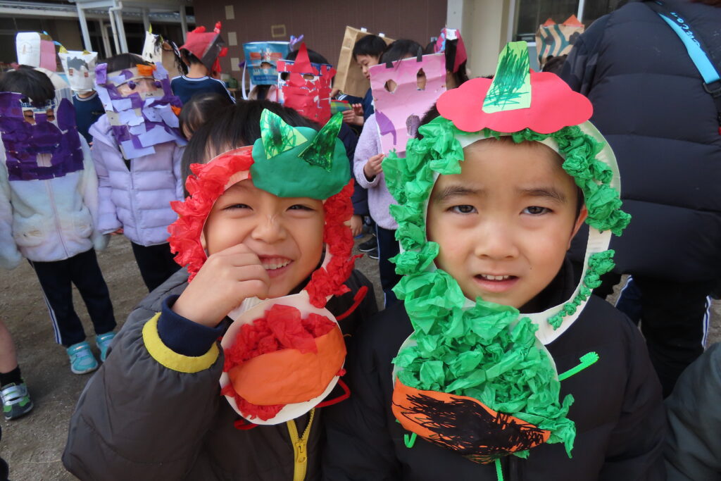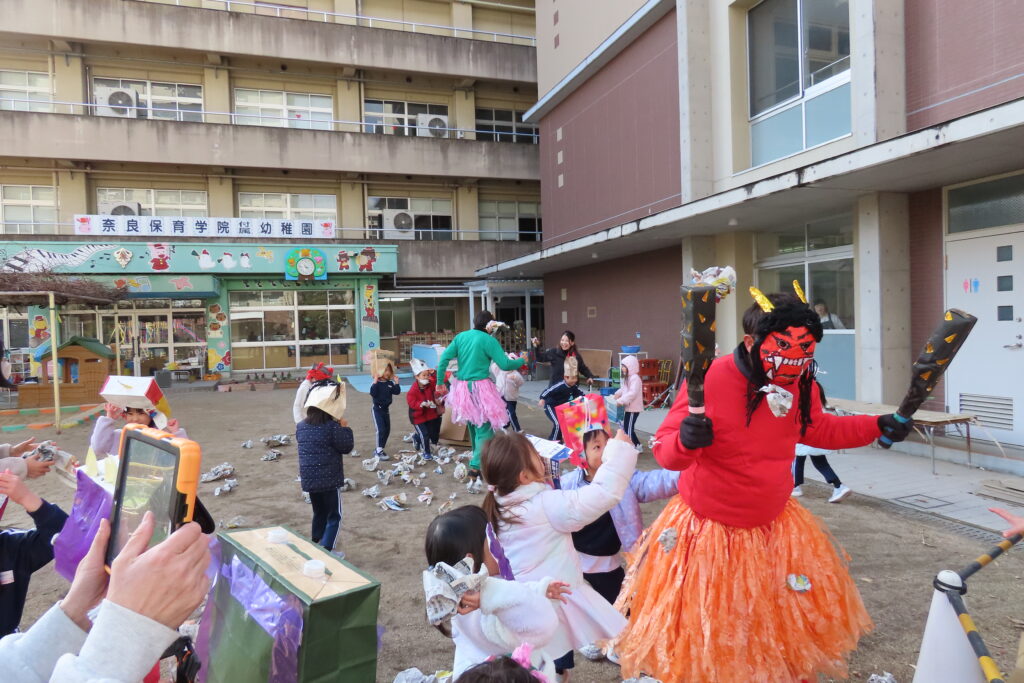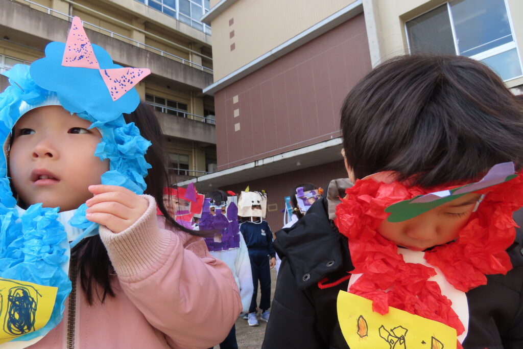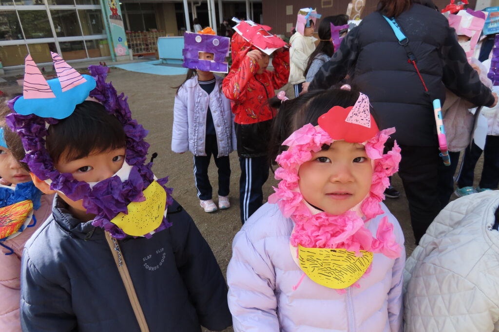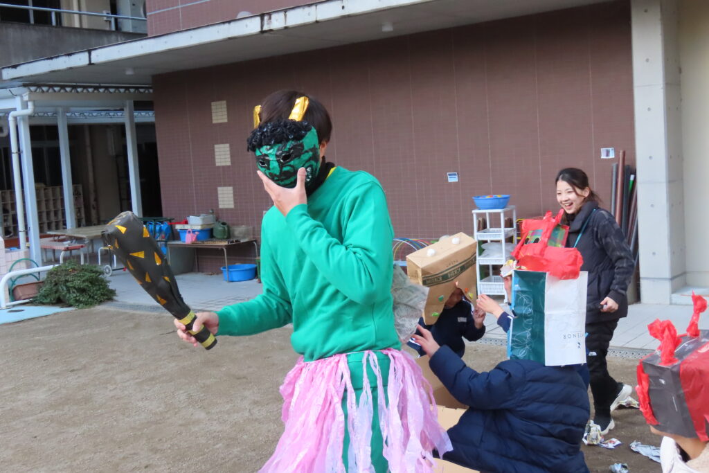 今日は節分。豆まきの日です。子どもたちは自分が作った鬼の面をつけて園庭に集合。まずは記念写真の撮影から豆まきが始まりました。