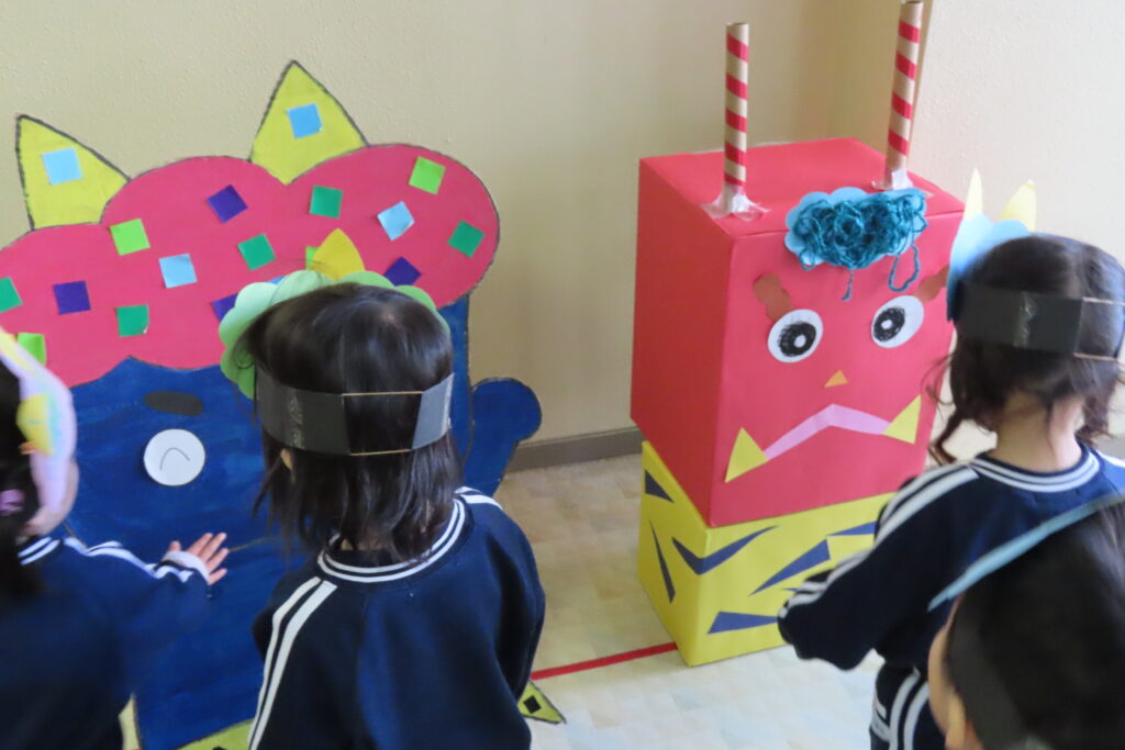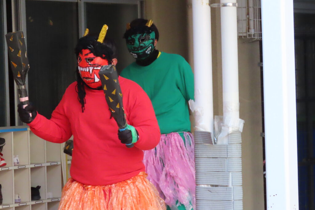 ちなみに、「りんご組」さんは、それぞれの保育室でこんな赤鬼・青鬼さんに「鬼は外!」と豆まきをしました。